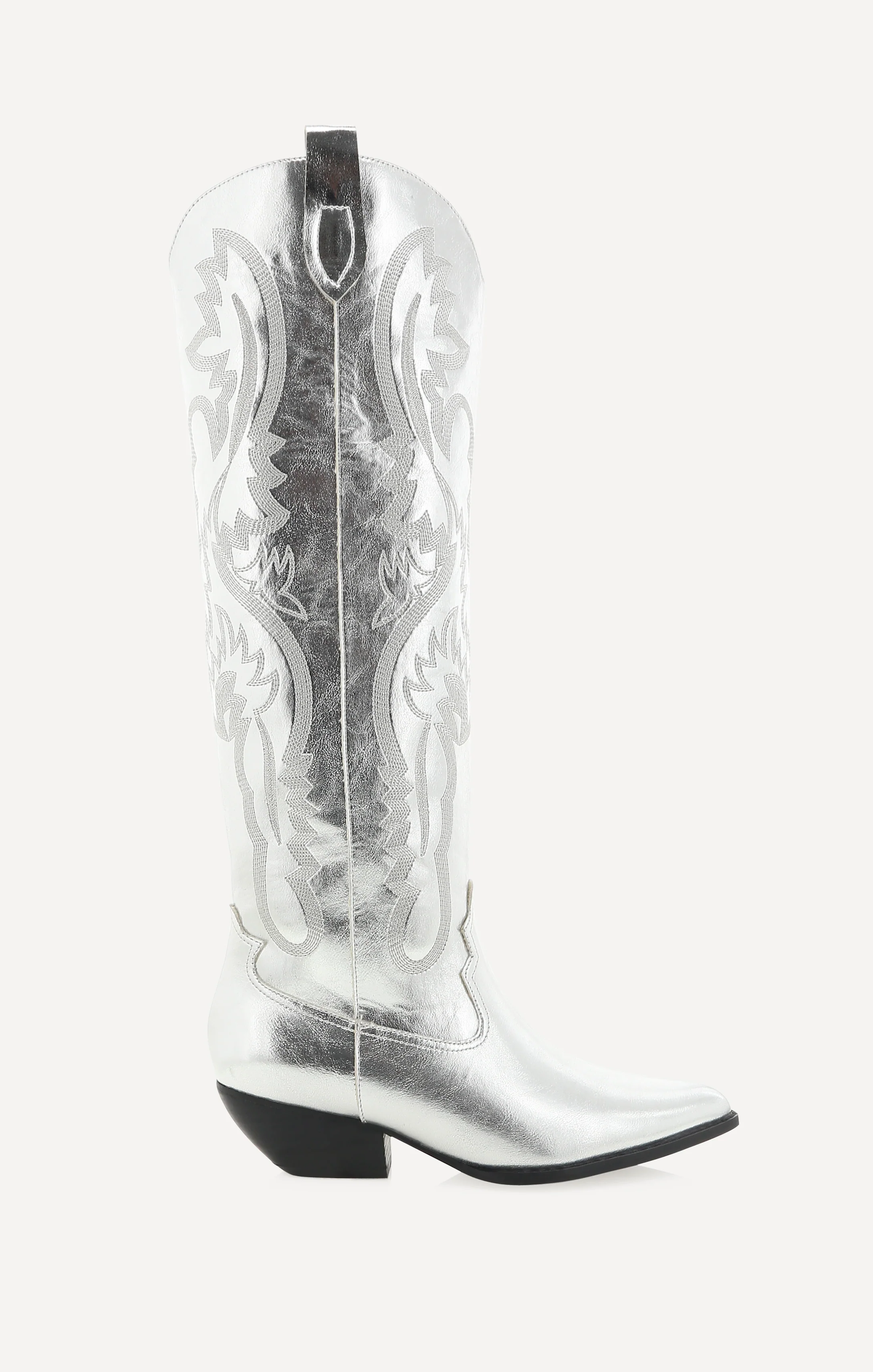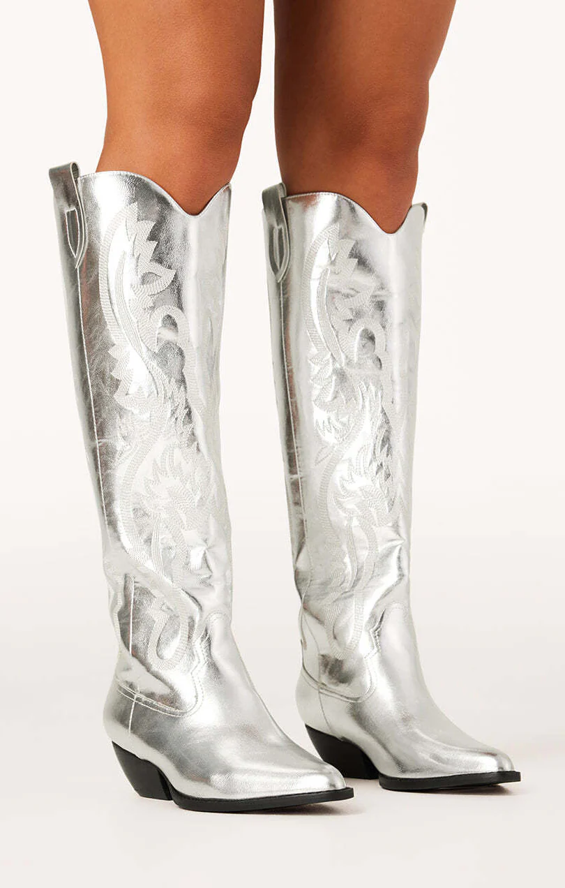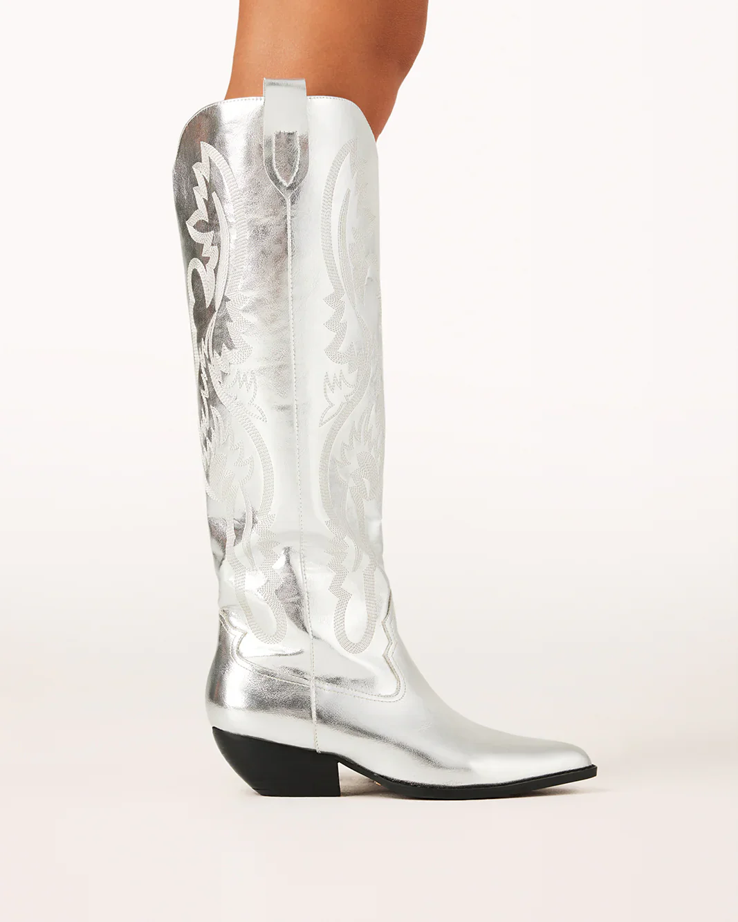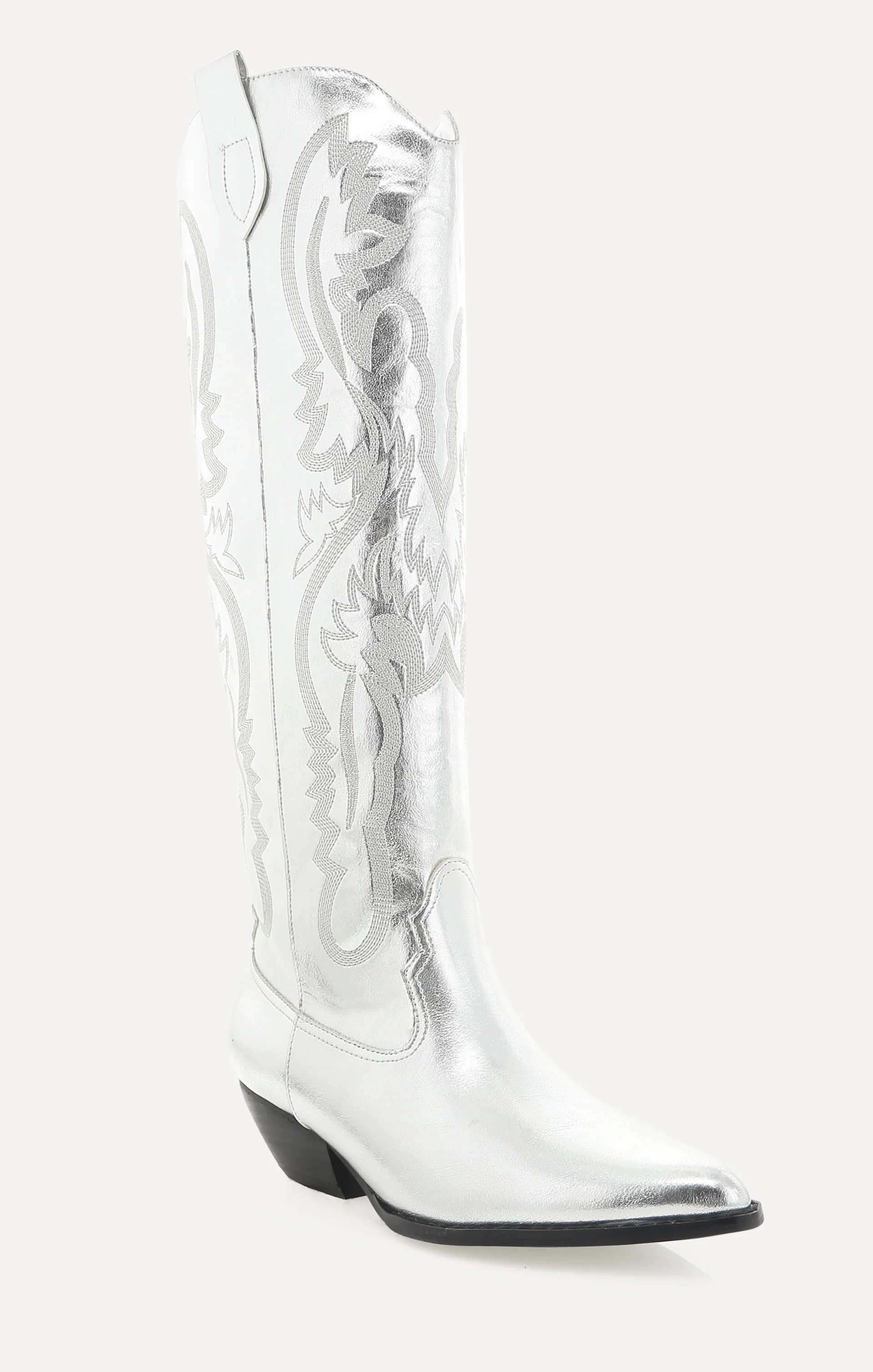 A statement long boot with a classic western silhouette, featuring a silver color and modern design.