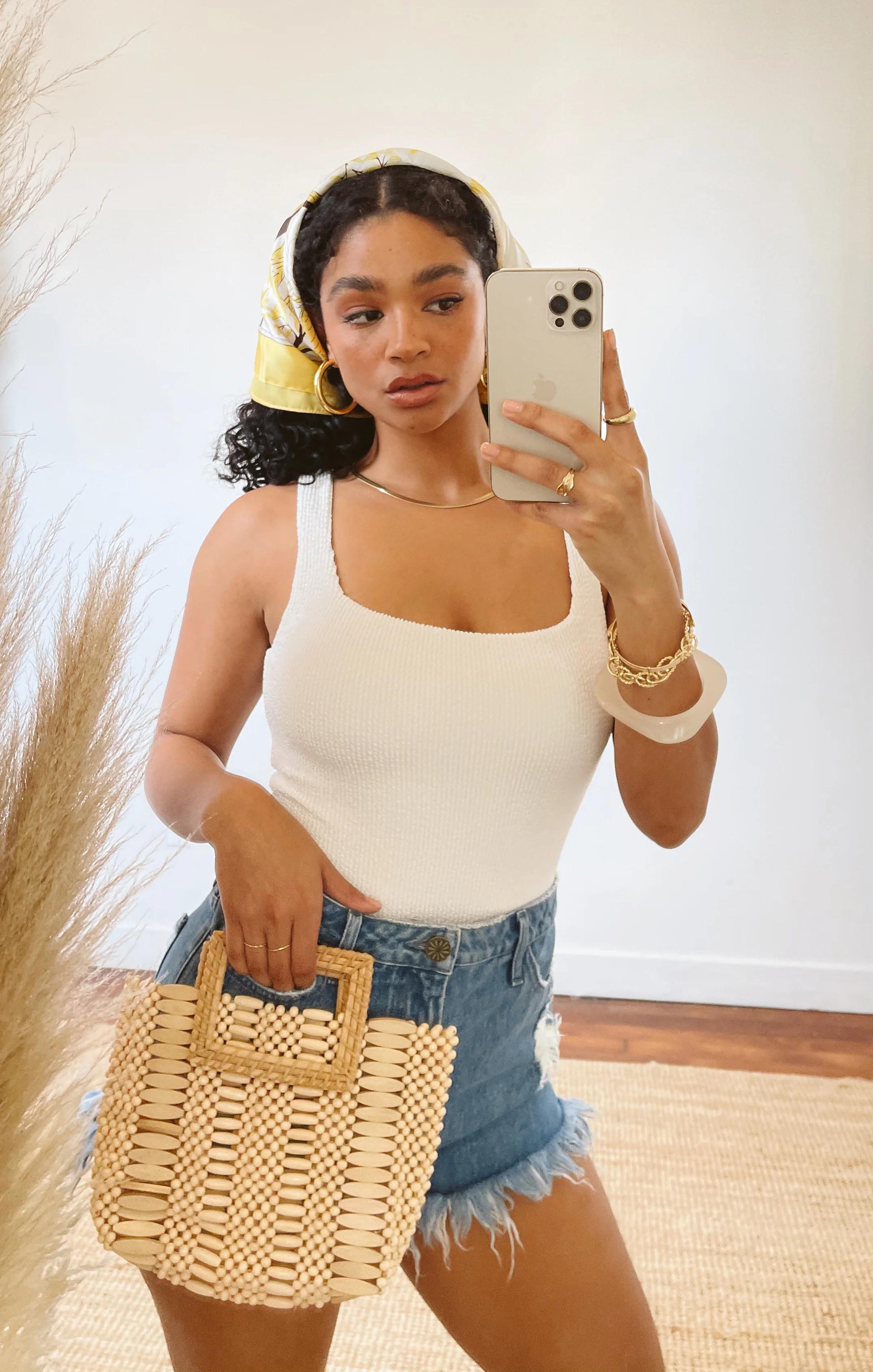 DetailA versatile accessory designed to complement your style, featuring a golden hoop at the top for an elegant poolside look.