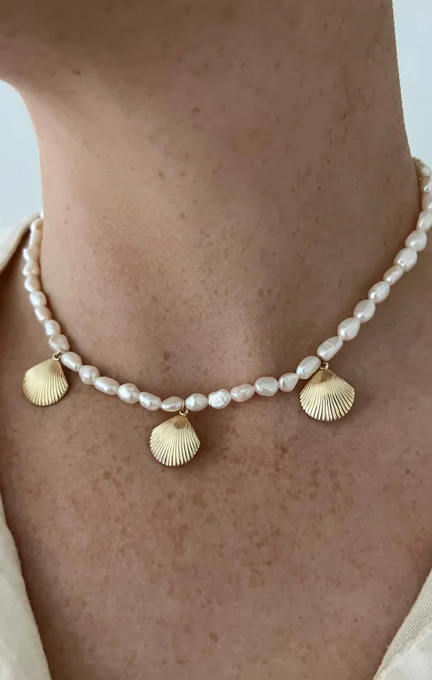 A freshwater pearl necklace with textured gold-filled shell charms, perfect for all your vacation looks.
