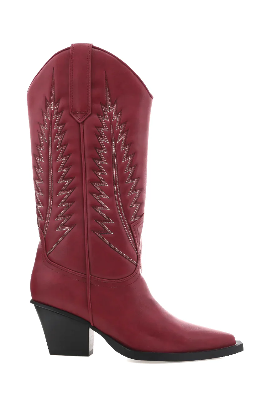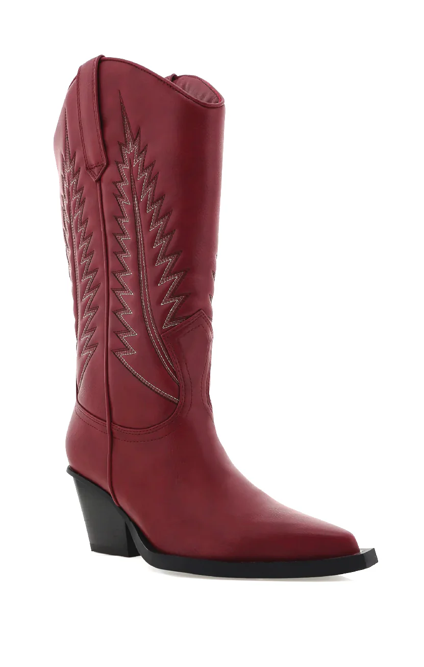 A chic mid-calf cowboy boot with bold contrast details, featuring a classic western charm for a standout look.