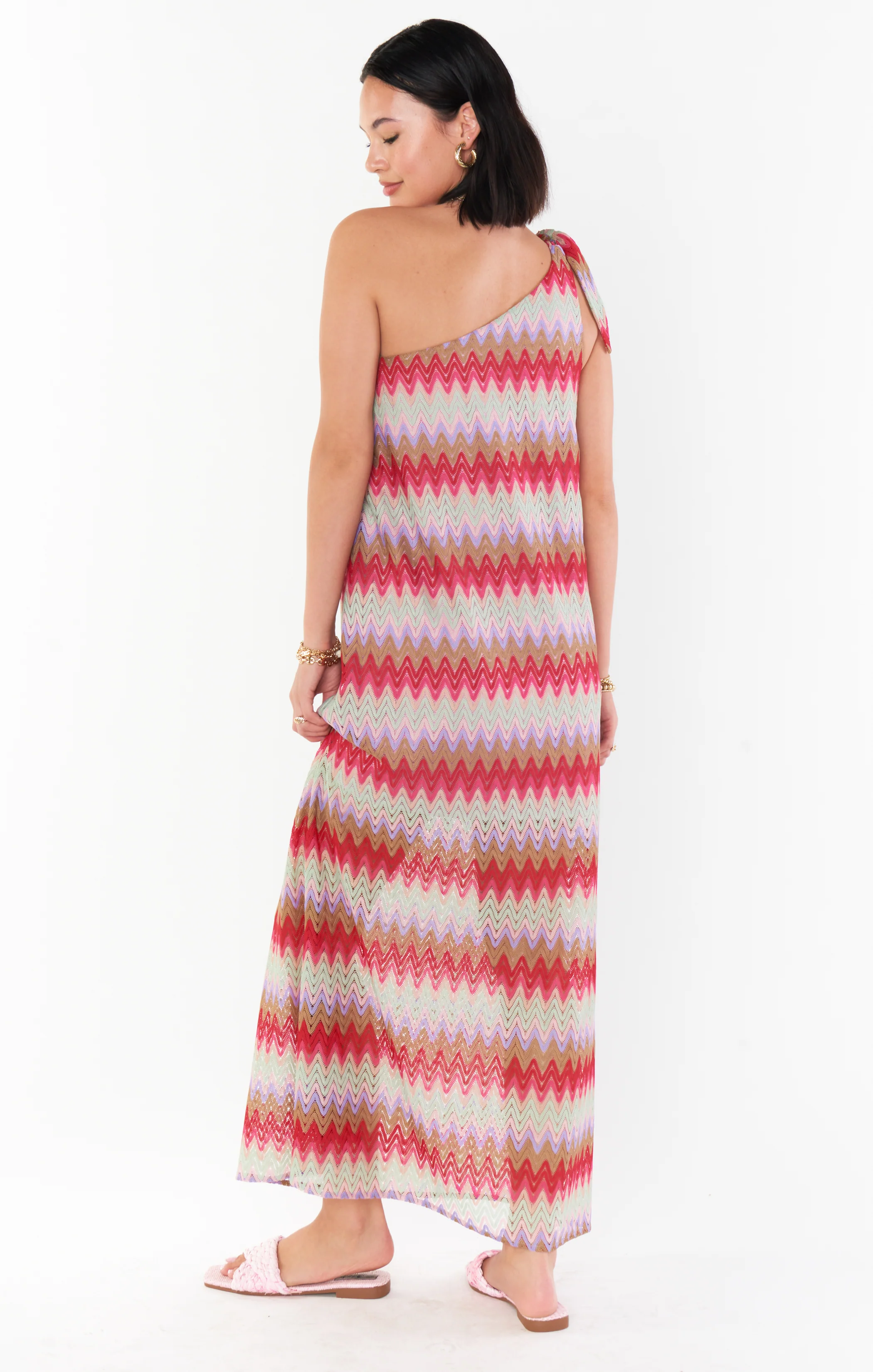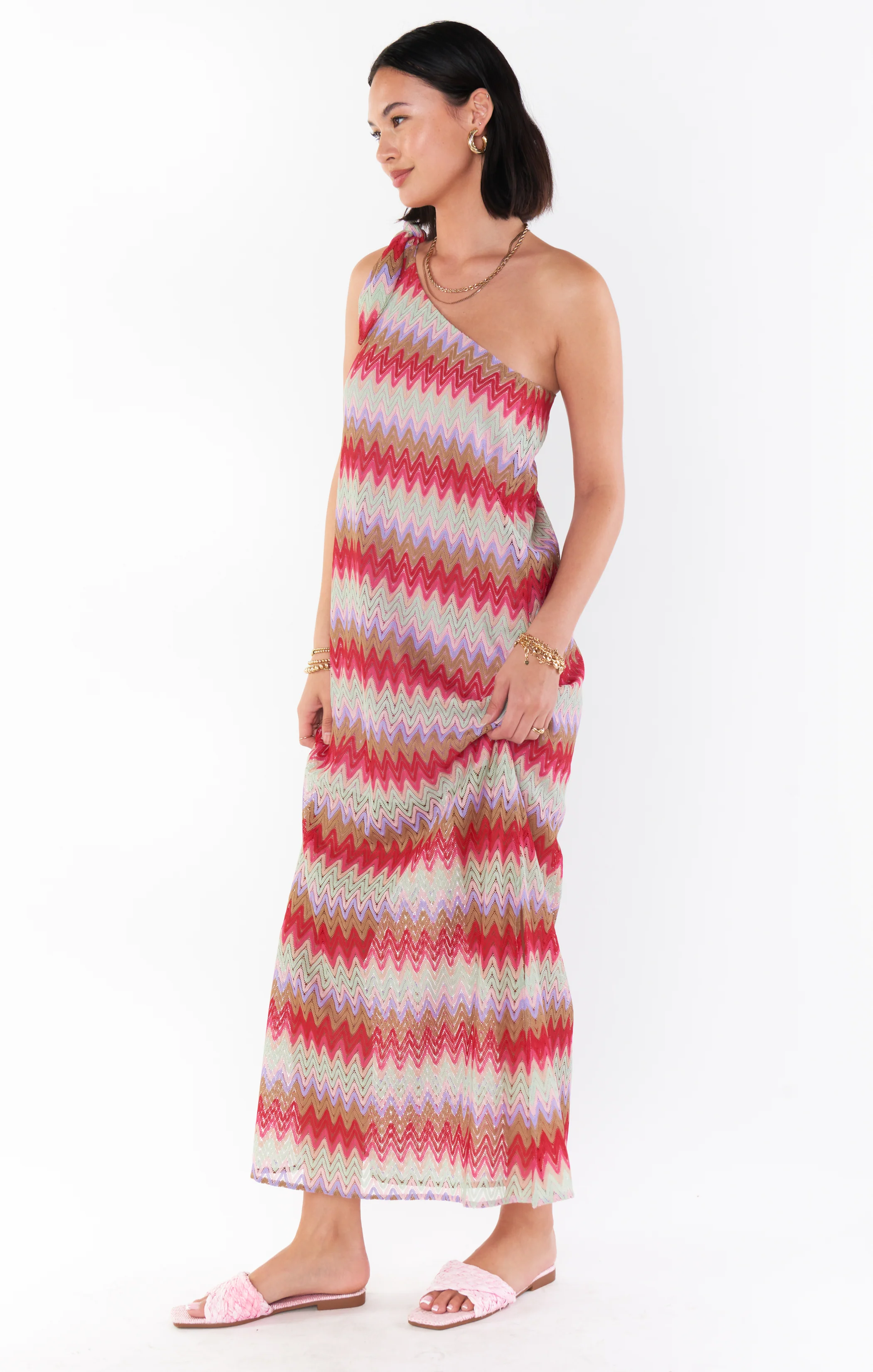A one-shoulder flowy dress with a lightweight breezy fabric, perfect for beach coverups or elevated events.