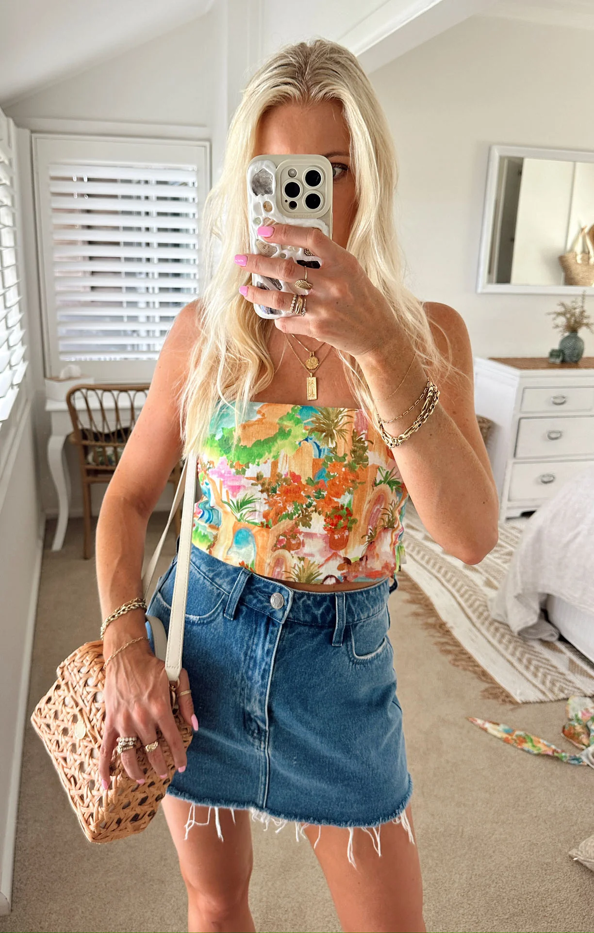 A warm weather crop top with a square neck and dainty straps, paired with the matching Iva Skirt for an effortless look.