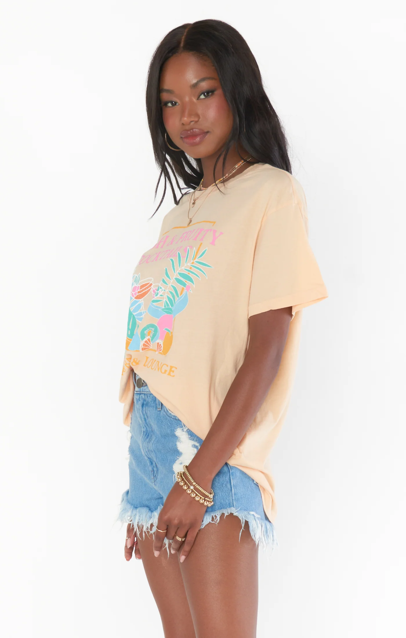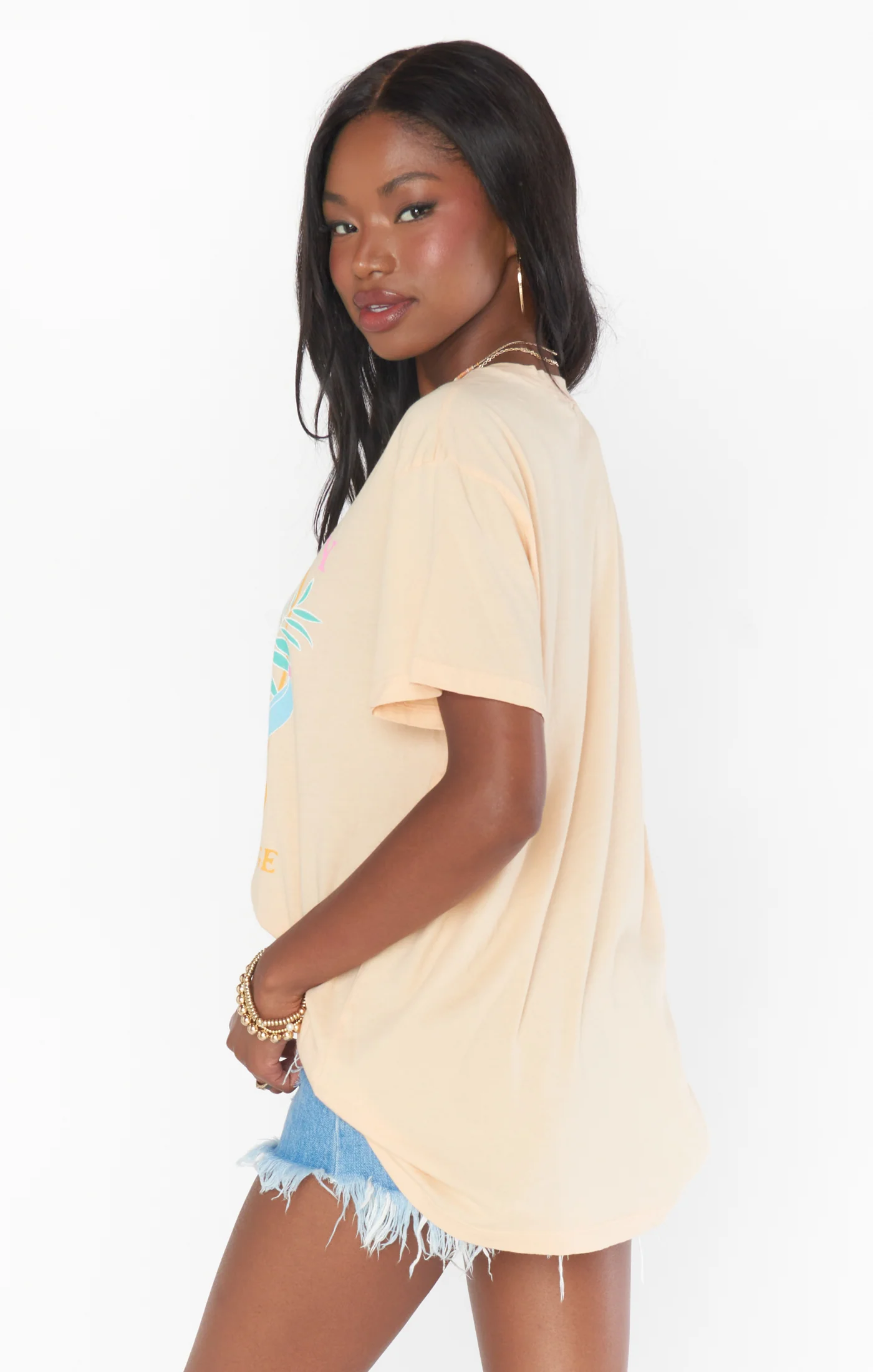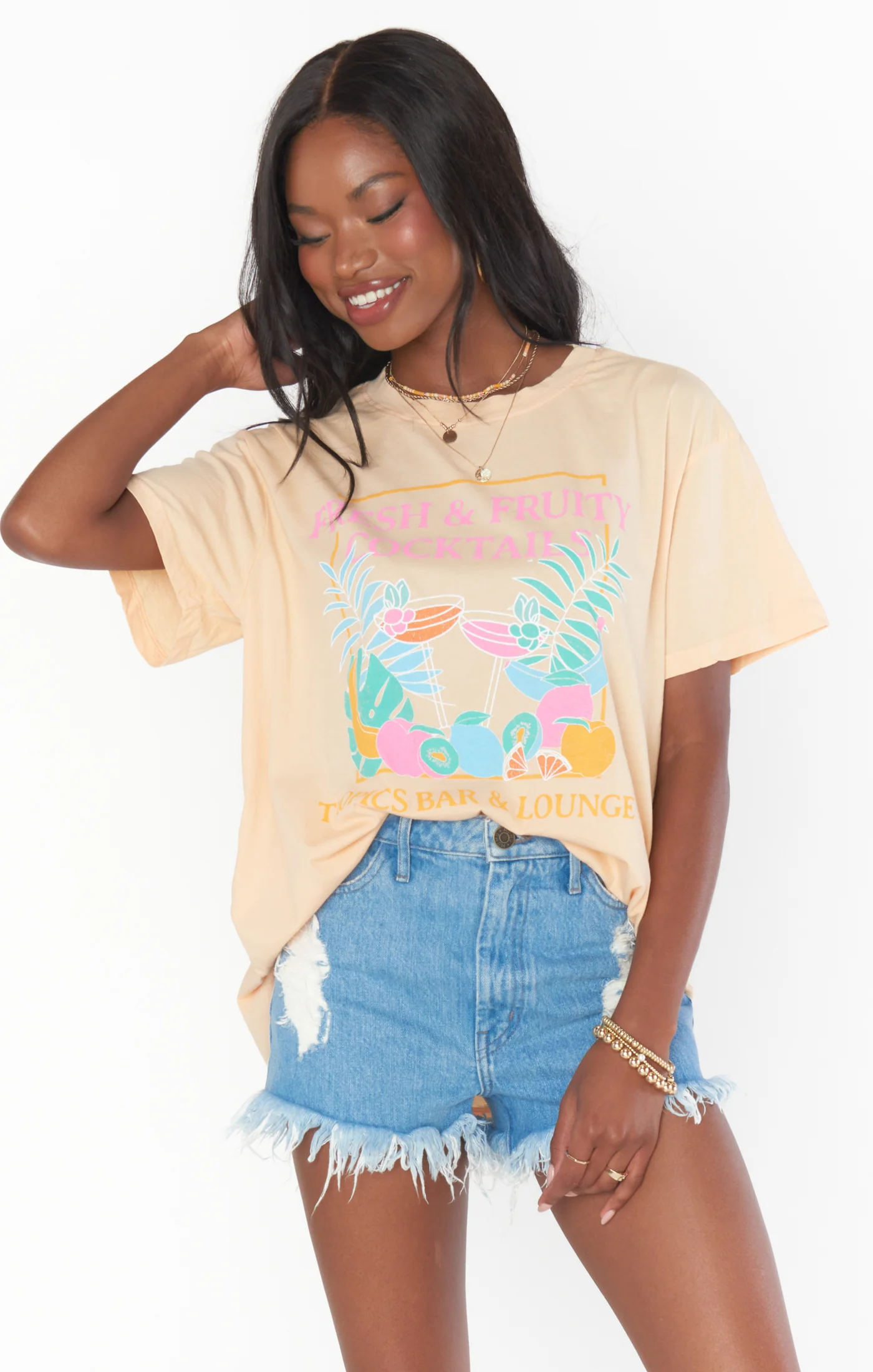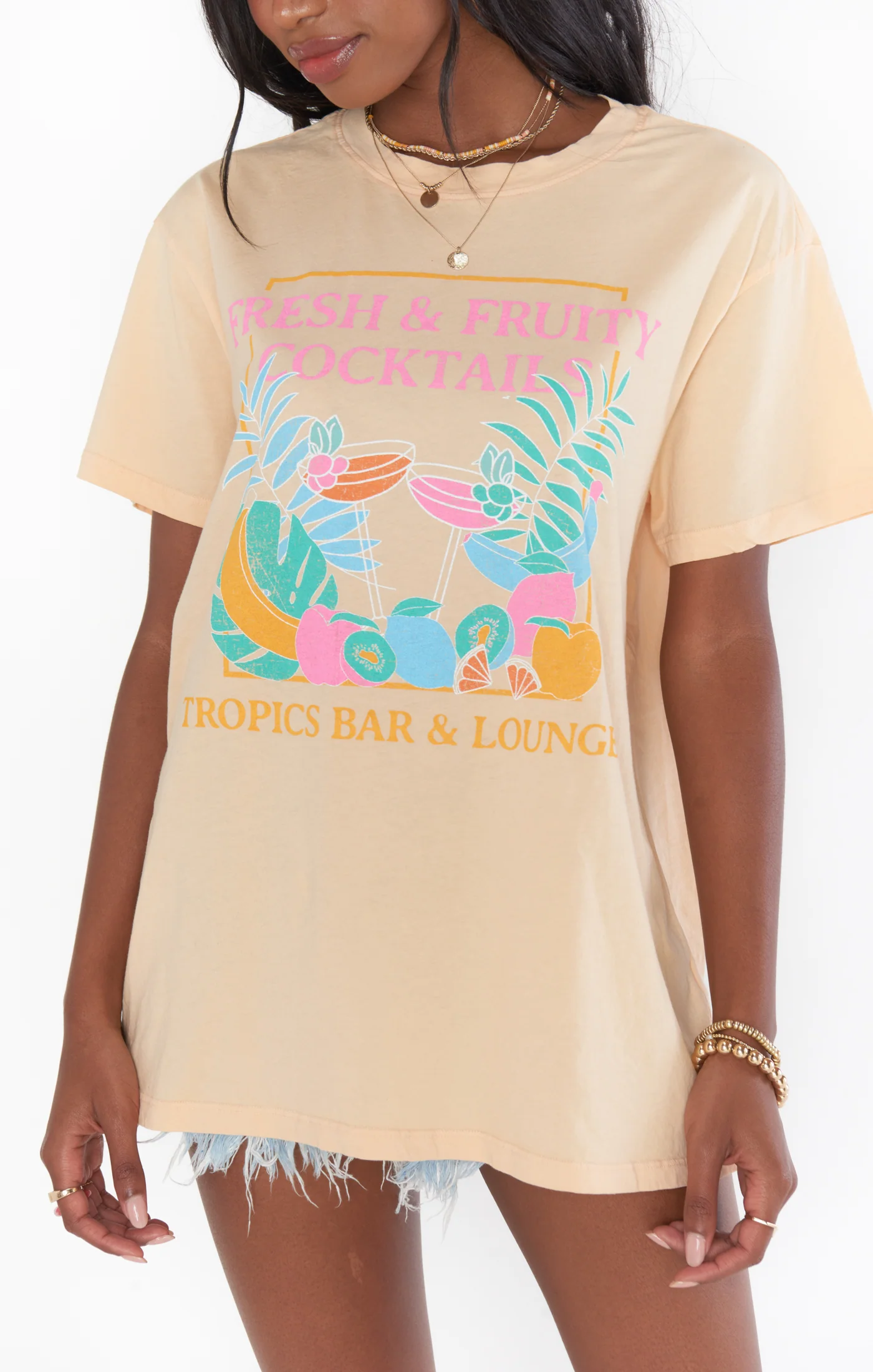 A stylish, oversized-fit tee with a tropical fruit graphic, perfect for poolside relaxation. Pair it with your favorite Mumu blues to enjoy a vacation.