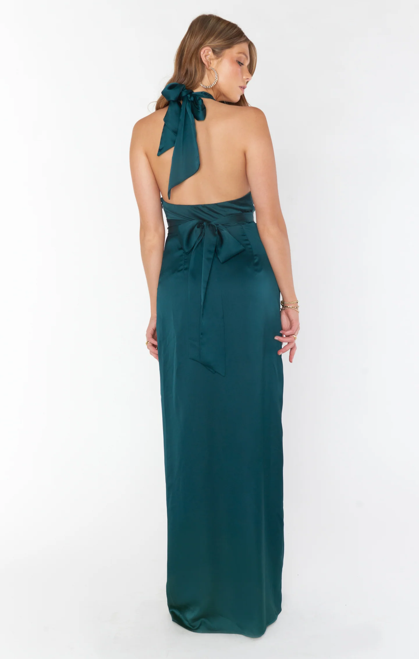 Luxe satin dress with a detachable sash and side slit, ideal for event occasions. It features a halter wrap neck and sultry backless design.