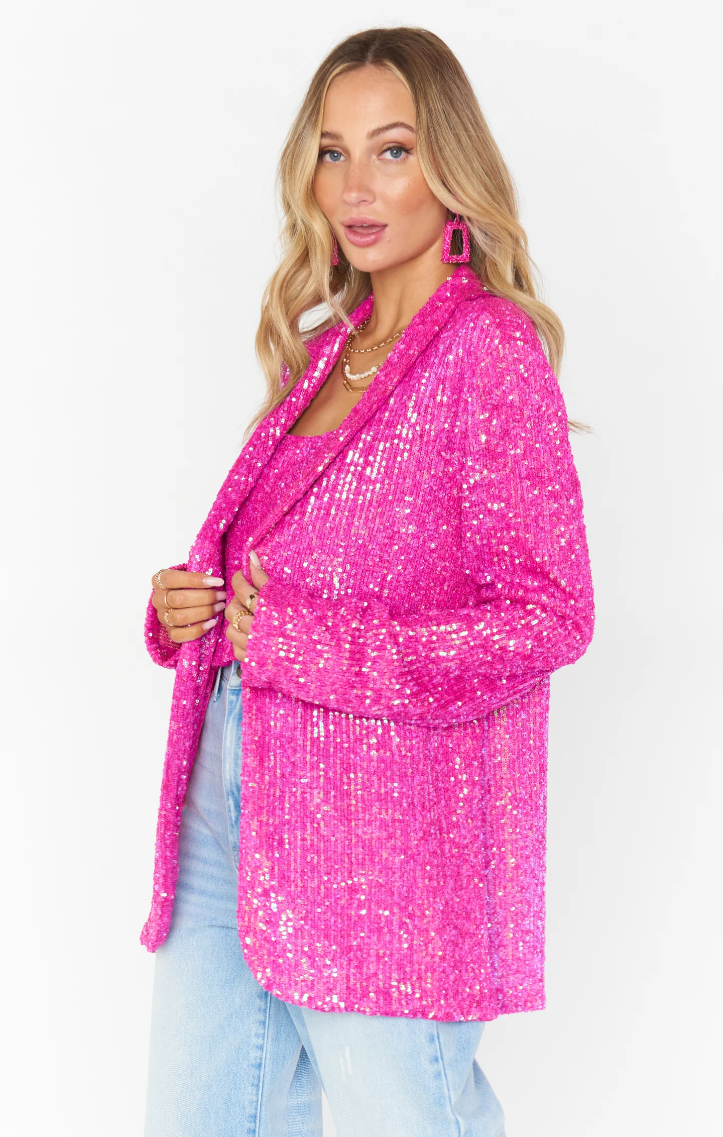 A layered blazer in hot pink with sequins, featuring a button and a denim or Tara Crop Top-inspired look for an event-ready outfit.