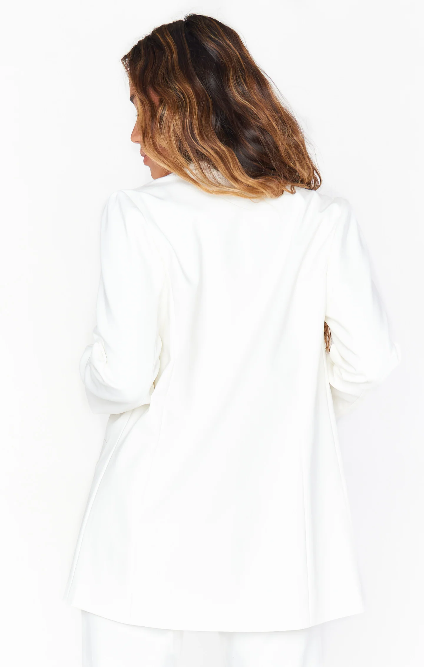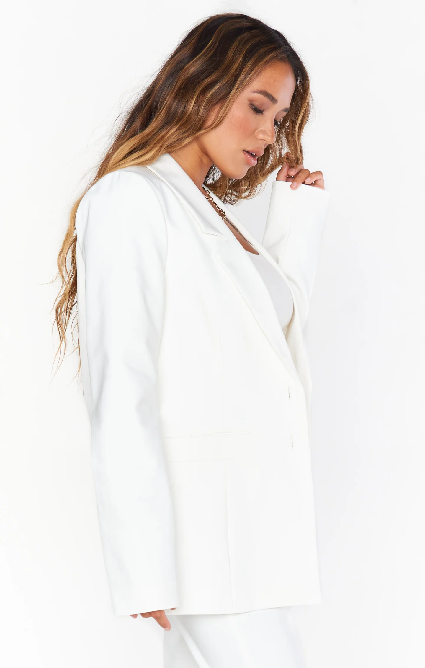 DetailA white suit for business and casual occasions. It features a flattering fit, classic notched collar, welt pockets, and a DJ flare design to add a stylish touch.