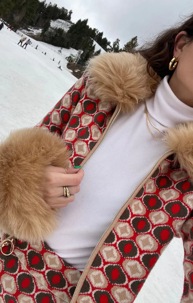 "name": "Zermatt Zip Up ~ Pink Geo Jacquard Faux Fur
