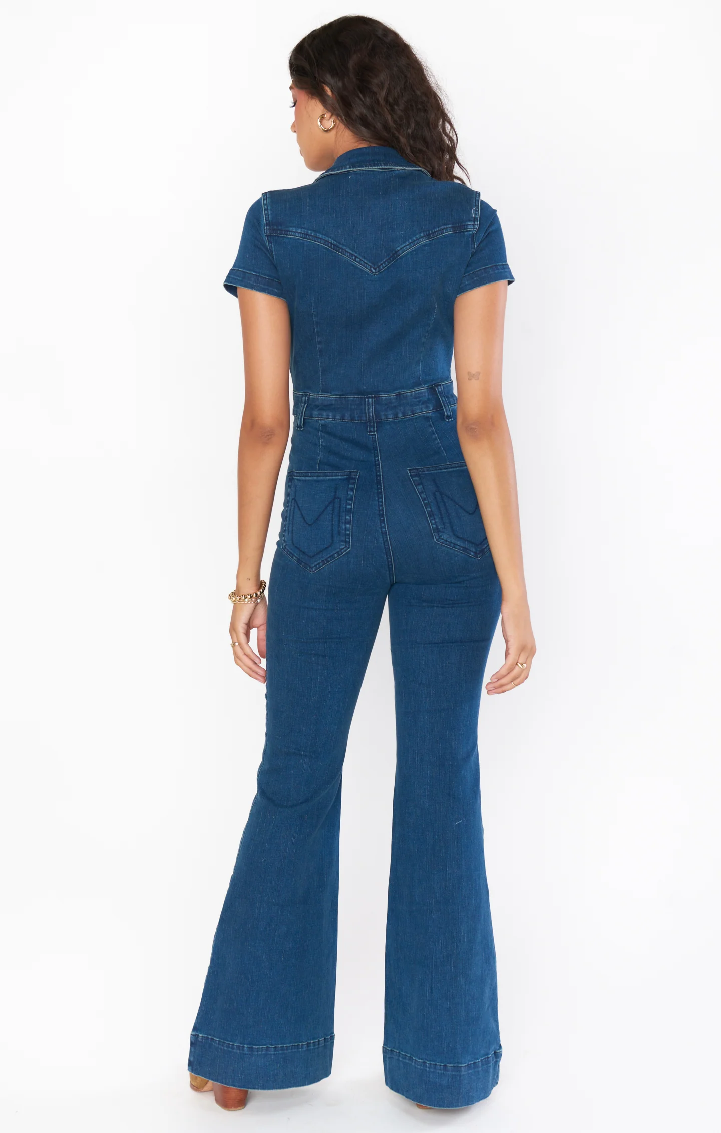 A denim jumpsuit with a bold, 1970s aesthetic and Everhart buttons. It is collared on the top and designed to pop without needing much accessory.