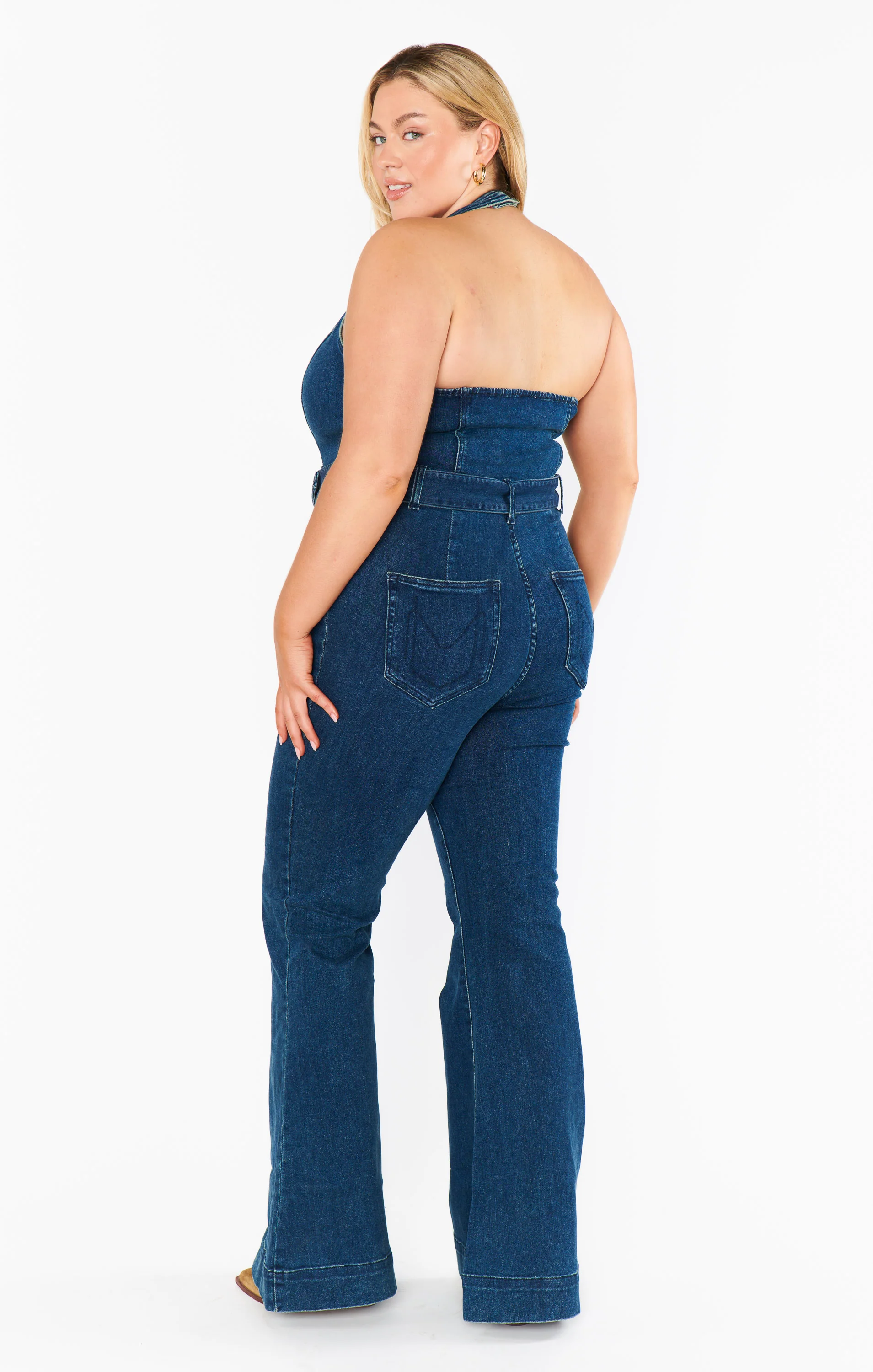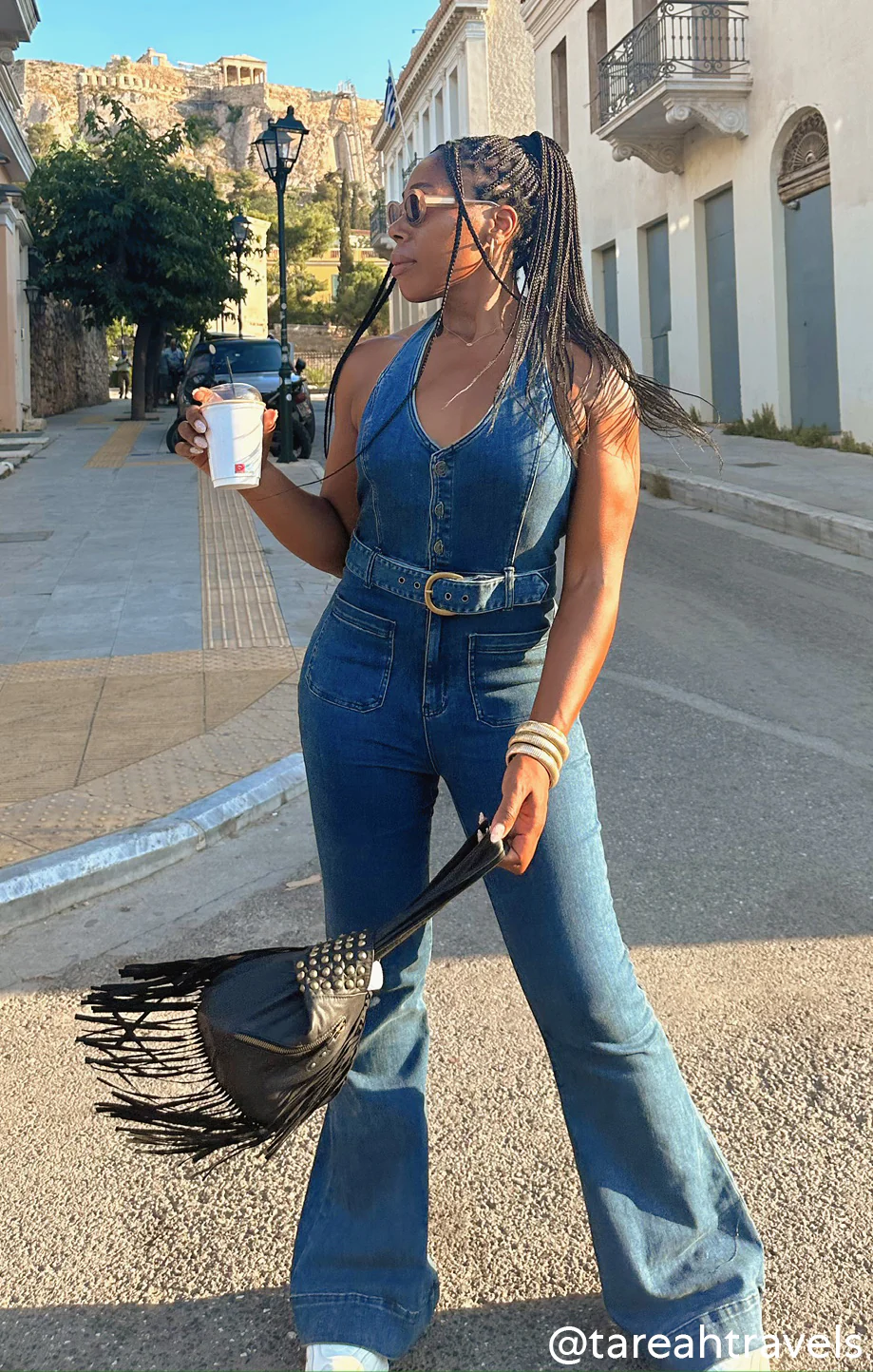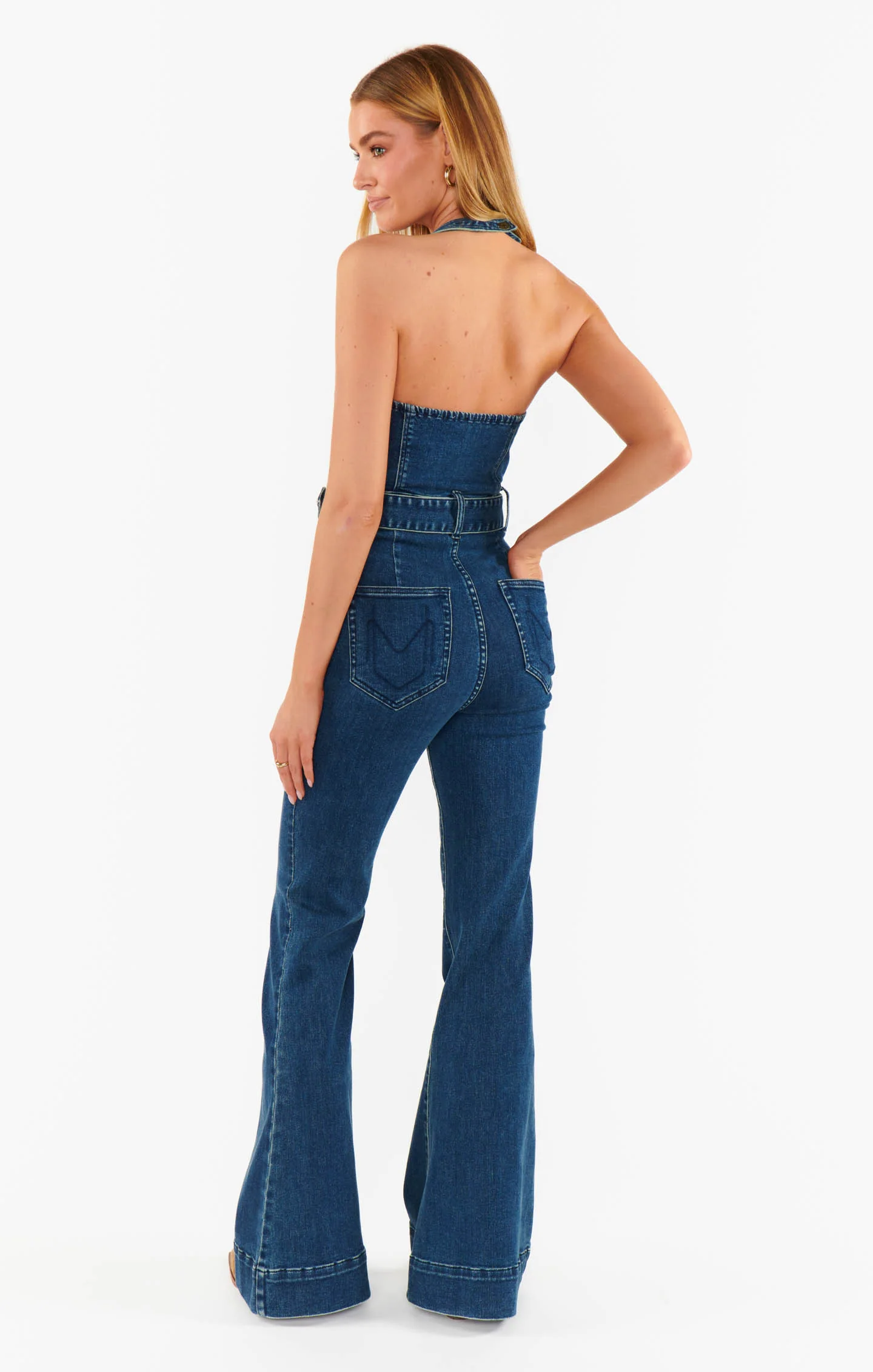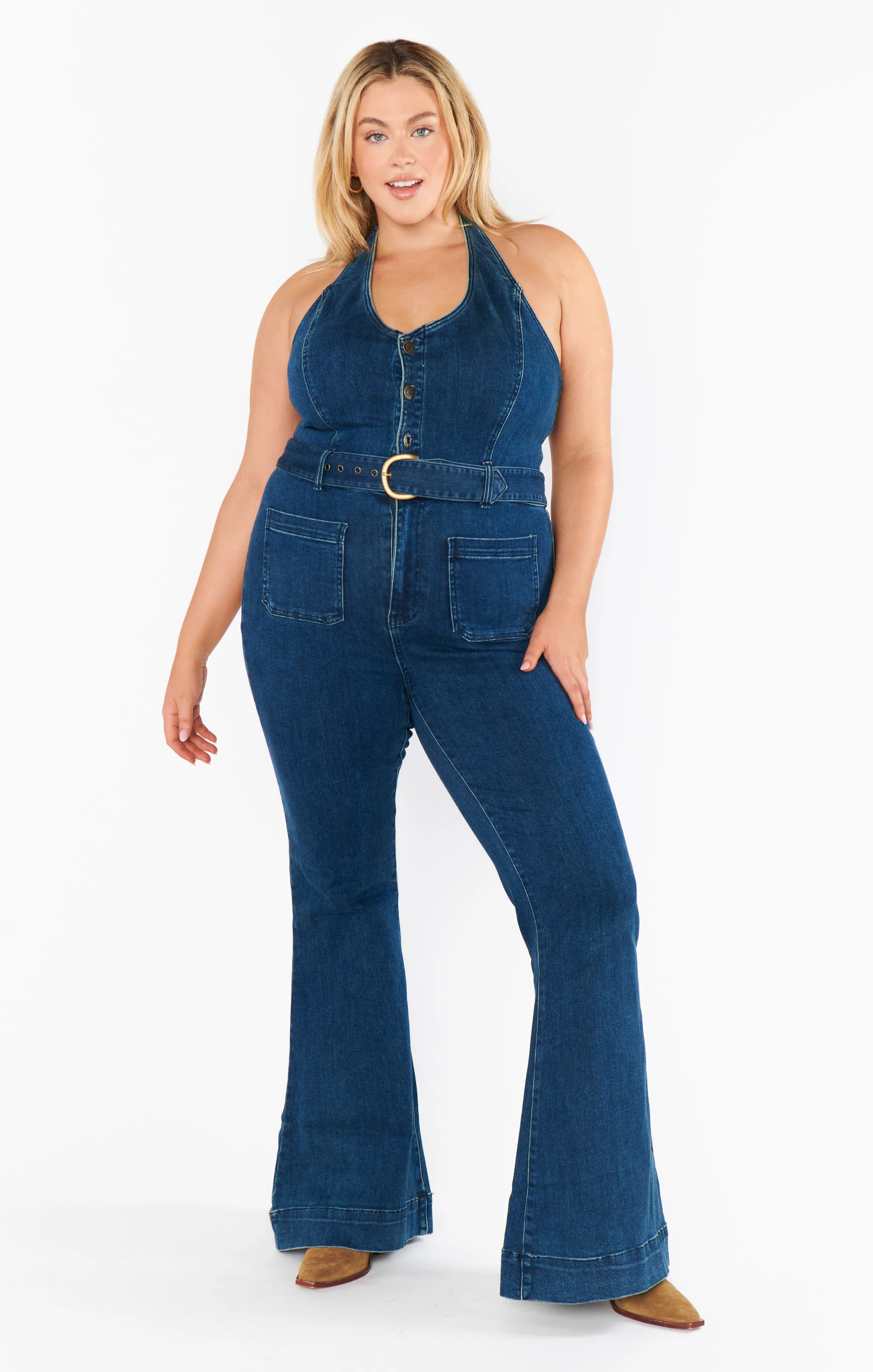 A 70s-inspired denim jumpsuit with a thick belted waist, perfect for pairing with boots and fun accessories for a stylish, casual look.