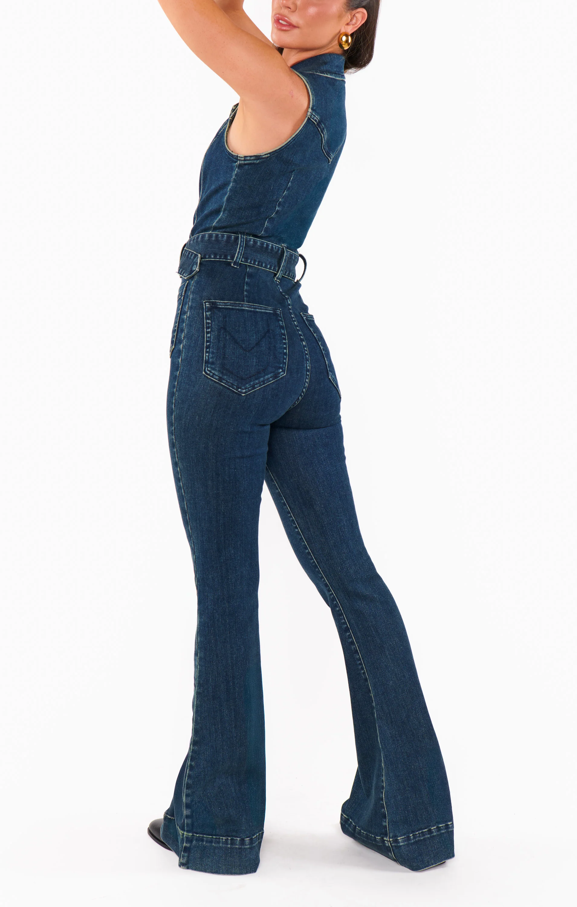 A 70s-style denim jumpsuit with a tight zip bodice, thick retro waist, wide leg design, and a slight stretch for optimal fit.
