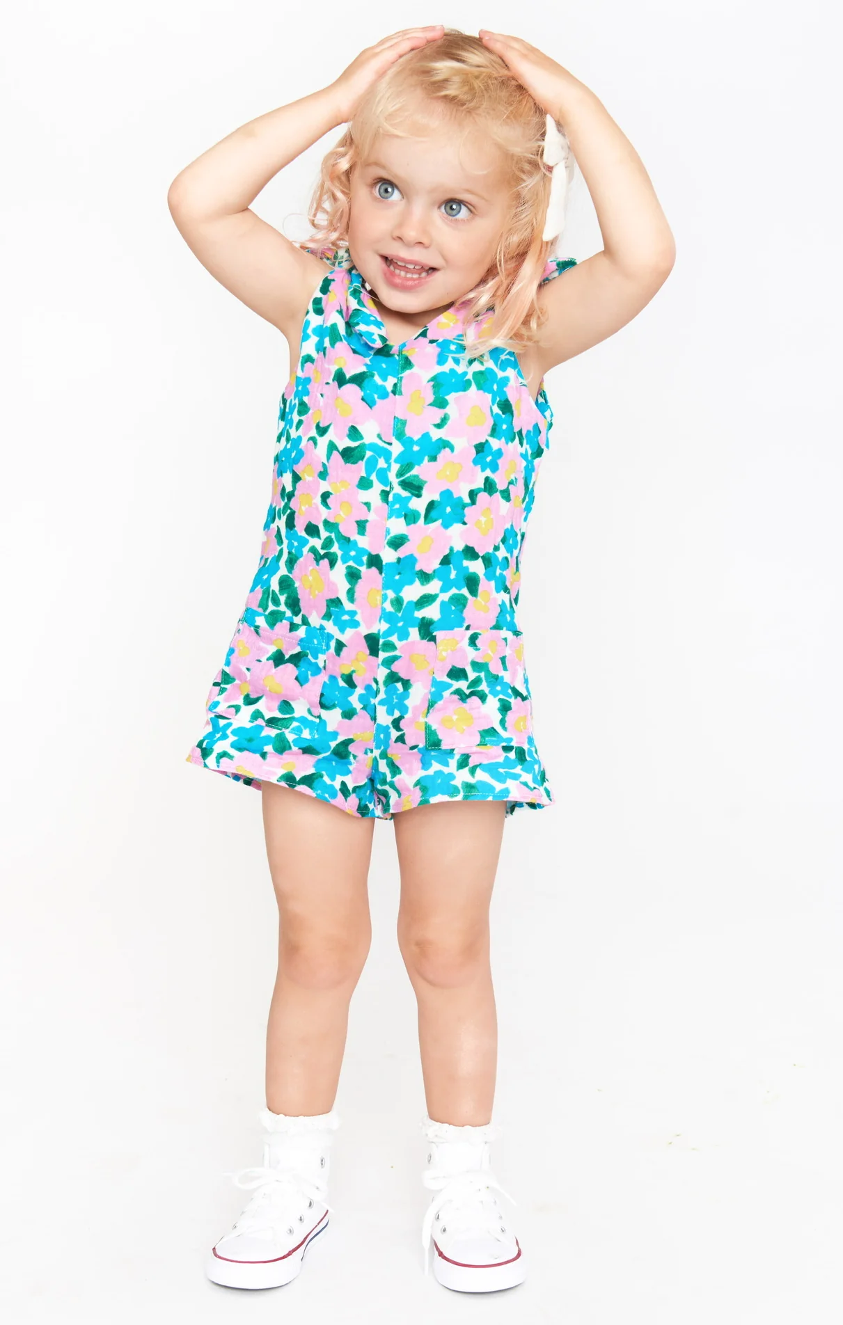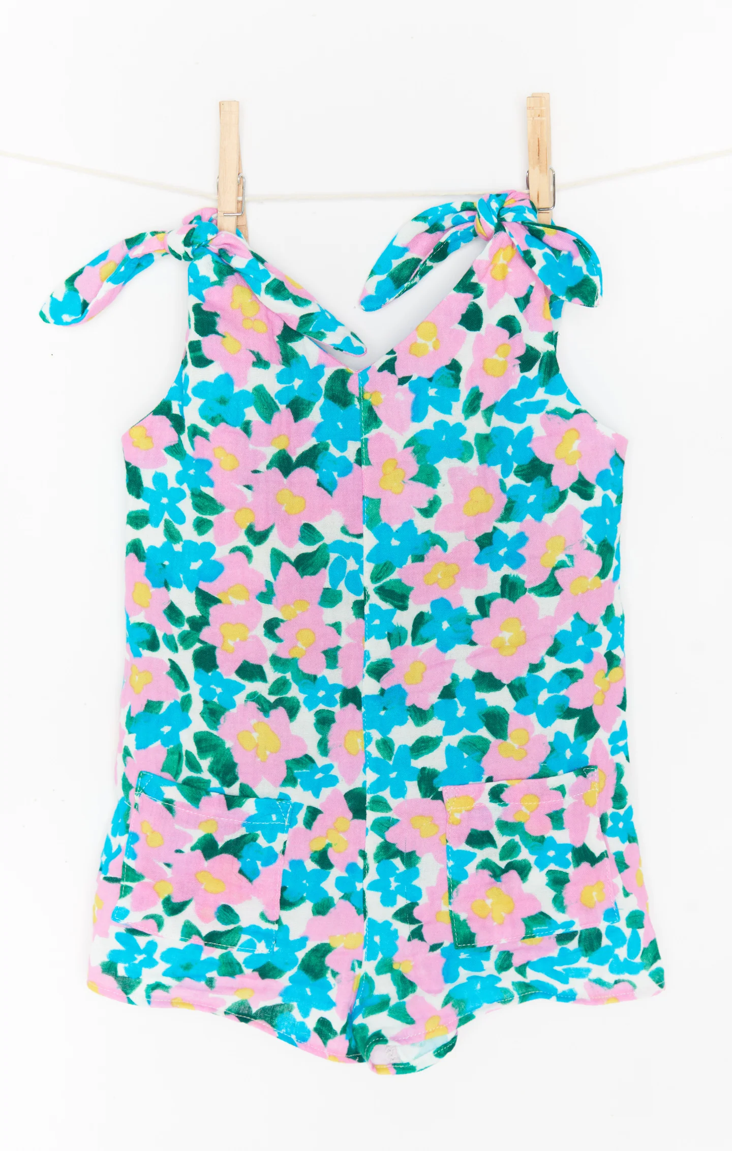DetailA floral mini romper designed for easy outfit adjustments, perfect for a garden setting.