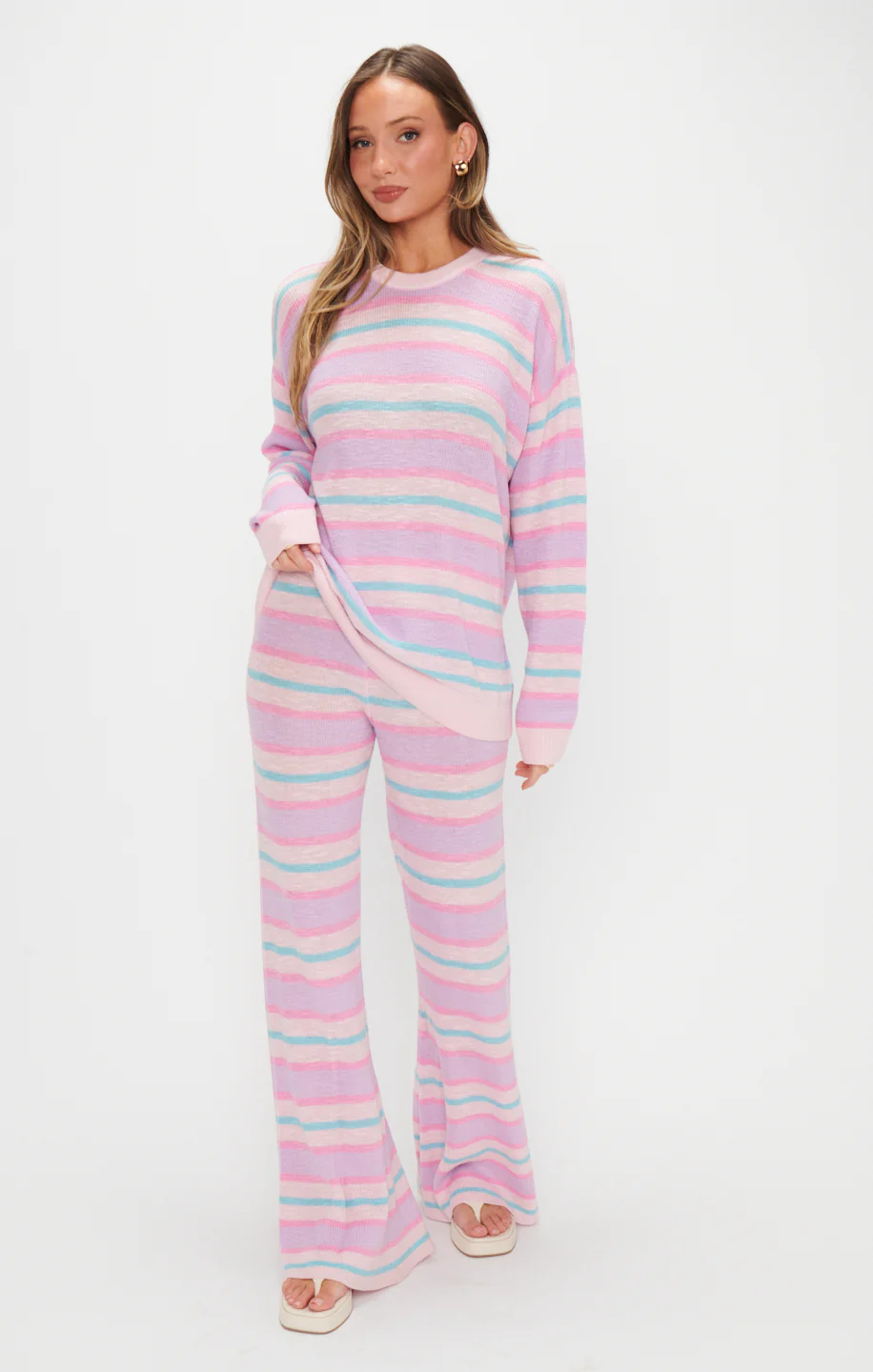 Cotton candy stripe knit pants designed for comfort and style. Perfect with the matching cotton candy stripe sweater and sneakers, or dressed up with a cute coat when the weather cools down. The fabric is soft and comfortable.