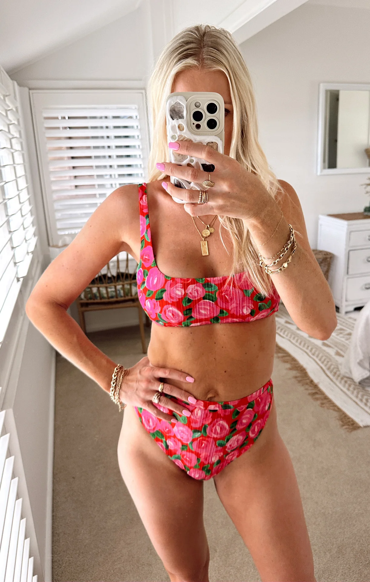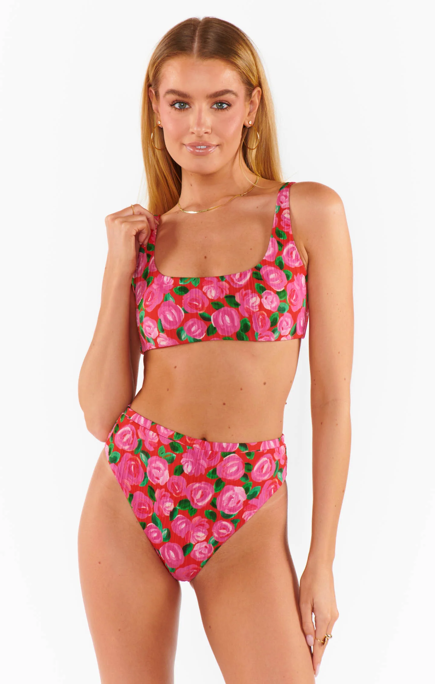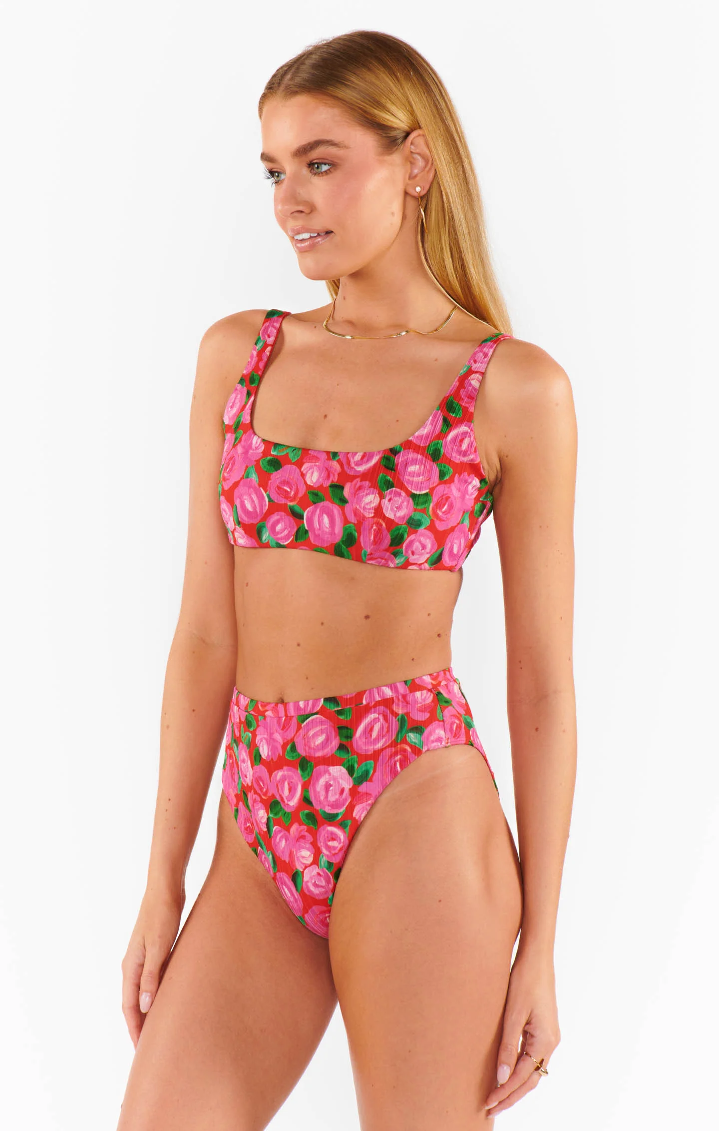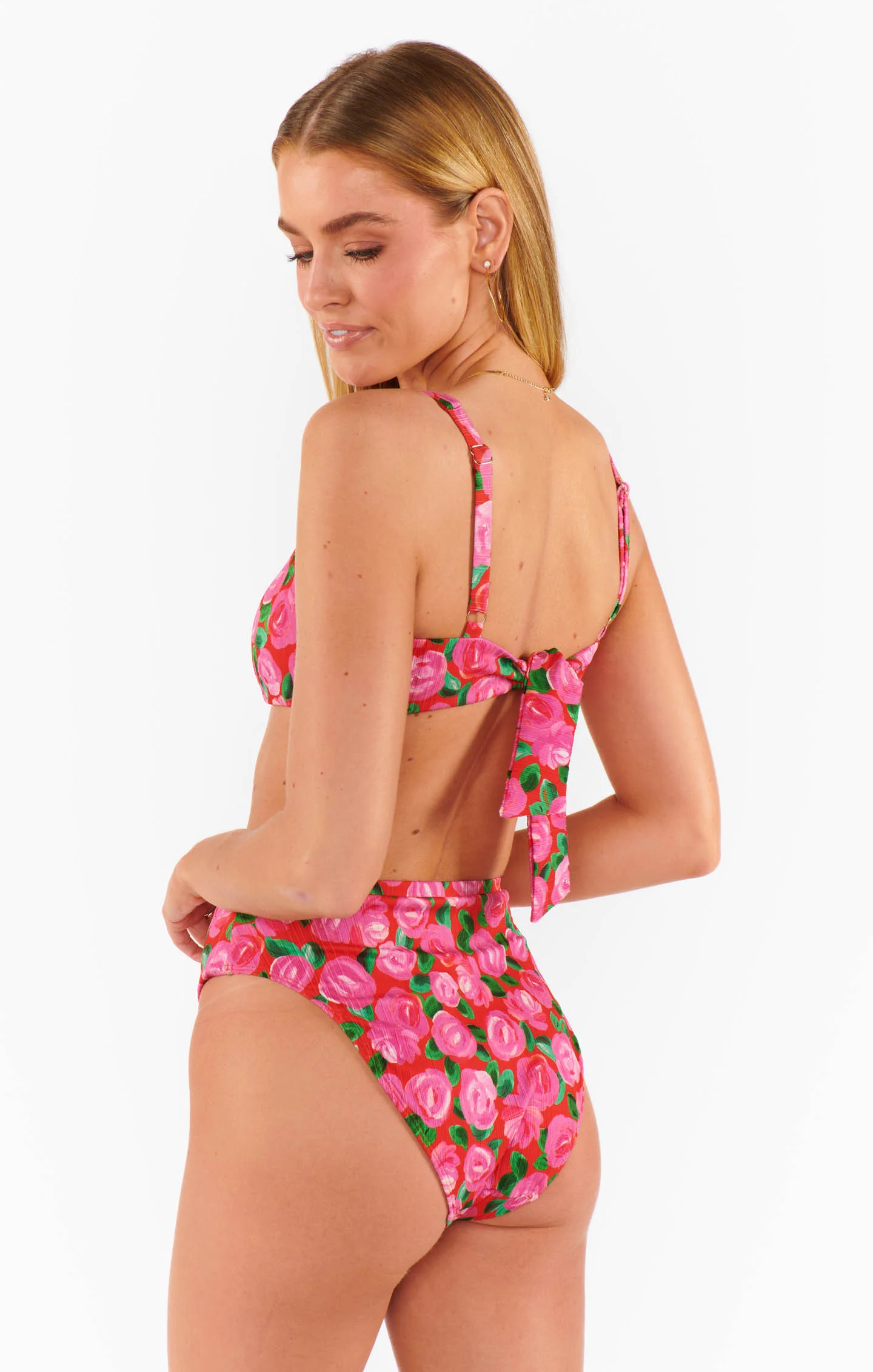 A floral swimmie with moderate coverage and a tie back, matching the Sanibel Bottoms.