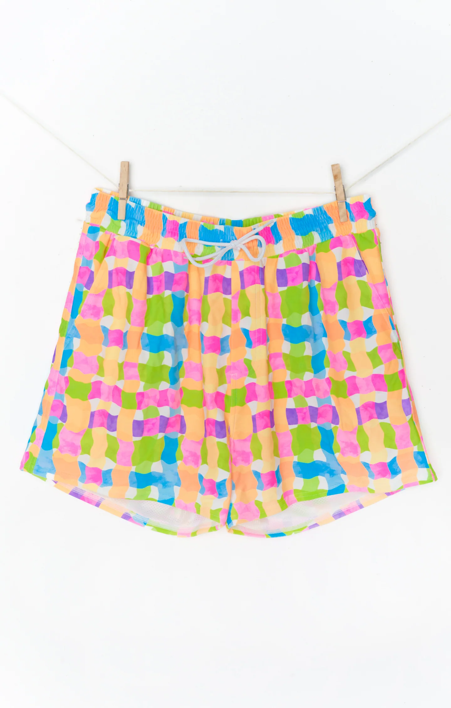 DetailNeon checker swim trunks with a drawstring and elastic waist for adjustable fit, suitable for beach picnics