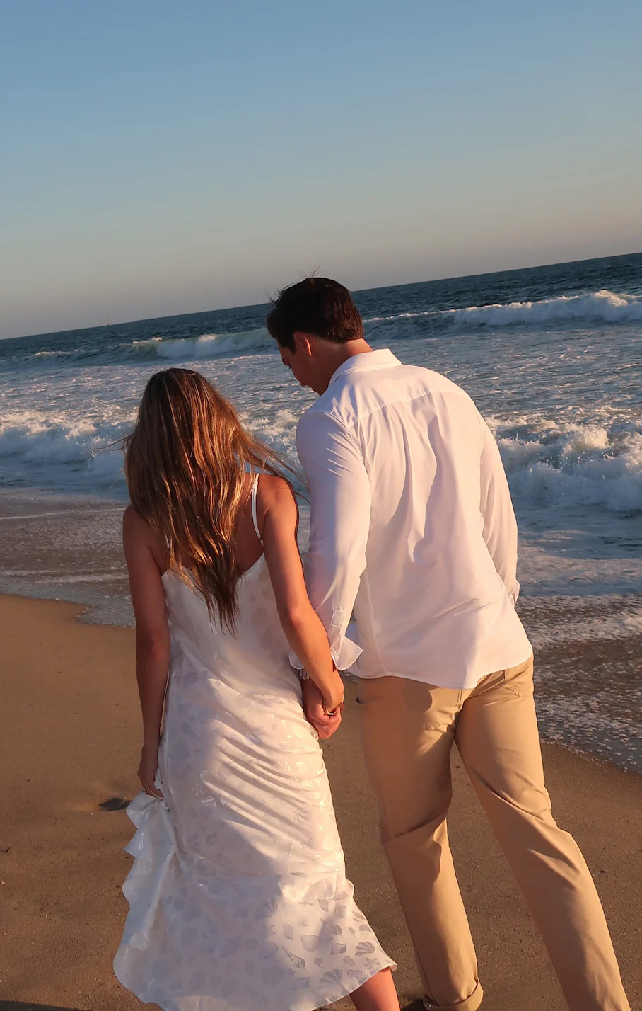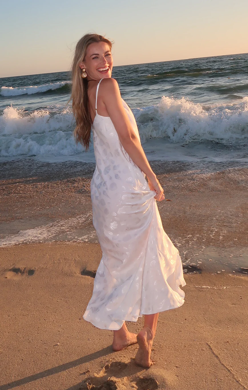 A delicate slip dress with a fit-to-flare silhouette, featuring a v-neck cut and adjustable straps. It includes a shelf bra to provide security for date nights or casual wear under a favorite tee and sneakers.