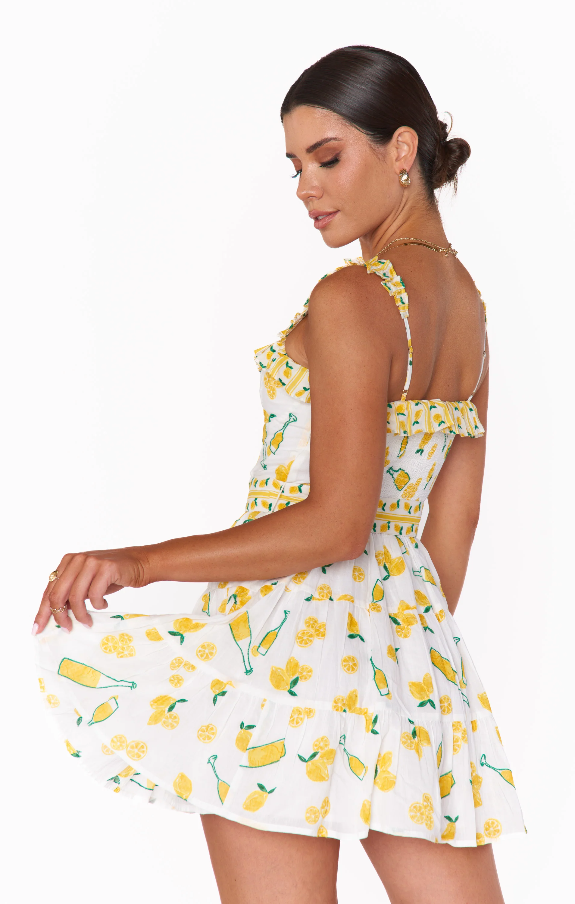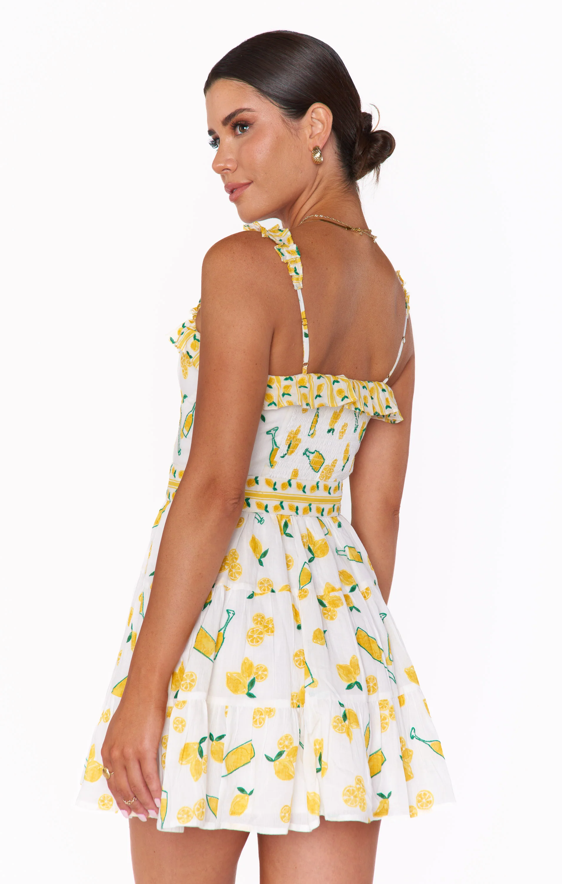 A sweetheart bodice with ruffles along the neck and straps. An adjustable belt cinches in the waist while a smocked back gives the perfect fit. Wear out and about with rattan heels and gold accessories.