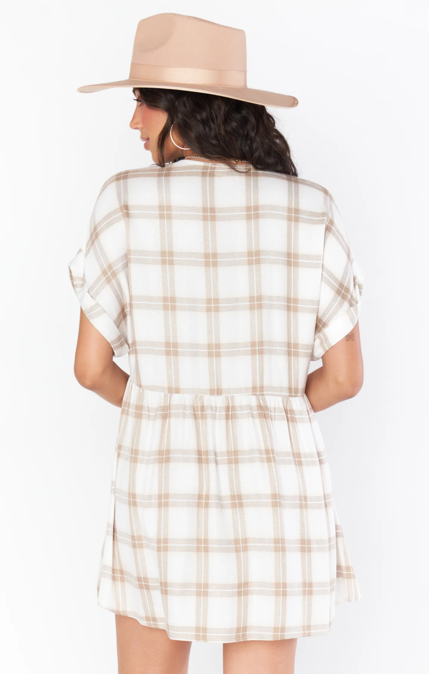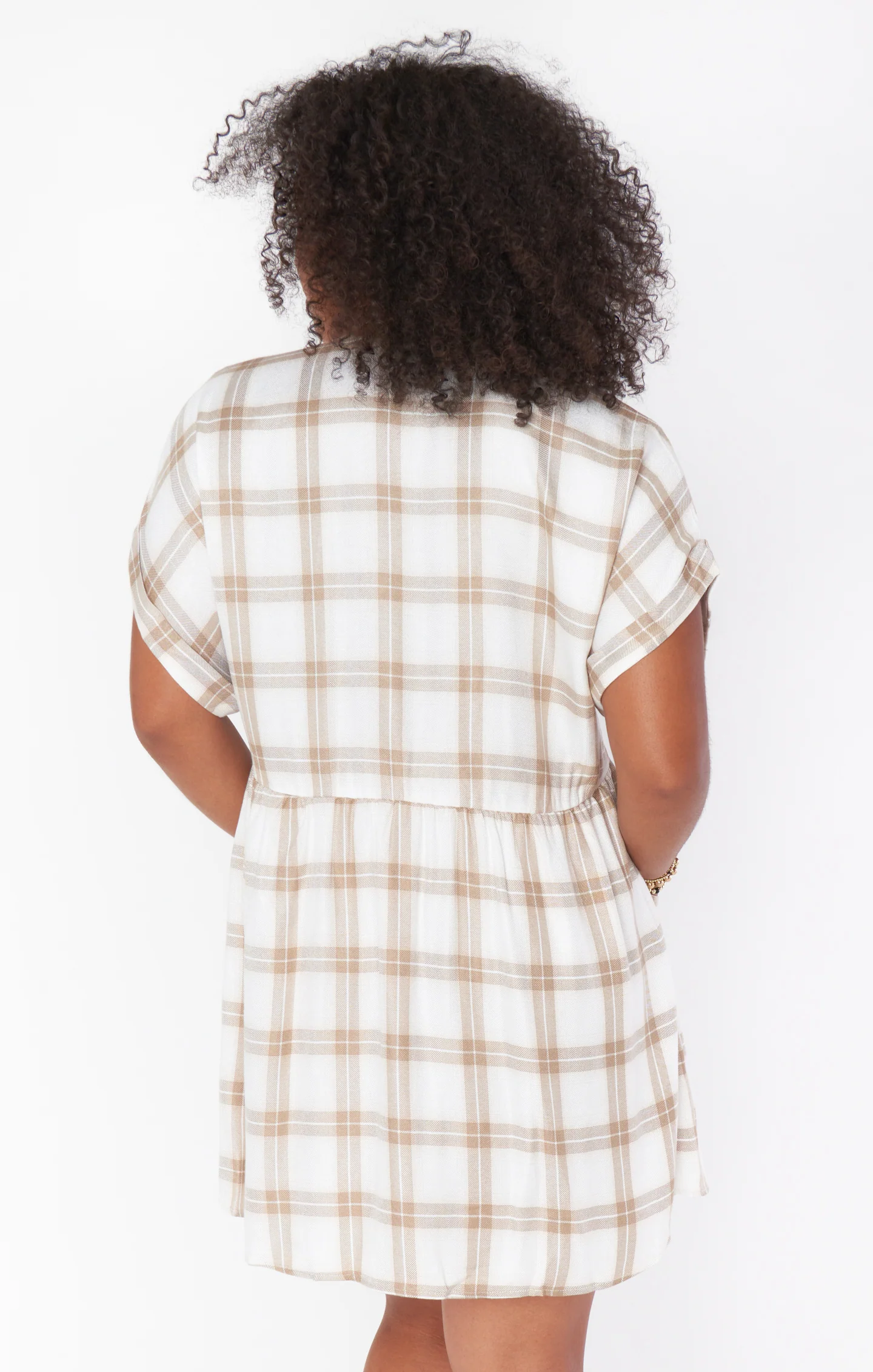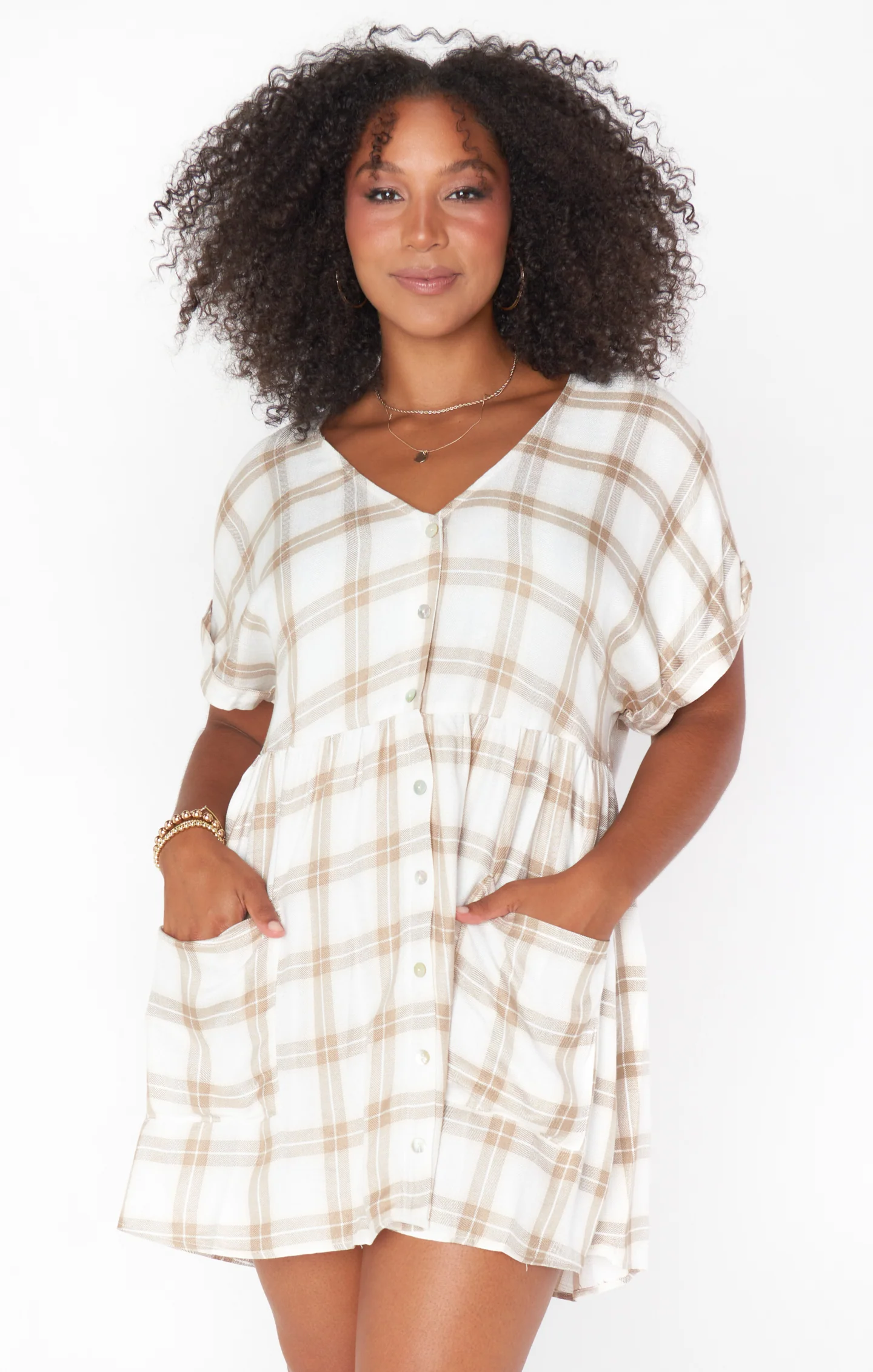 A plaid mini dress with an easy throw-on design. Featuring a front button-down closure and two front pockets, it offers a carefree style suitable for everyday wear.