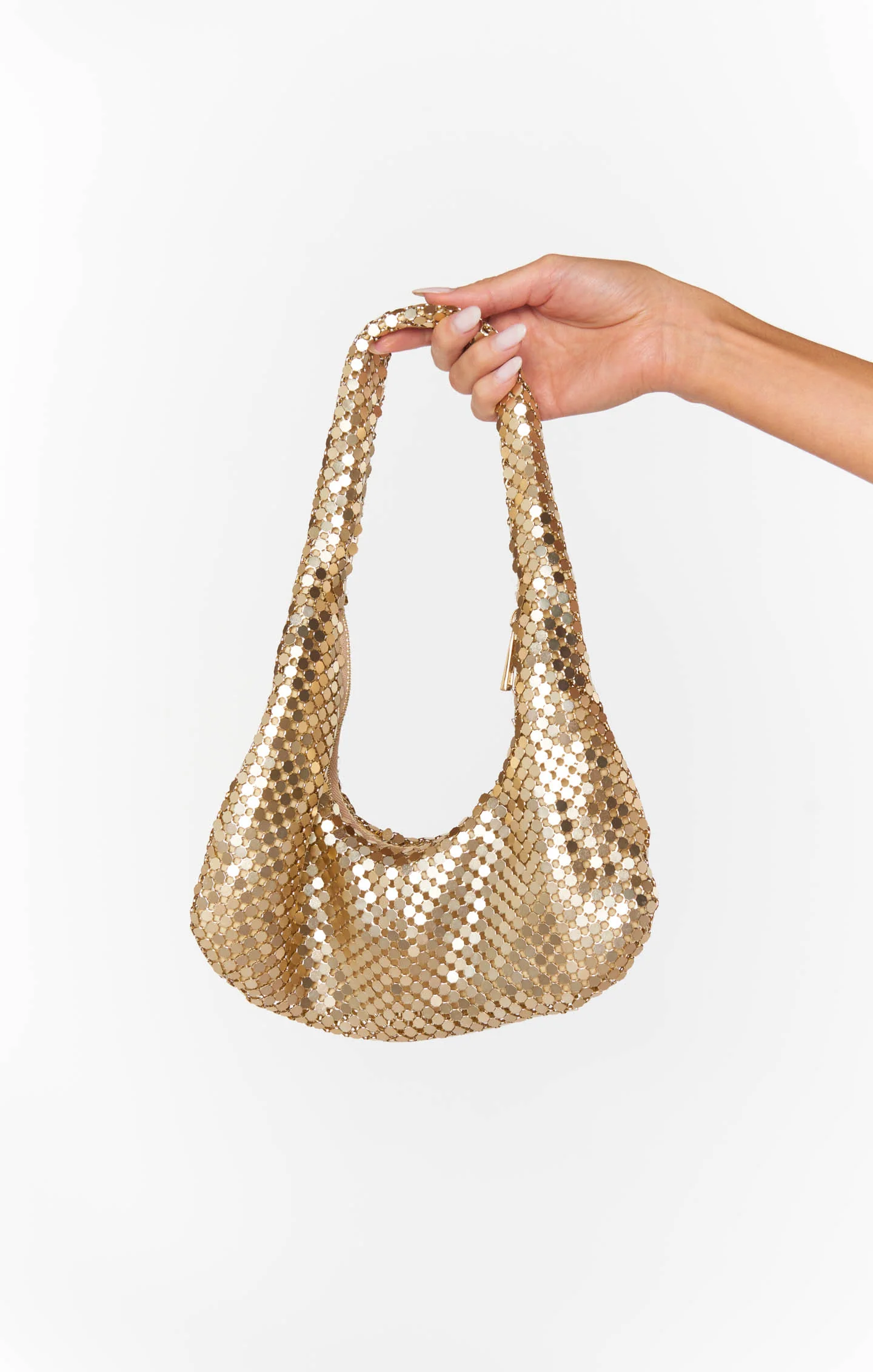 DetailA sparkly, stylish chainmail purse with a bold gold color to elevate your party looks.