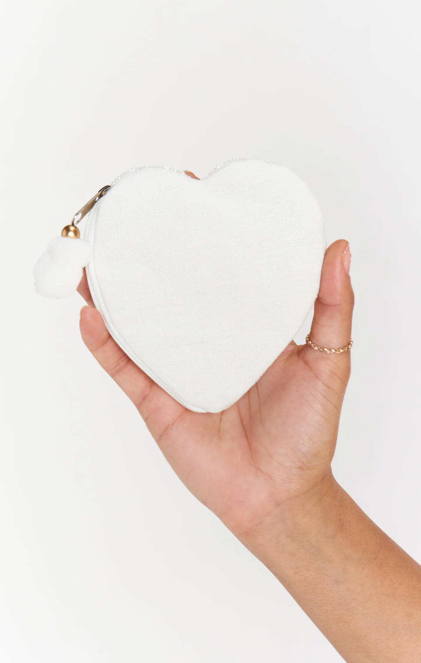 DetailA beaded coin purse in white and gold, perfect for bachelorette or bridal shower outfits. Gifted as a special treat for your bride's bestie or used as a gift for your big day.