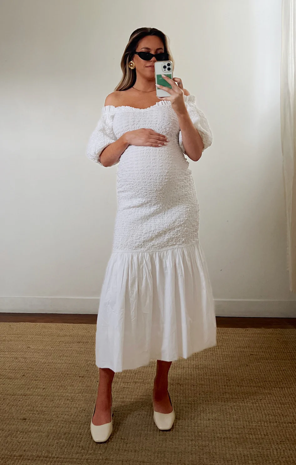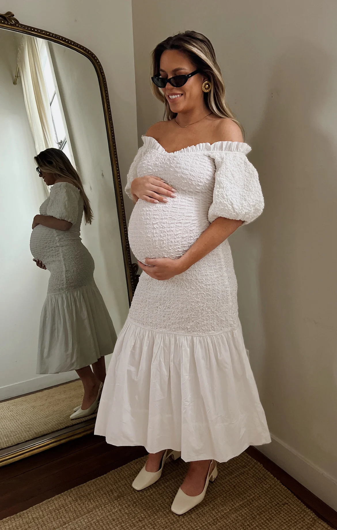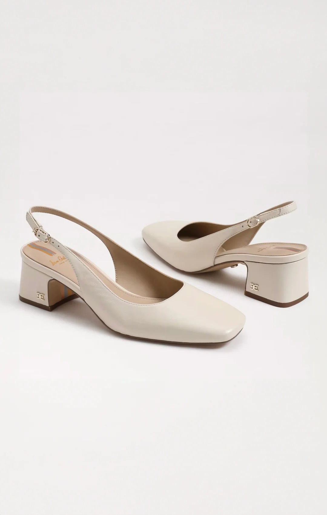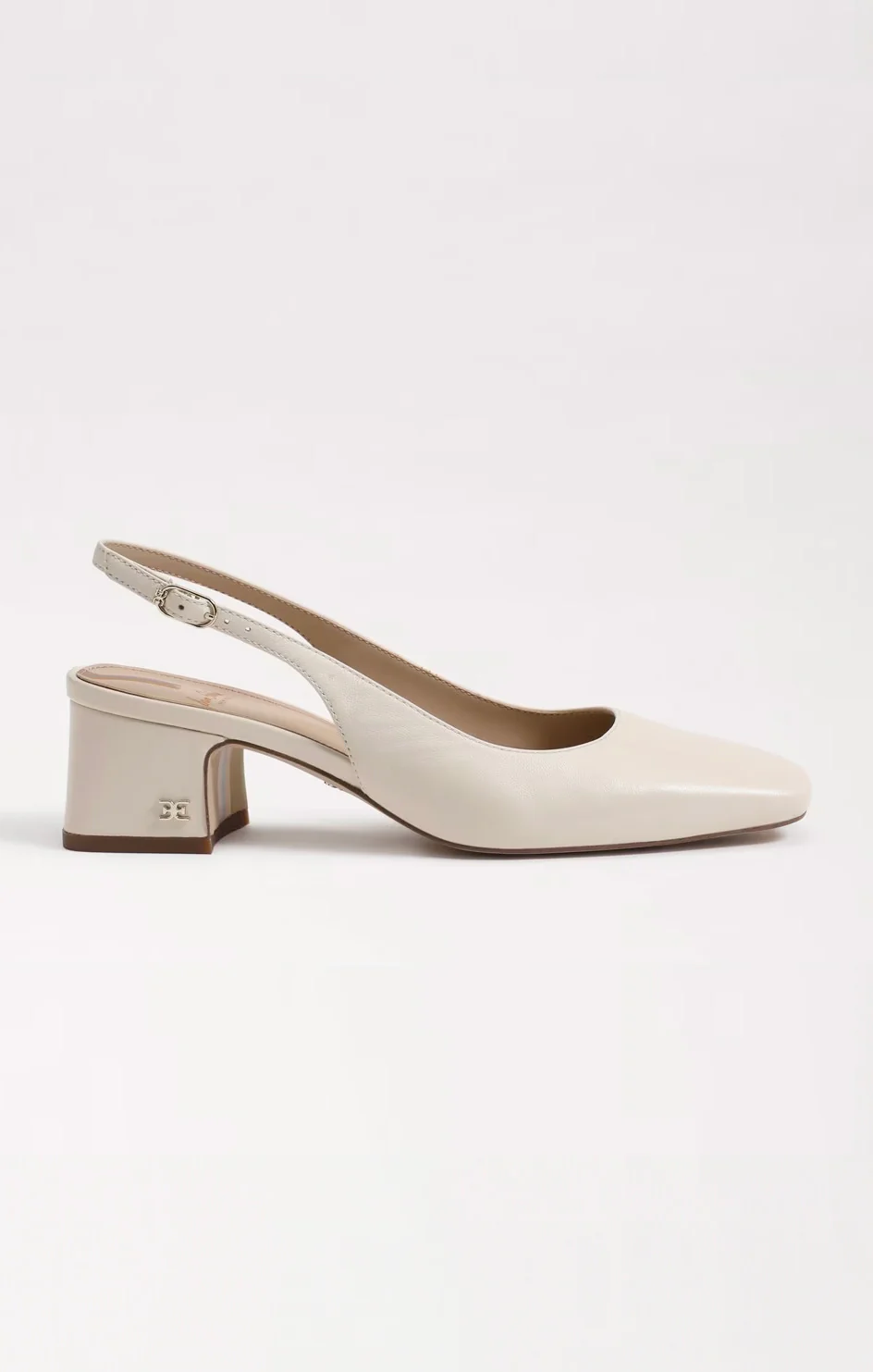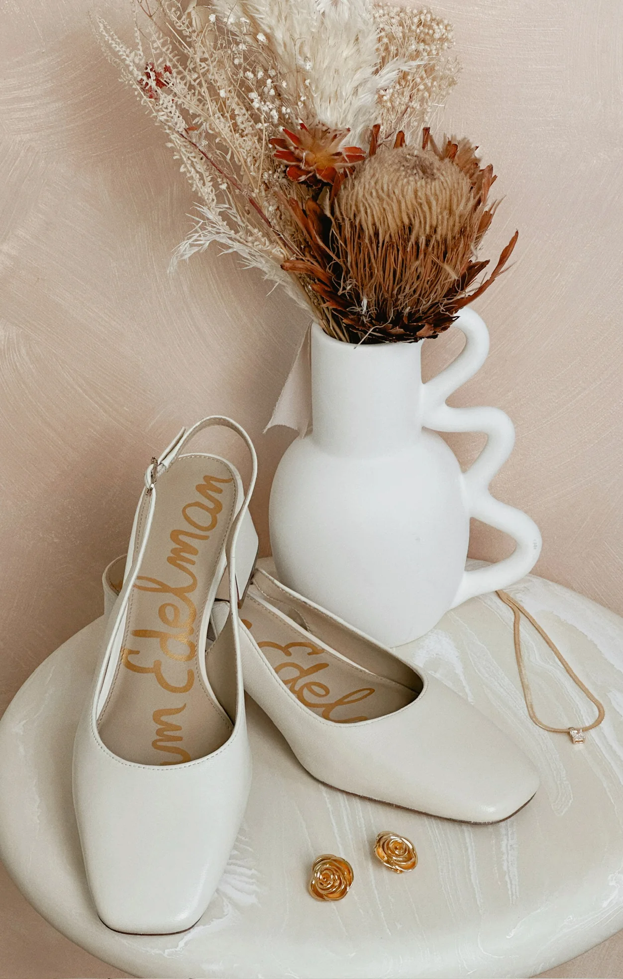A modern ivory slingback heel designed to add a stylish touch to denim or dress up with a sleek mini dress.