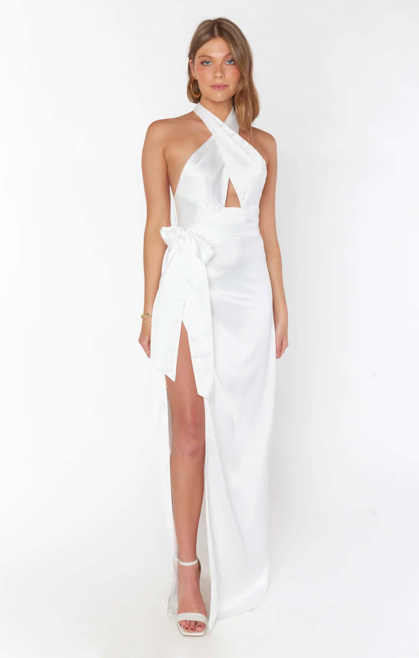A sultry, luxurious maxi dress in ivory satin with a detachable sash and side slit, featuring event-ready jewelry and barely there heels.