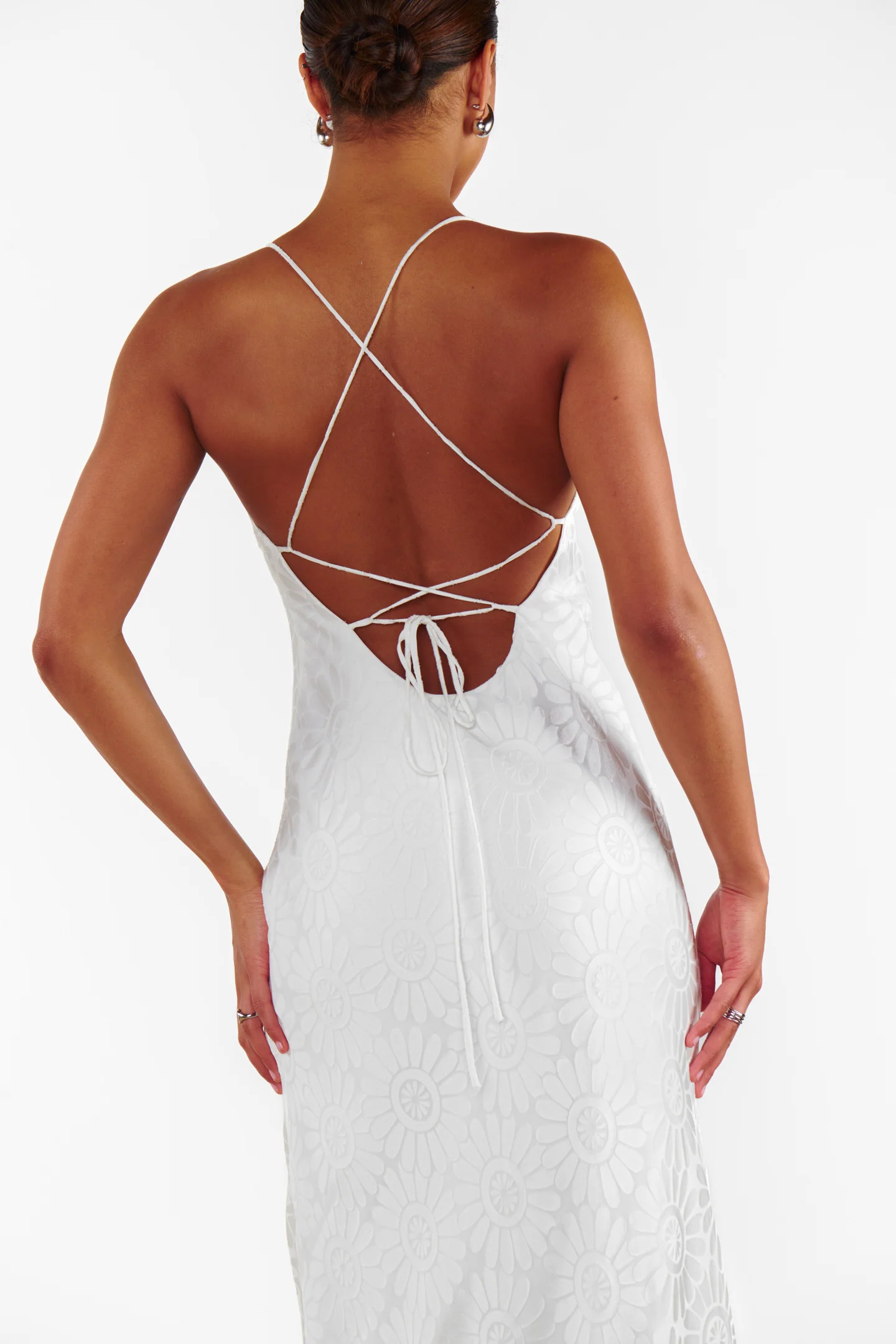 A chic, bridal-inspired dress with a square neckline and low, criss-cross straps. Perfect for brides paired with delicate heels and jewelry.