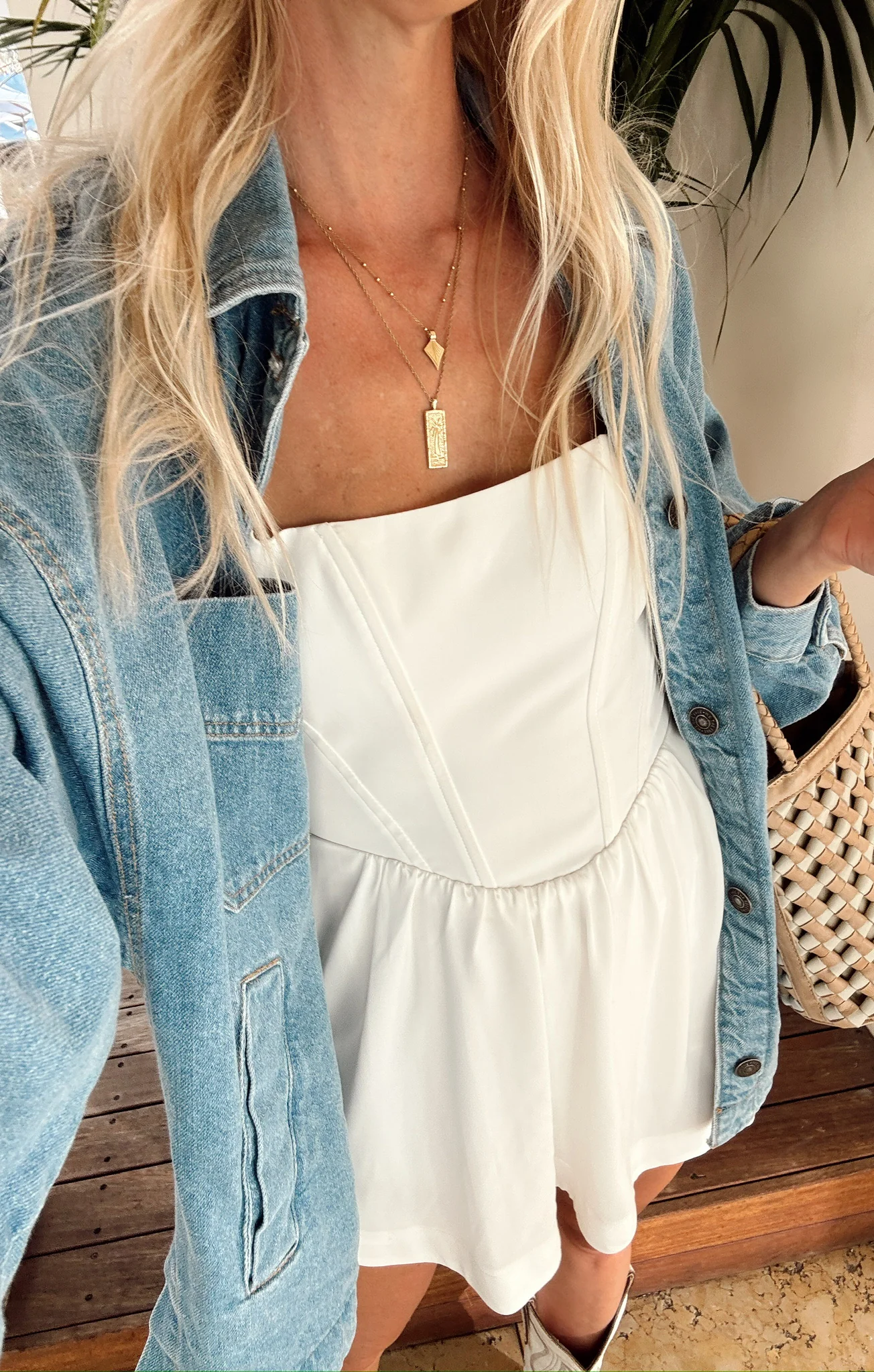 A fitted, flounced bodice with a smocked back, built-in shorts, and a white, silky crepe fabric. Style it with heels and a small bag for a casual look, or switch to sandals for a fun daytime outfit.