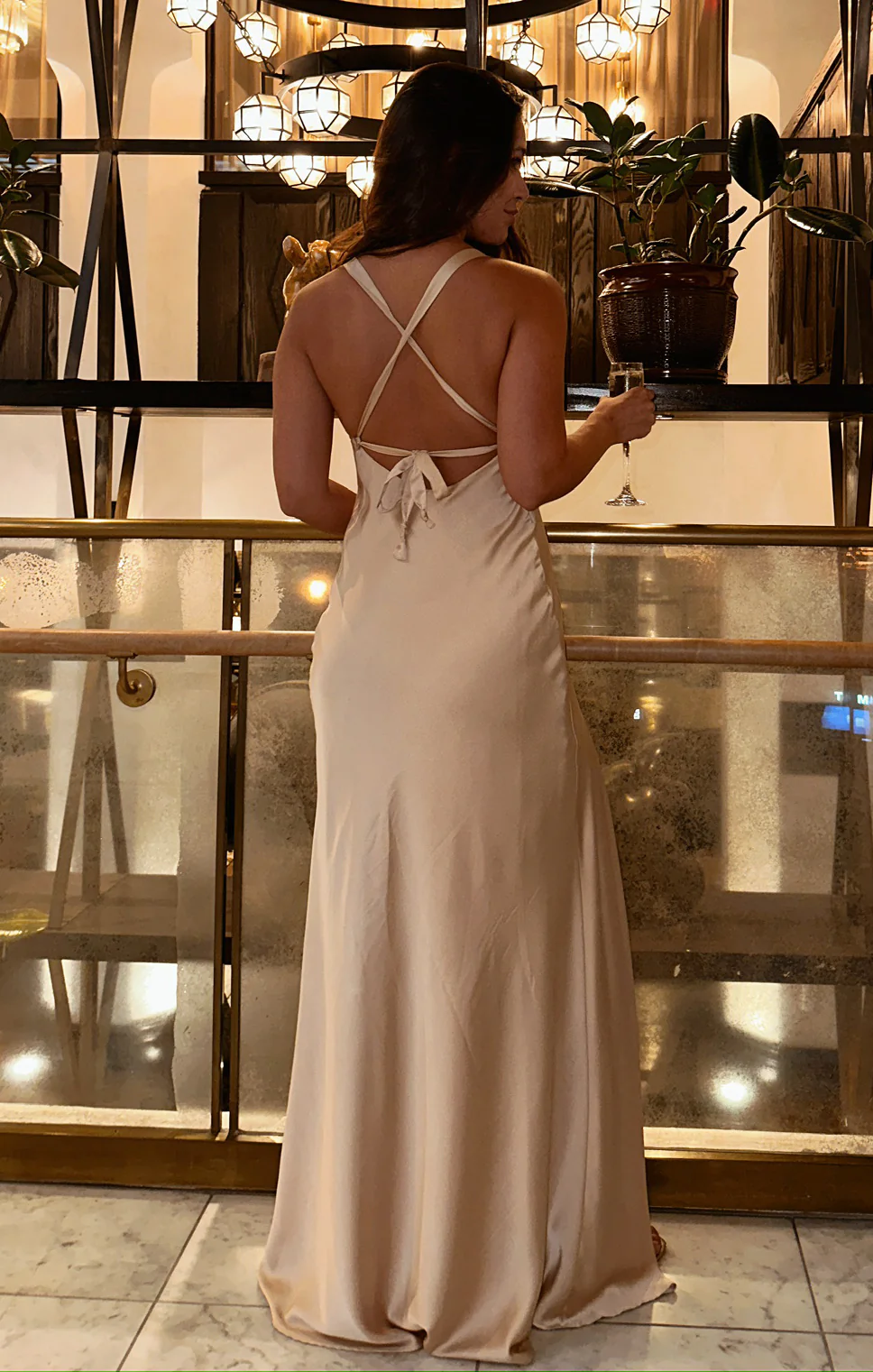 A champagne satin dress with an open back and criss-cross ties. Floor length, flattering and exudes glamour. Style with strappy heels and dainty gold jewelry.