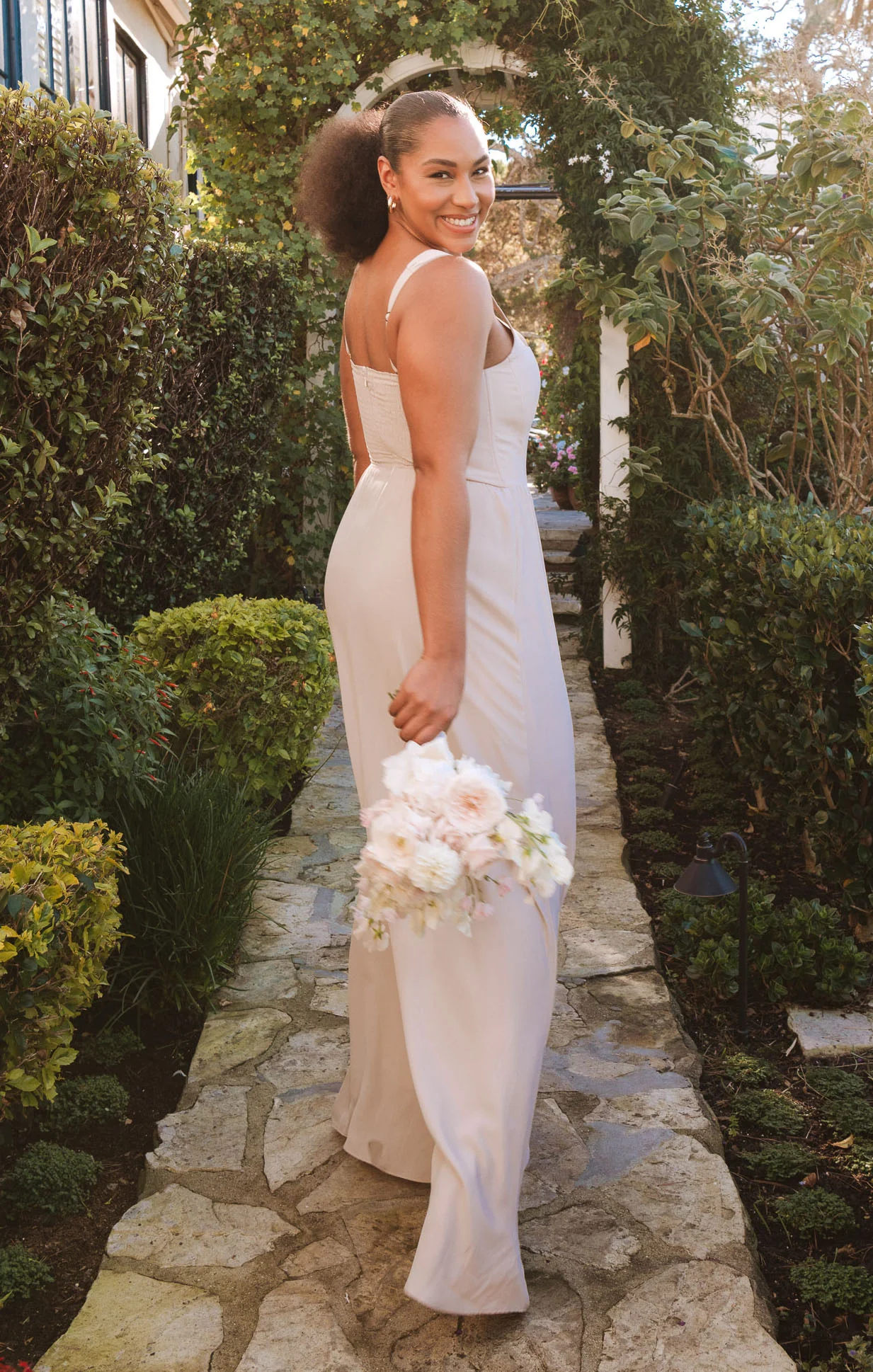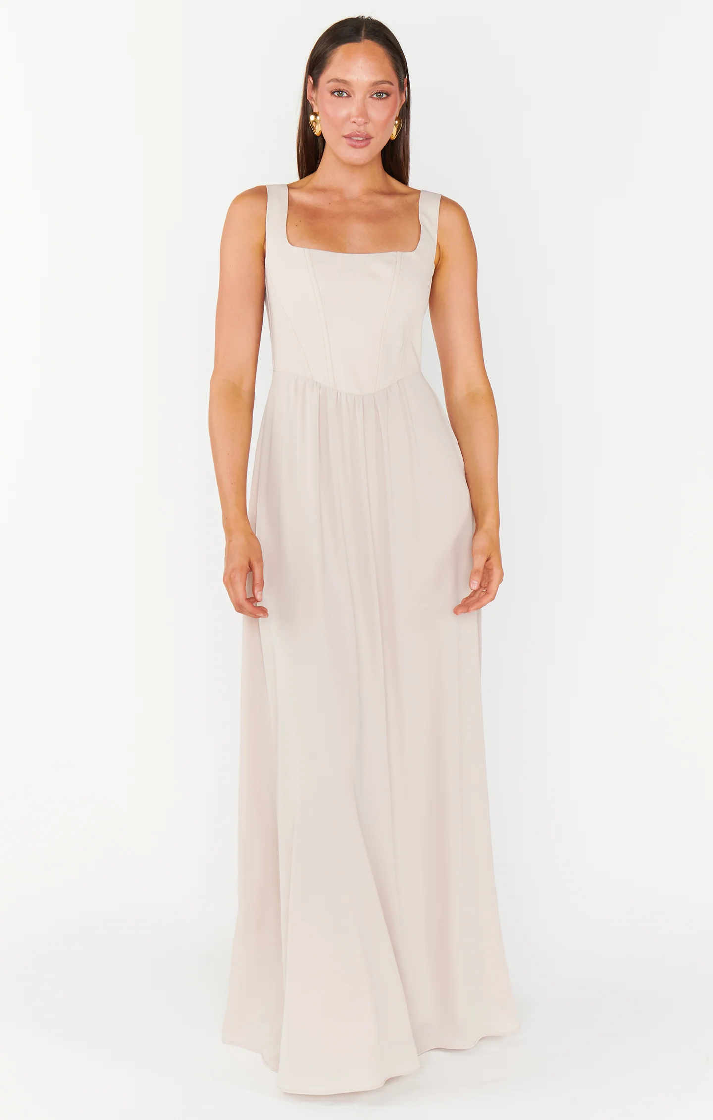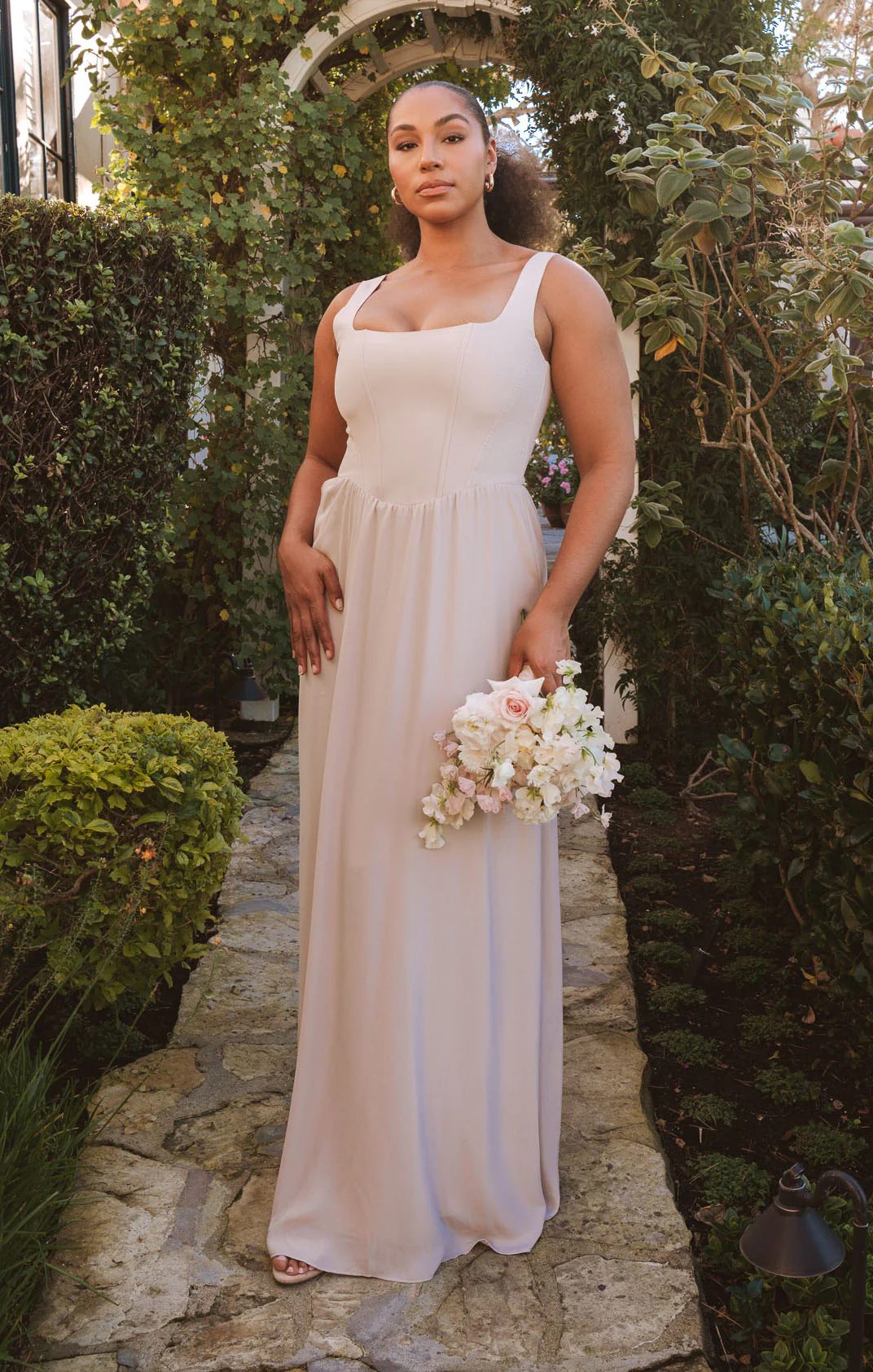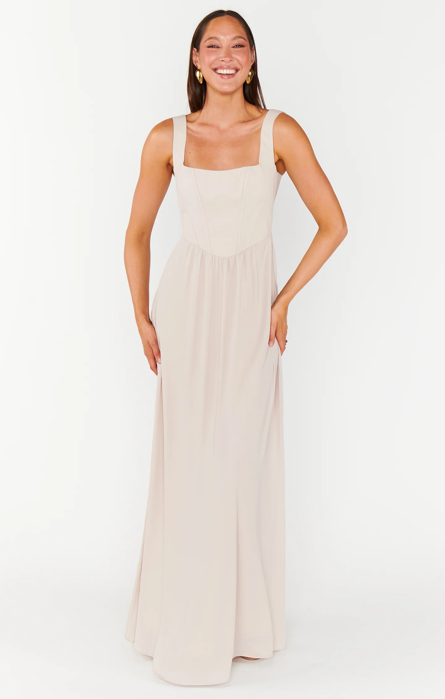 A soft U-shaped neckline paired with a corset bodice with boning and smocked back for the perfect flattering fit. Styled with dainty jewelry and neutral heels.