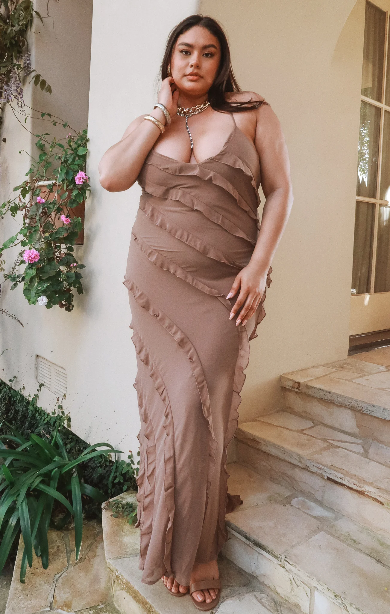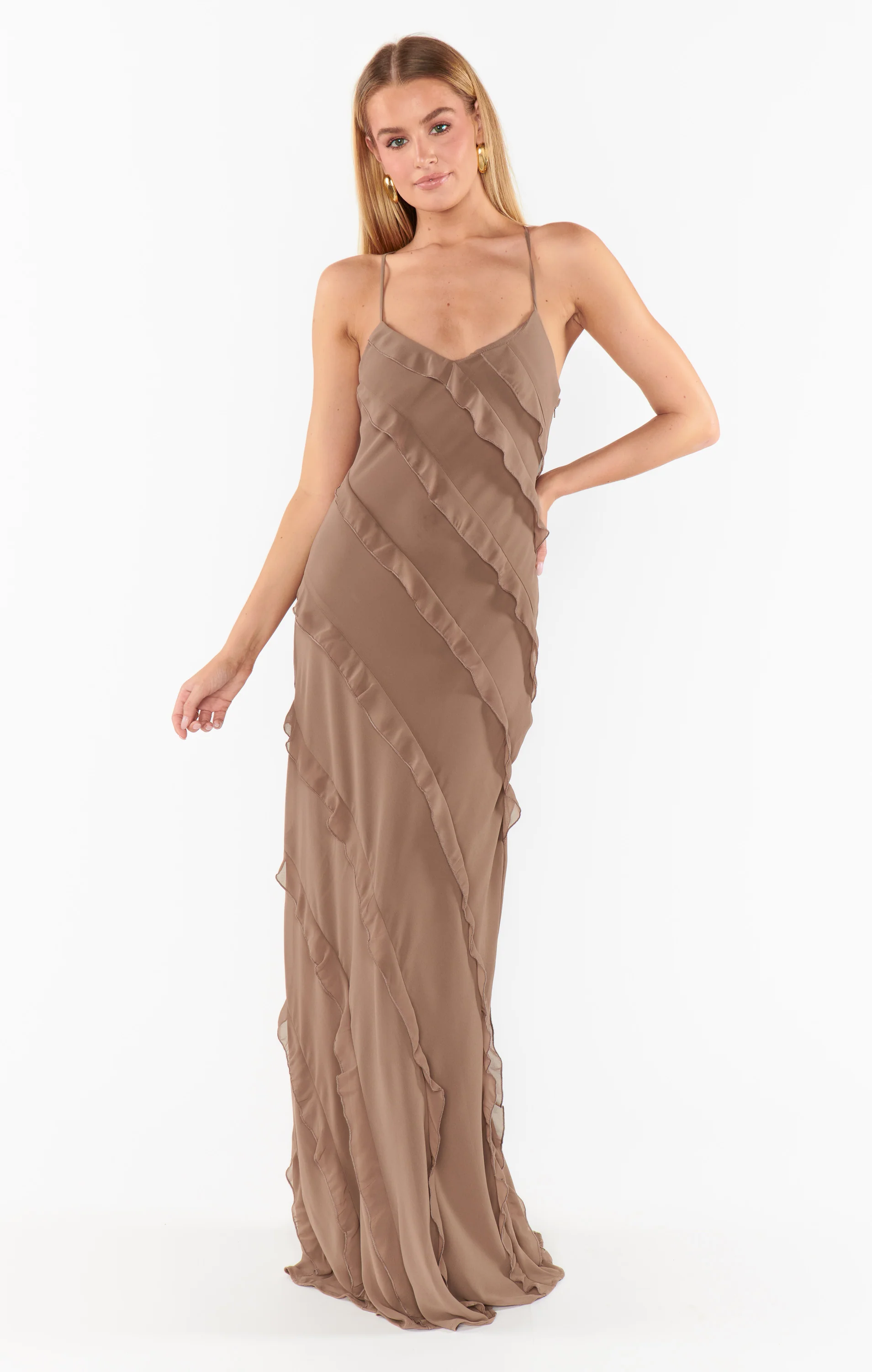 A floor-length slip dress with a ruffle detailing, adding a touch of flirty flair. It is ideal for formal occasions, offering a flattering and elegant look for bridesmaids, brides, or guests.