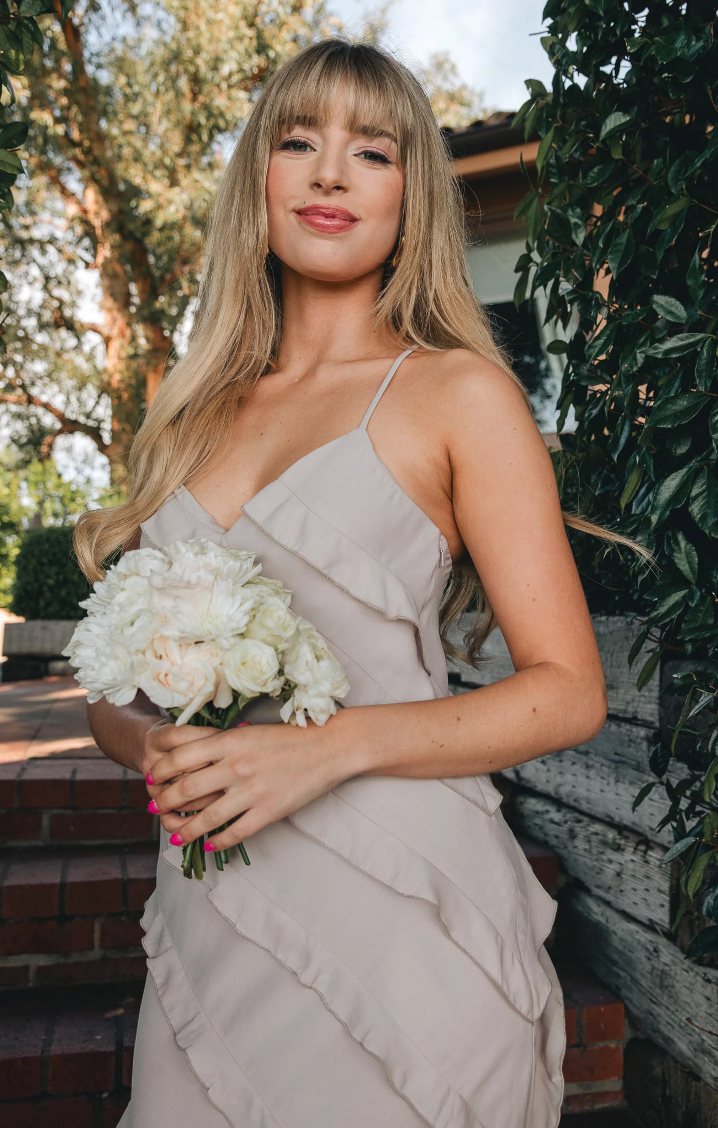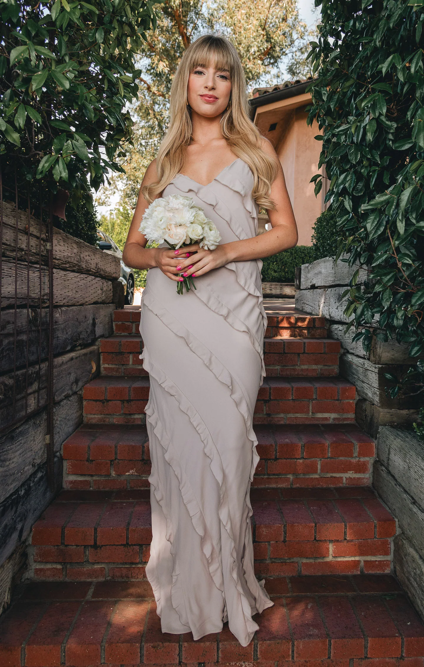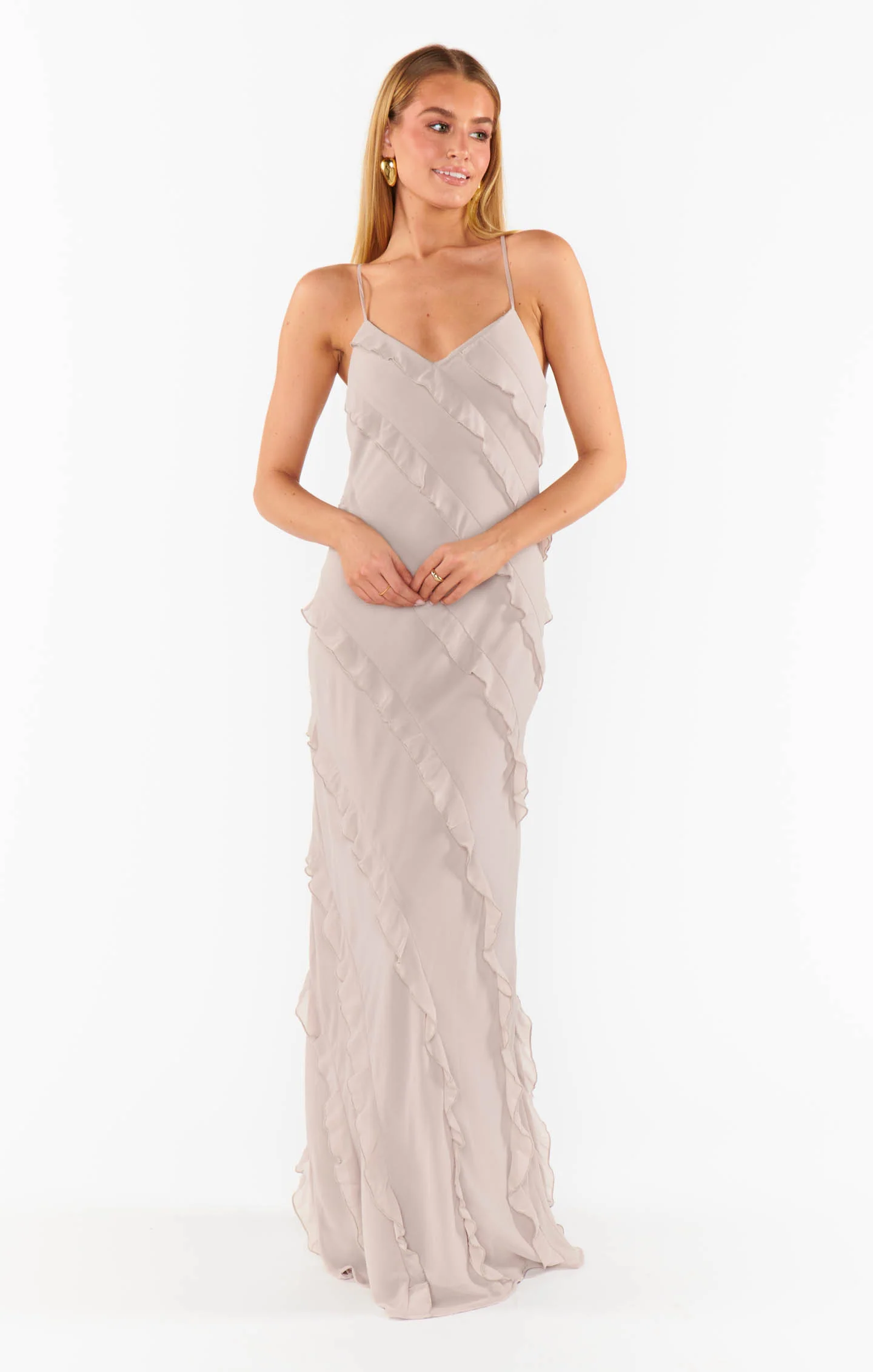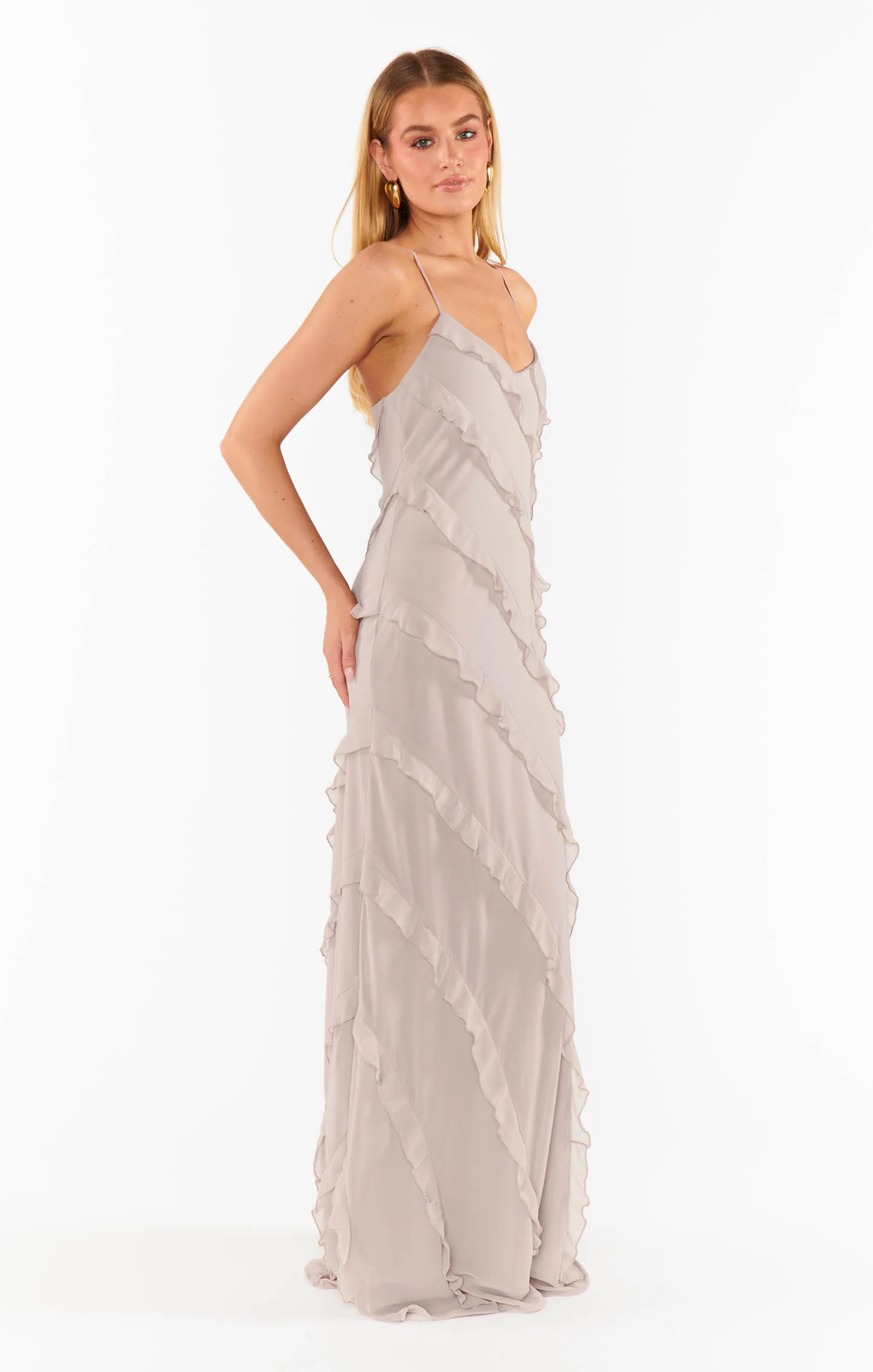 A floor-length slip dress with a ruffle detailing that adds a touch of flirty fun. It's a perfect formal dress for bridesmaids, brides, or guests.