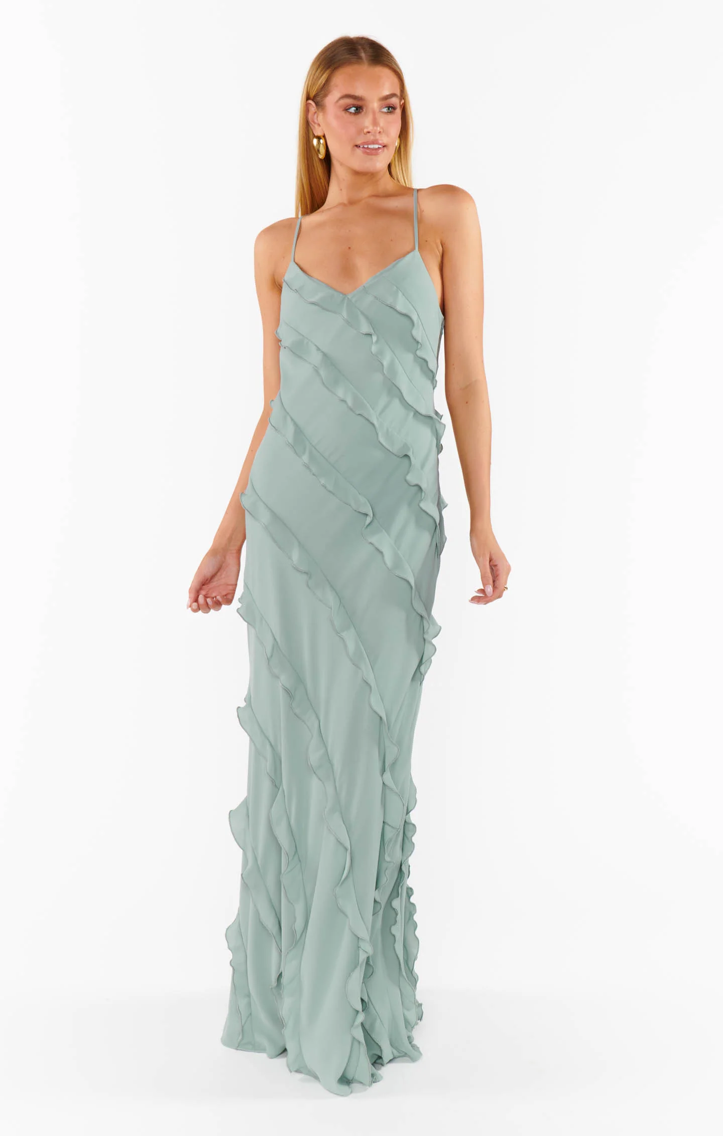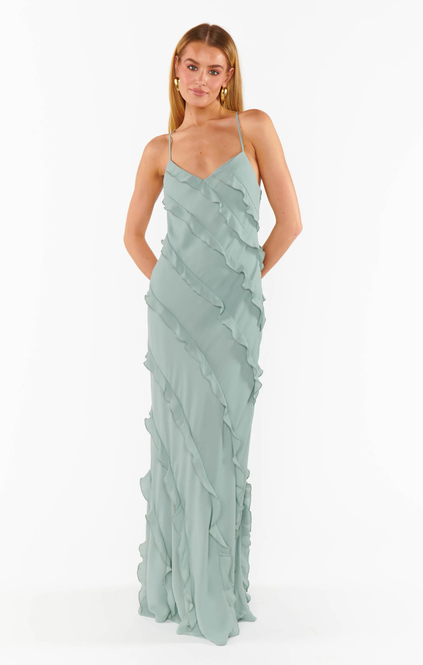 A floor-length slip dress with a romantic ruffle detailing, adding a touch of flirty fun. It is designed to be the formal dress you return to every time.