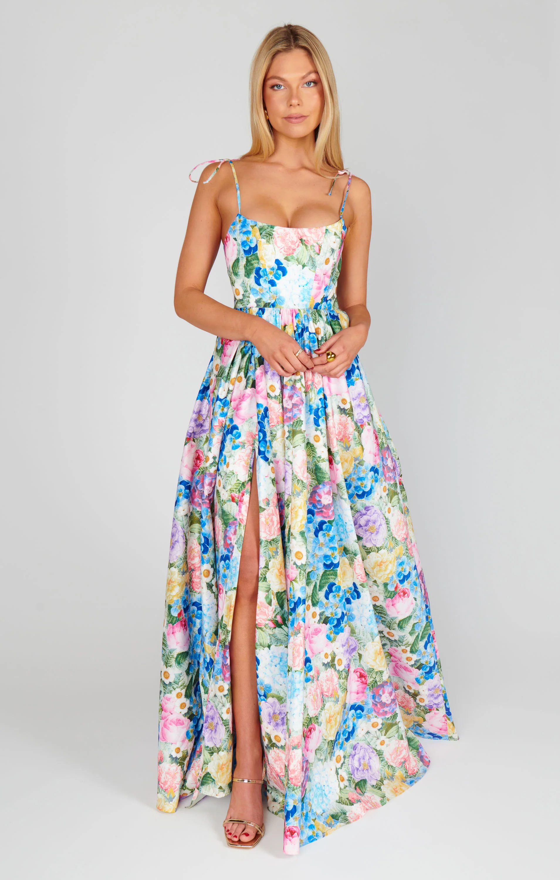 A sultry floral dress with a side slit and a dreamy corset bodice, designed for a romantic look. Adjustable straps, a snug fit, and a flowing silhouette make it ideal for a special occasion or rehearsal dinner. Pair it with statement earrings and strappy heels to create an unforgettable moment.