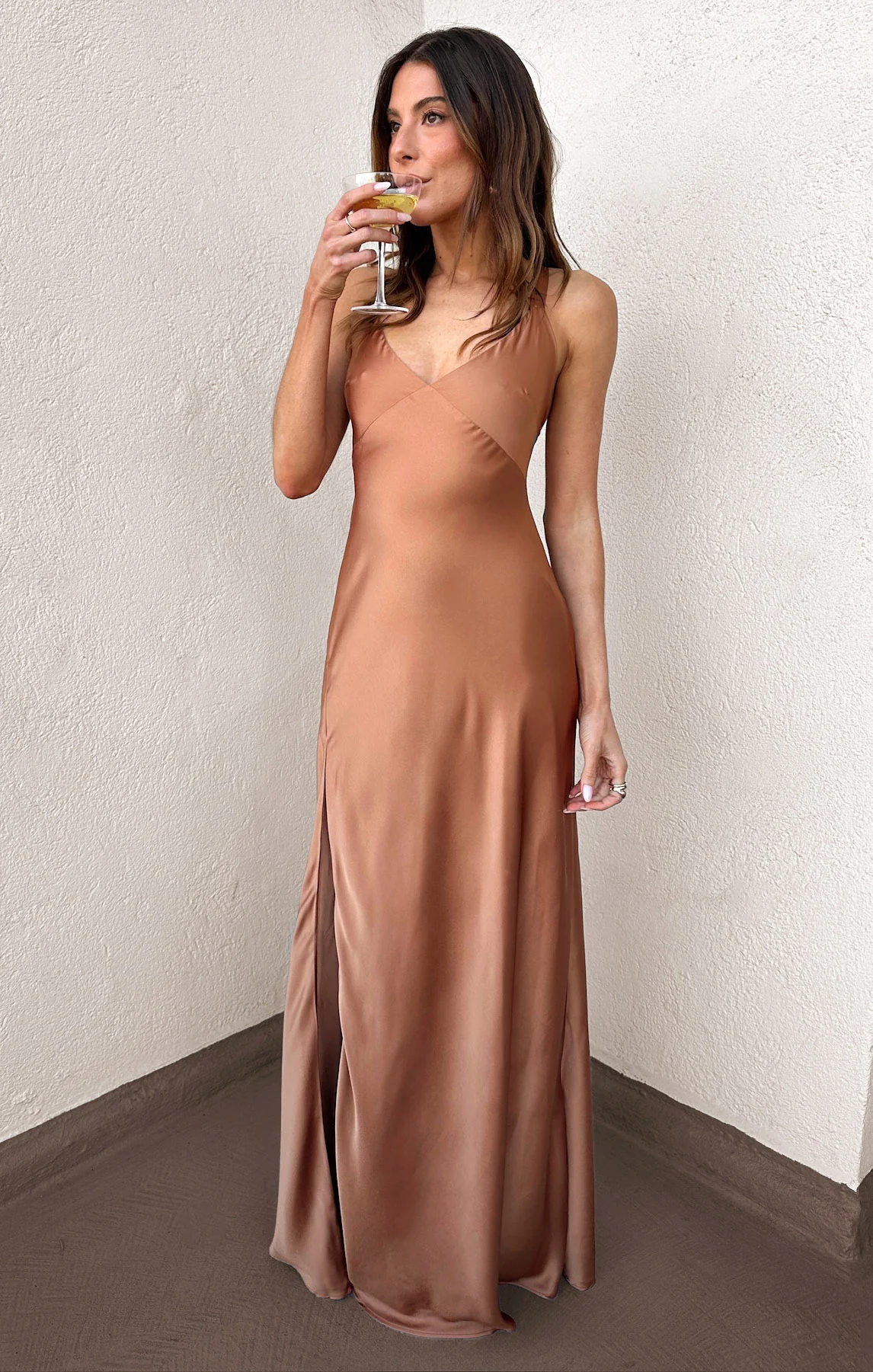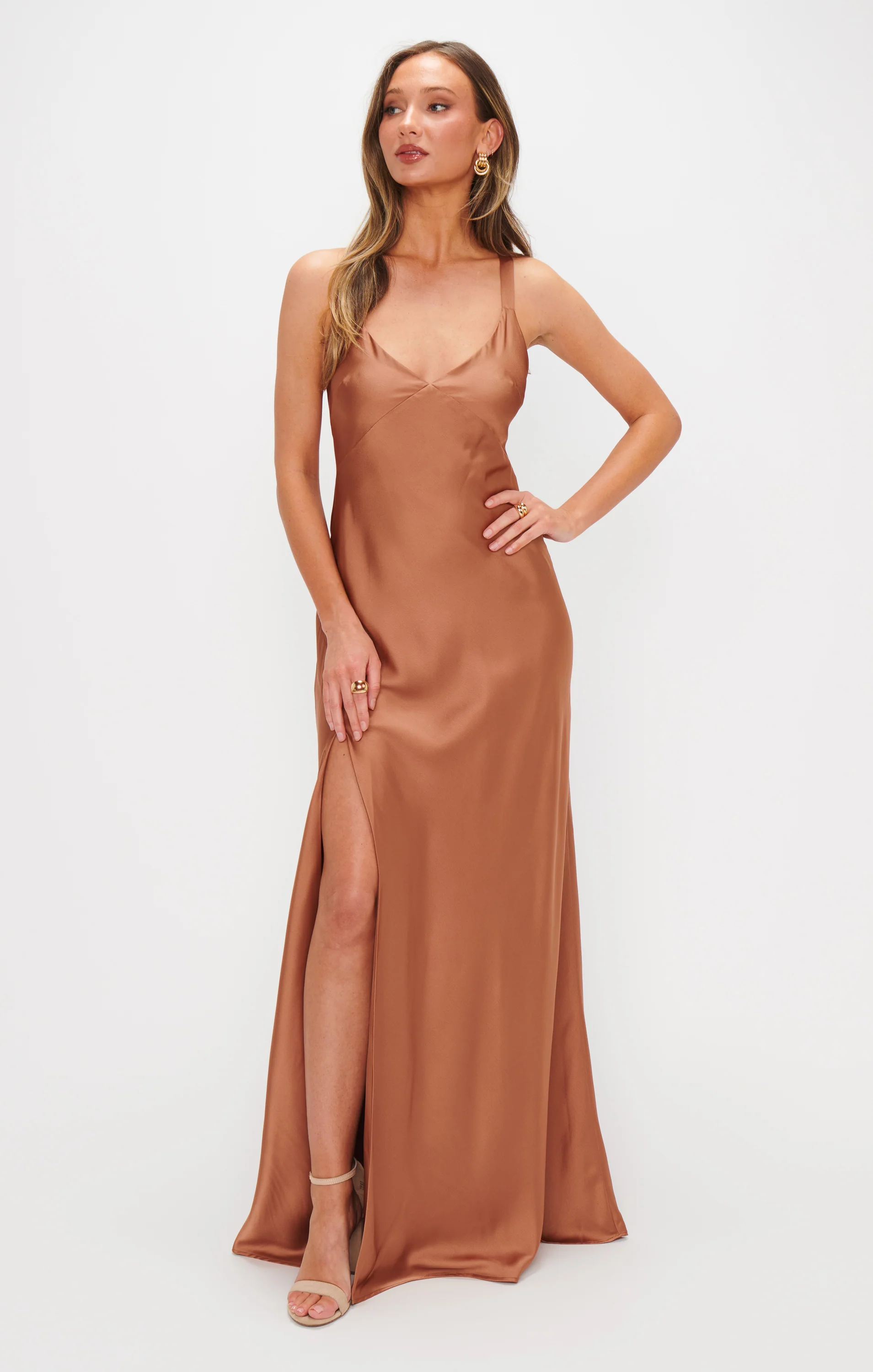 DetailA flattering, floor-length dress with a sleek copper and luxurious satin design. Open back and criss-cross ties. Designed to exude glamour for an event.