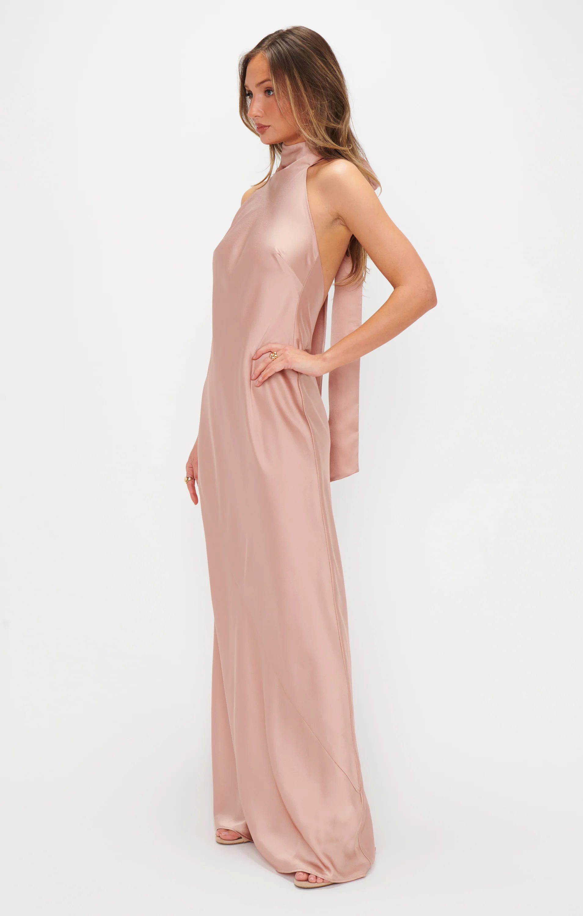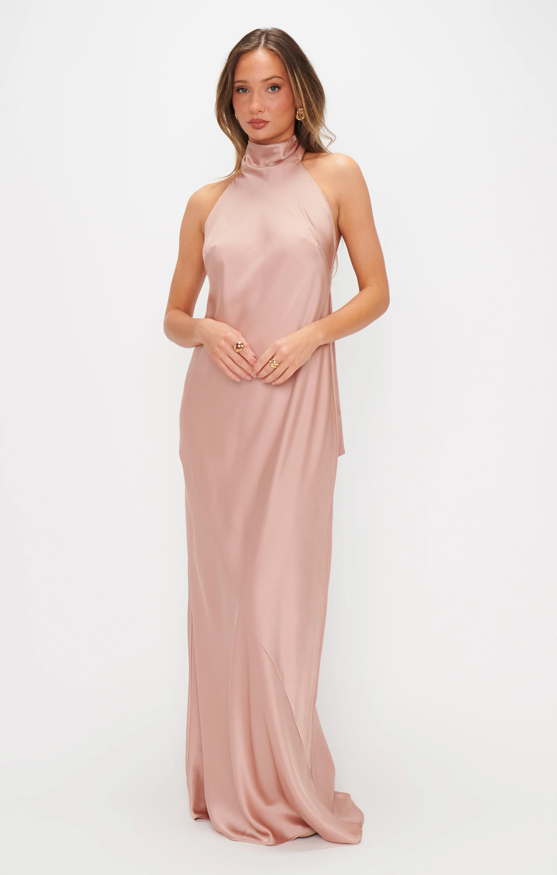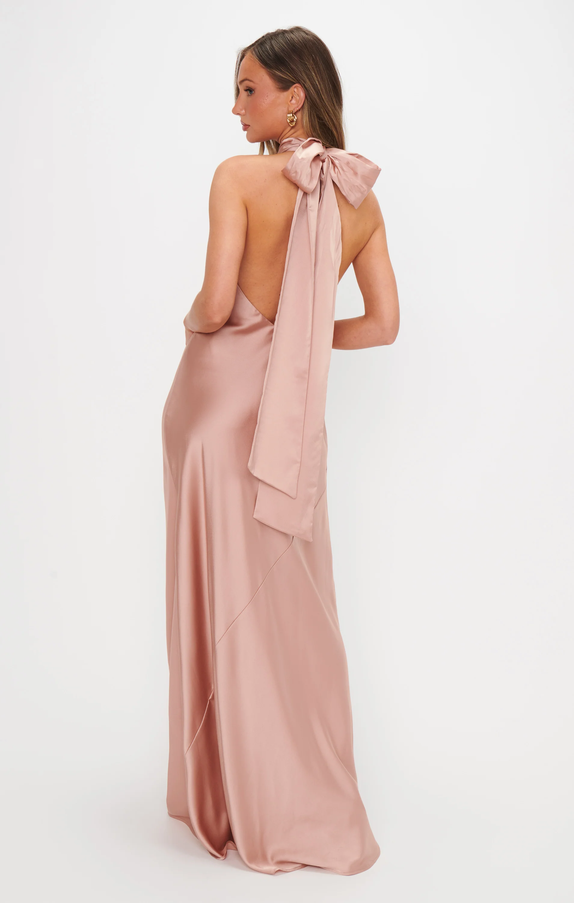 A chic, elegant dress in rose gold satin that accentuates your curves with a halter neckline, fluttery scarf tie, and a dreamy mermaid cut. It creates an hourglass silhouette and adds a touch of enchantment to your outfit.