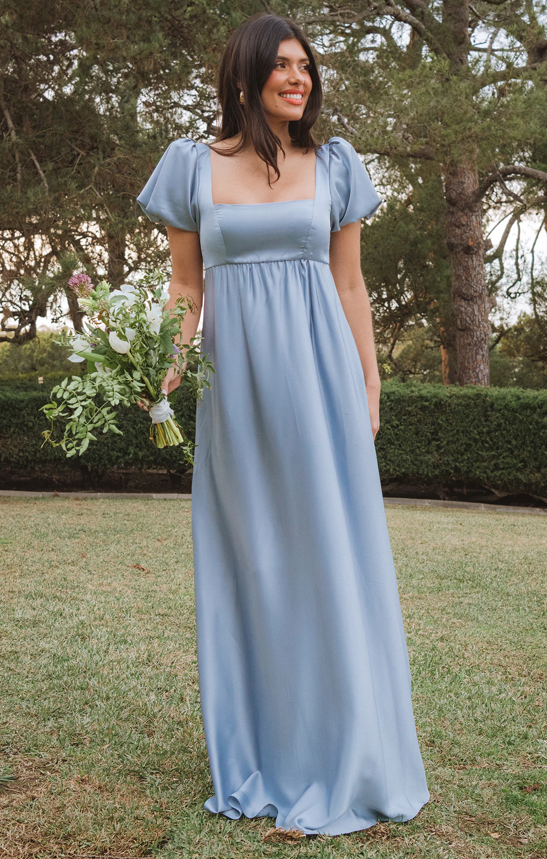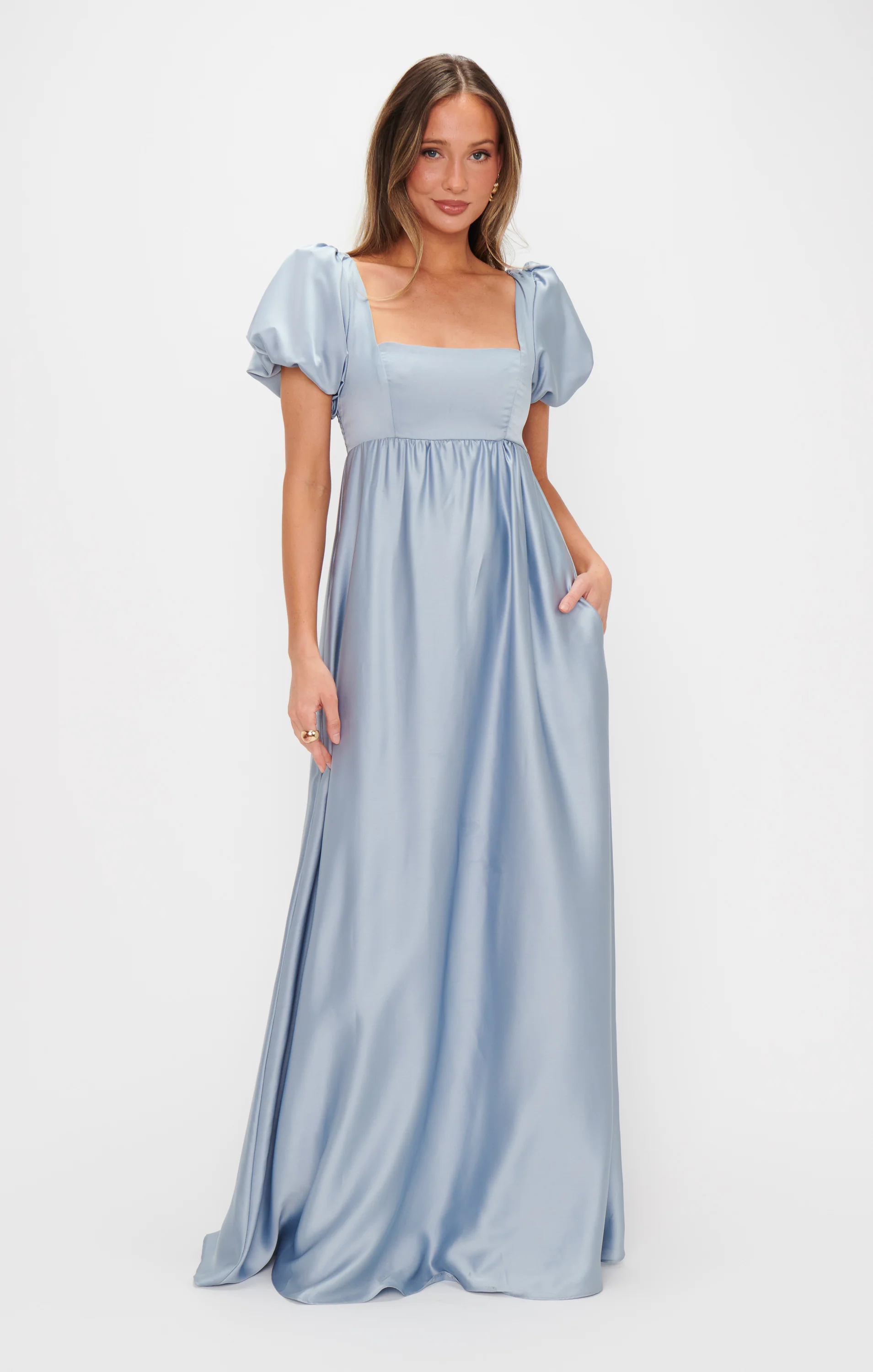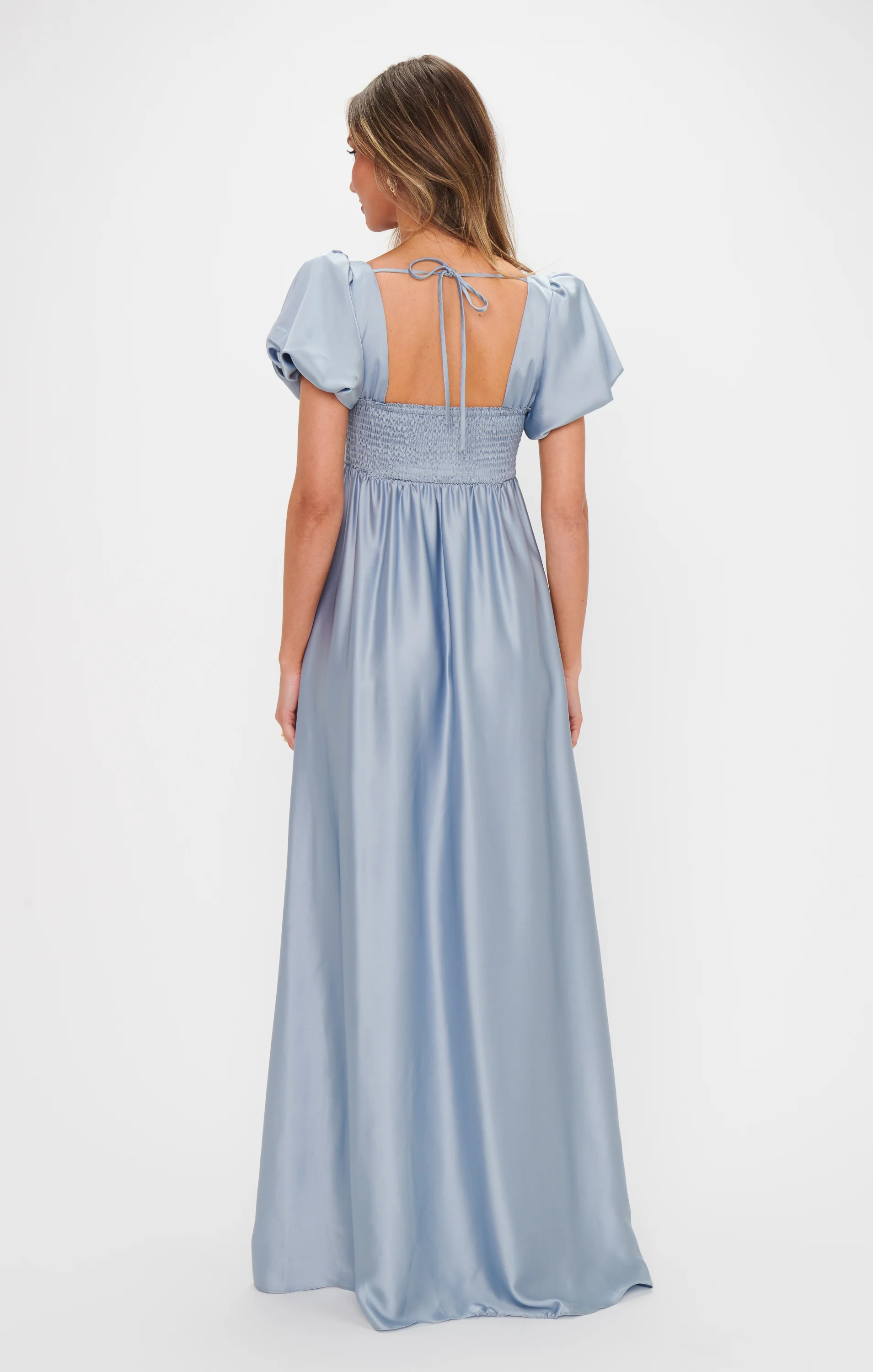 A flattering maxi dress in steel blue with a smocked back and empire waist, perfect for moms-to-be and bridesmaids who love floaty moments and romantic elements.
