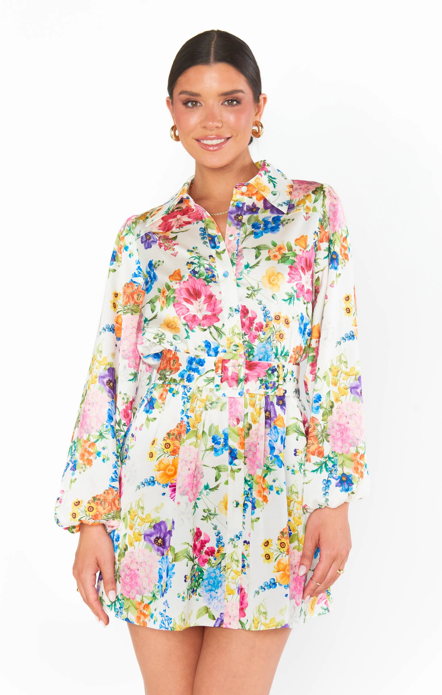 DetailA collared dress in ivory botanical floral design, featuring a tailored fit with a ruffled skirt and adjustable belt. Perfect for a casual, elegant look with cowboy boots and a hat.