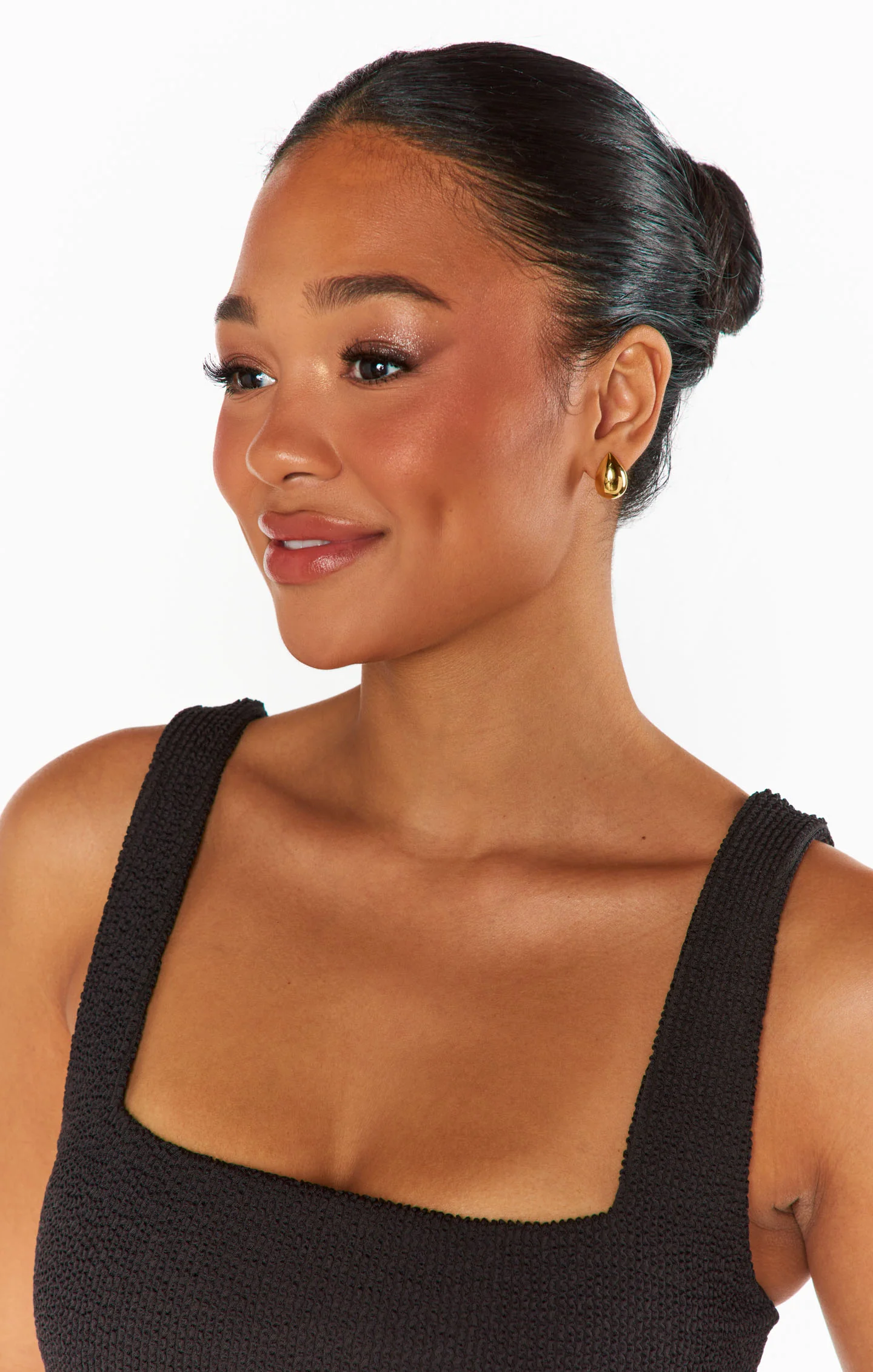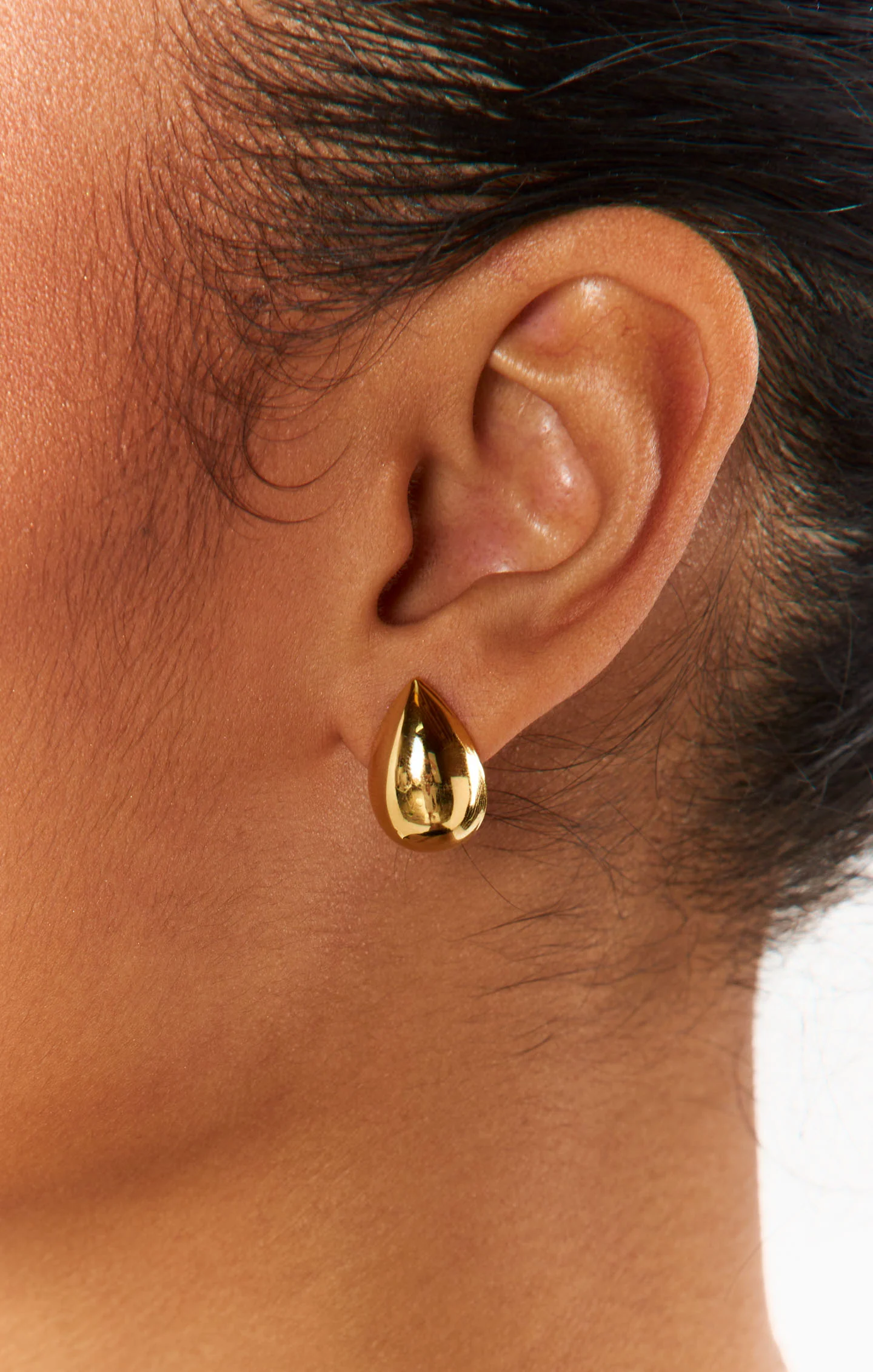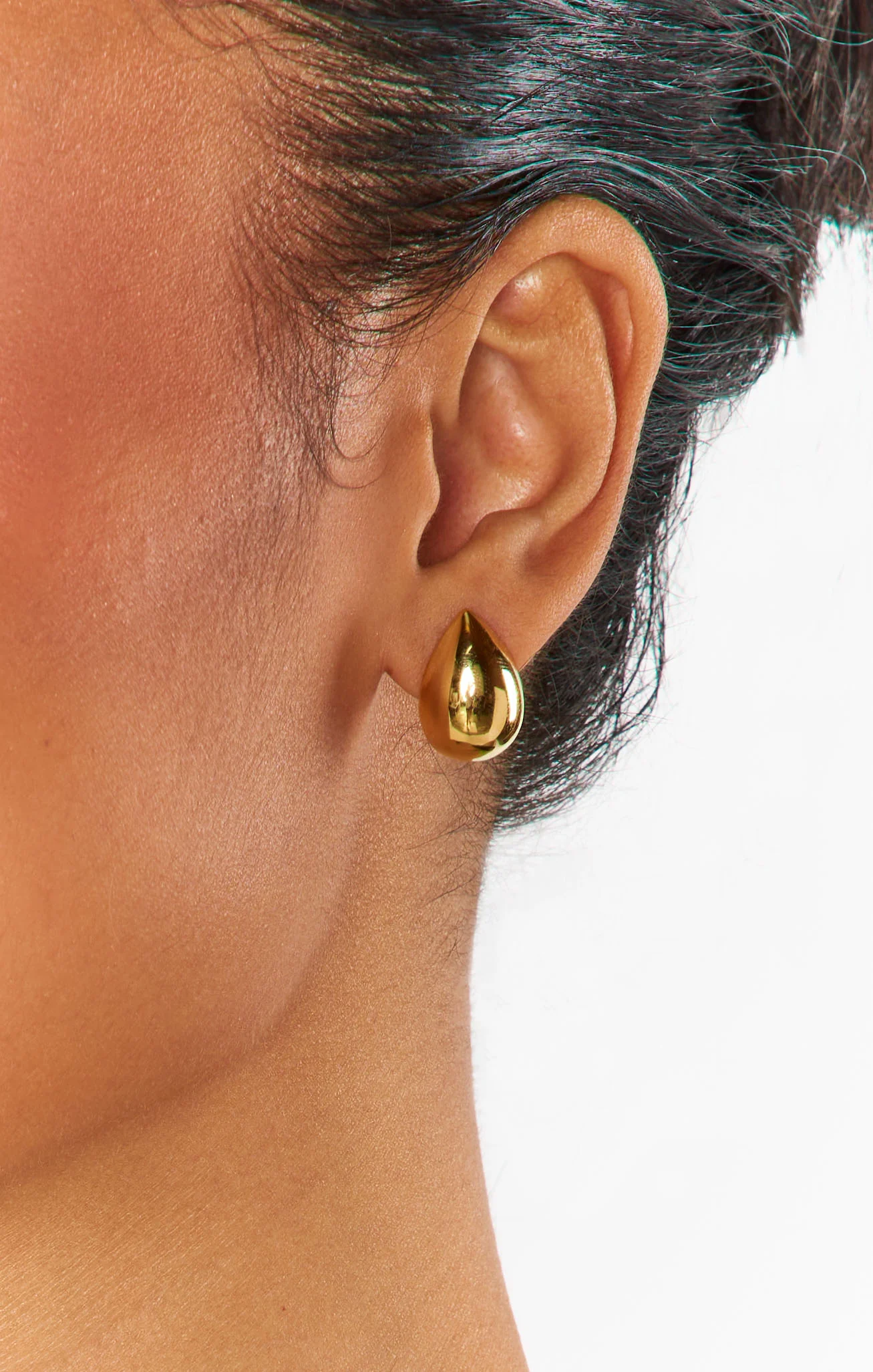 A small teardrop earring with a gold finish, designed to add an elevated touch to any outfit.