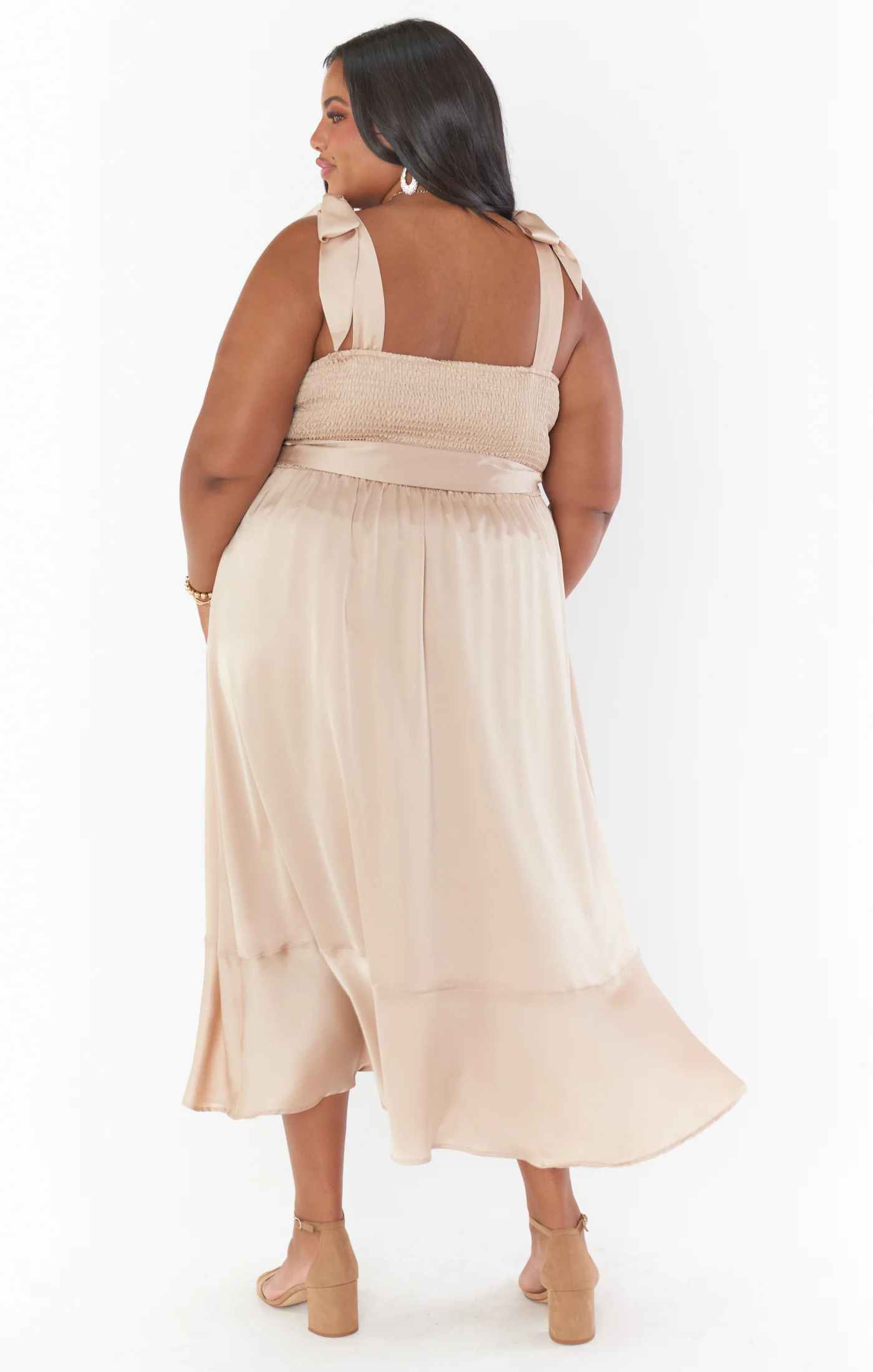 A square neck midi dress with a smocked back, fitted bodice, flowy midi skirt, and side slit. It features a detachable waist sash and detachable bows for straps. The dress is perfect for all your maids or special events.
