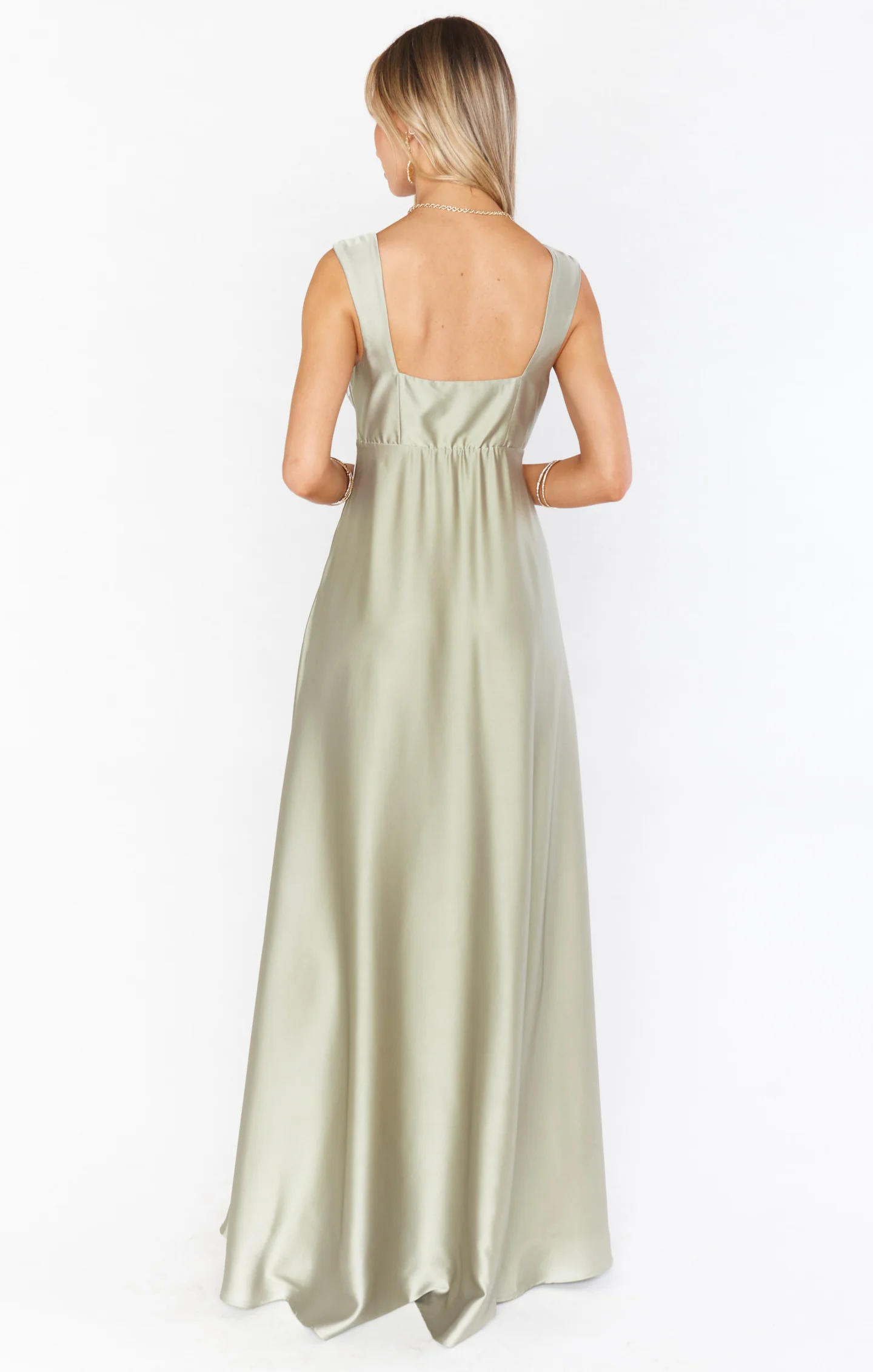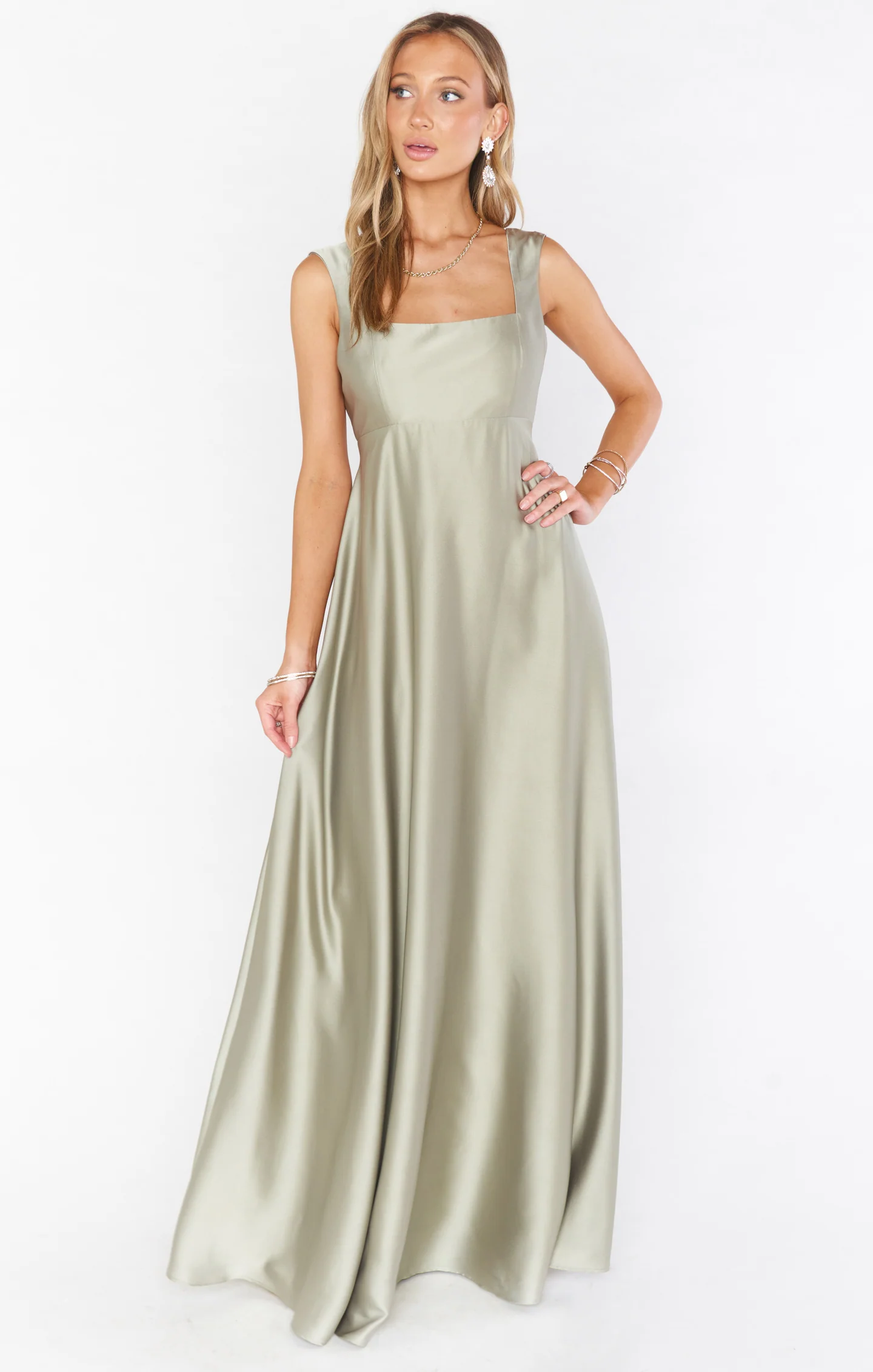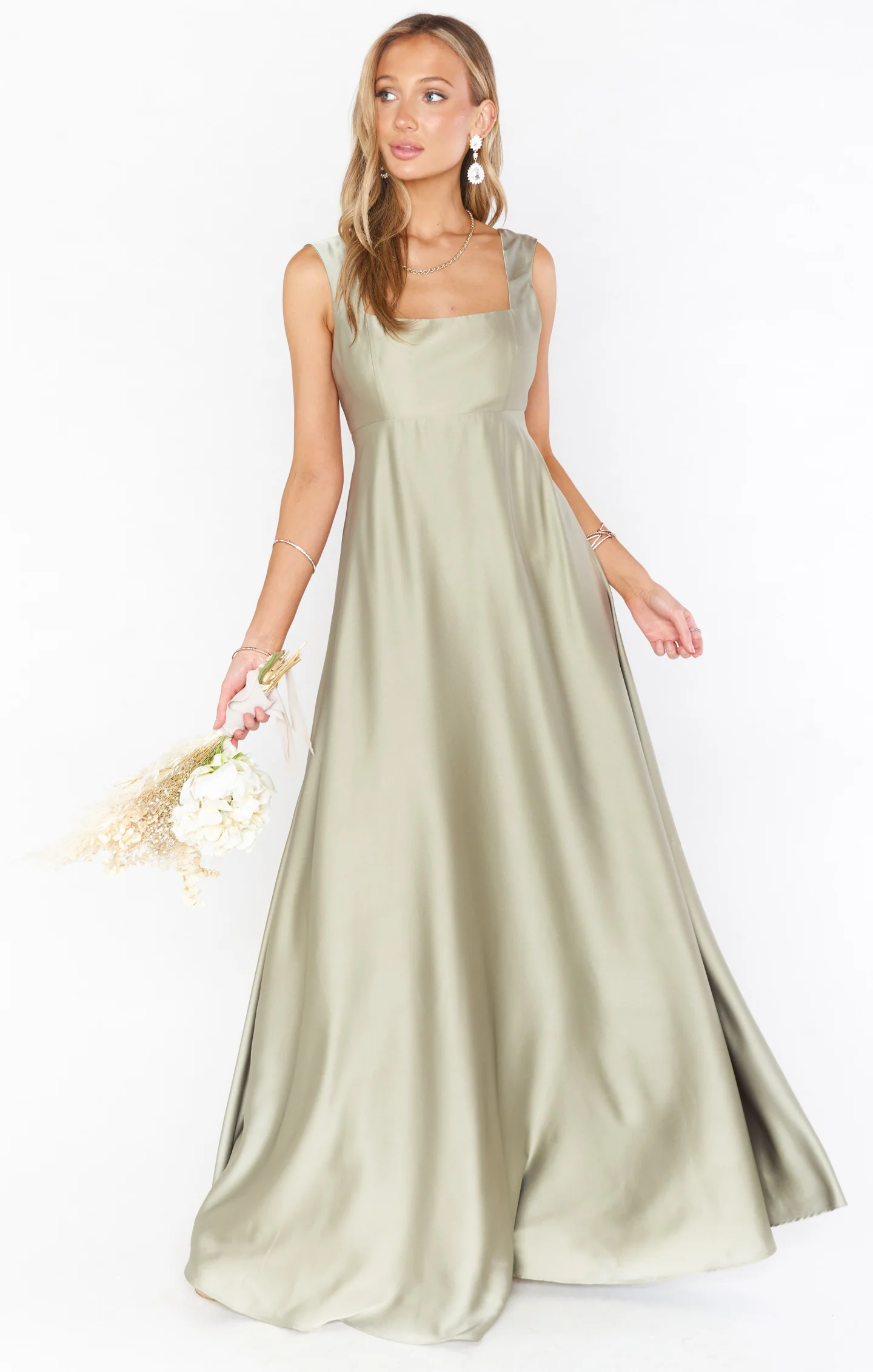 DetailA formal maxi gown with a square neck and thicker strap, designed to be comfortable and timeless for a classic bridal party or ball event.