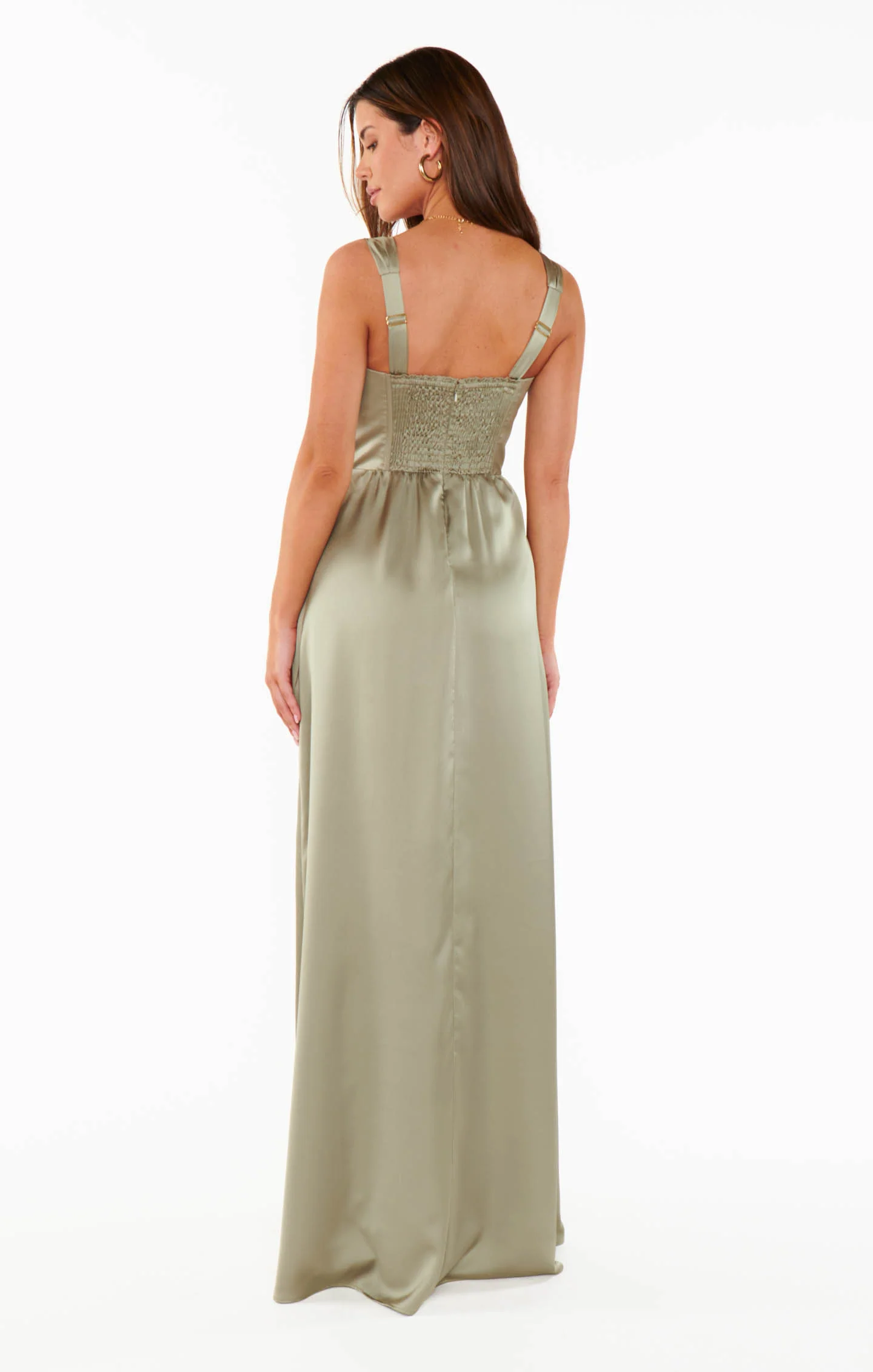 "name": "Nora Maxi Dress ~ Moss Green Luxe Satin