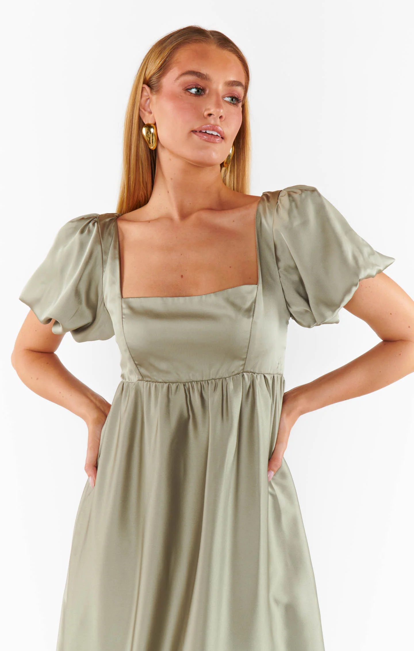 "name": "Nora Maxi Dress ~ Moss Green Luxe Satin
