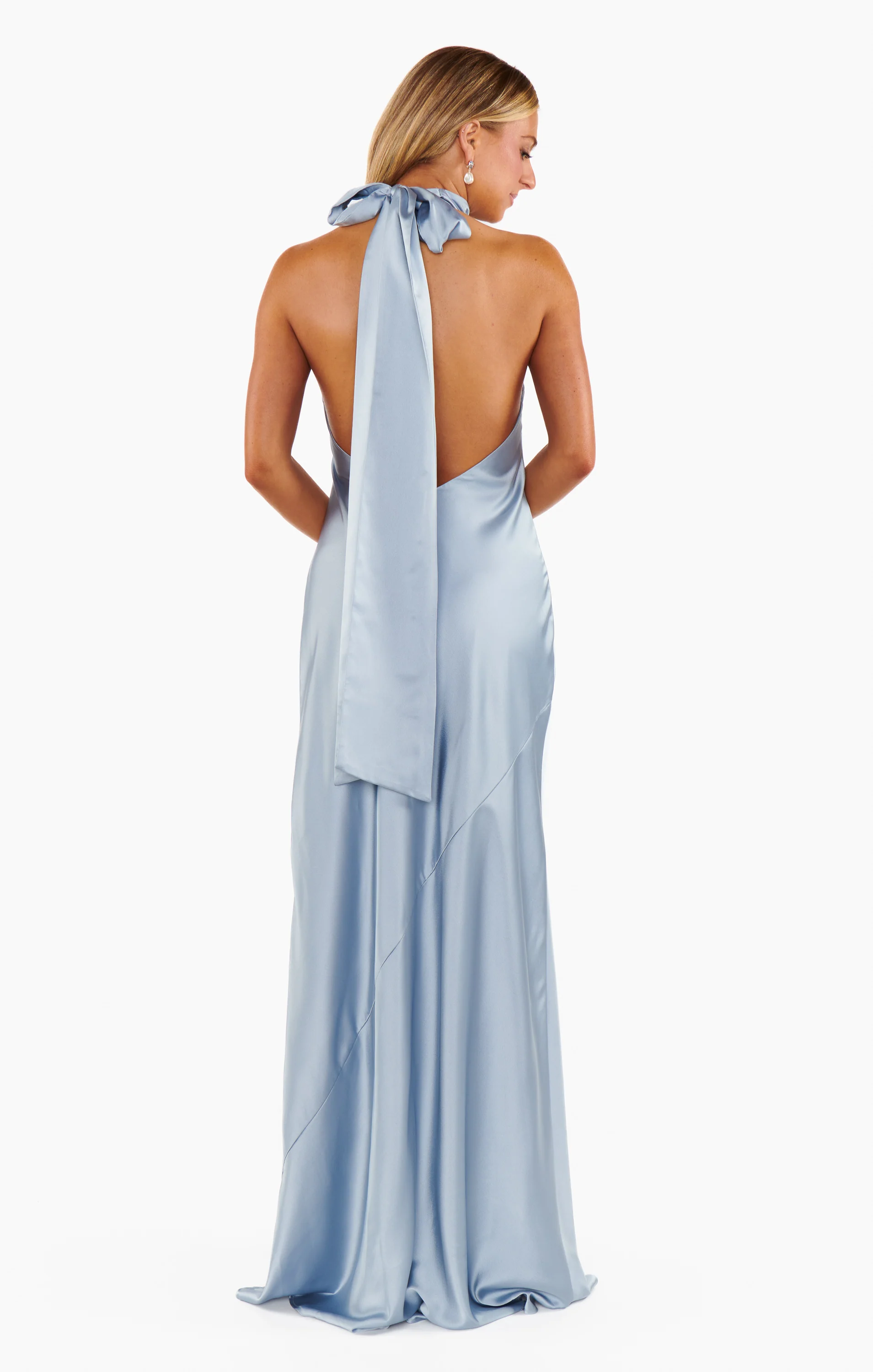 A chic, elegant dress in a soft steel blue color with a luxurious satin fabric. It features a halter neckline, a fluttery scarf tie, and a dreamy mermaid cut to create an hourglass silhouette. The dress adds a touch of enchantment to any event.