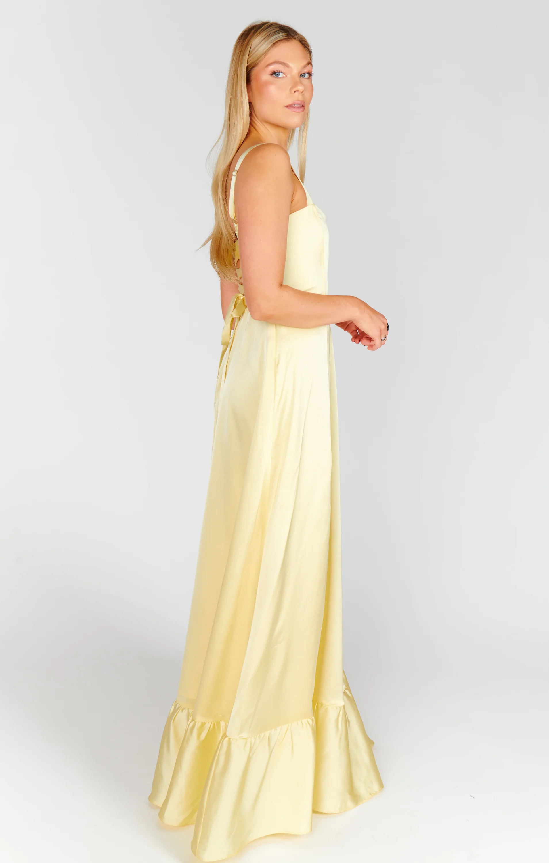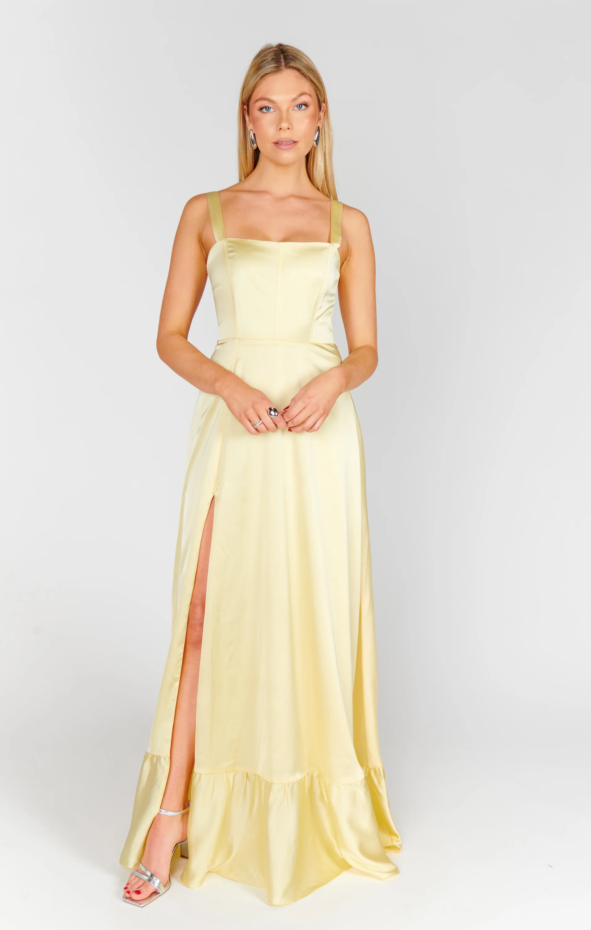 A pale yellow, luxurious satin corset dress with a figure flattering bodice and side slit hem, perfect for romantic settings. Pair it with dainty jewelry and barely there heels to create a stunning look.