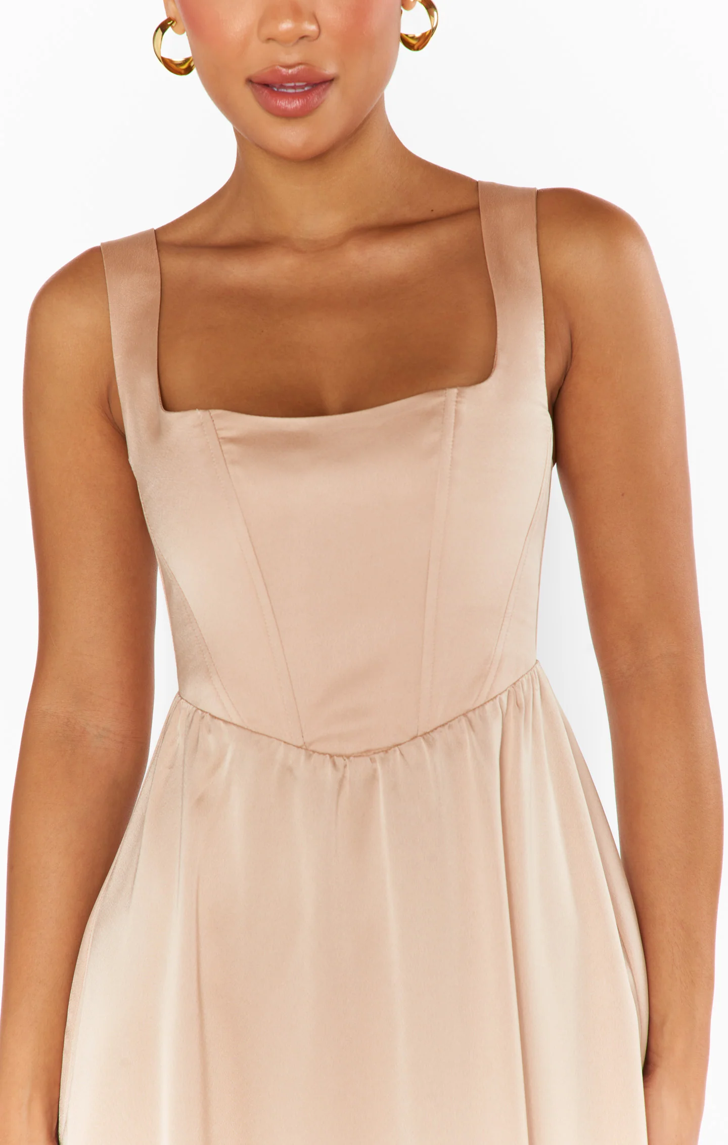 A soft, U-shaped neckline paired with a corset bodice with boning and smocked back for the perfect flattering fit. Style with dainty jewelry and neutral heels.
