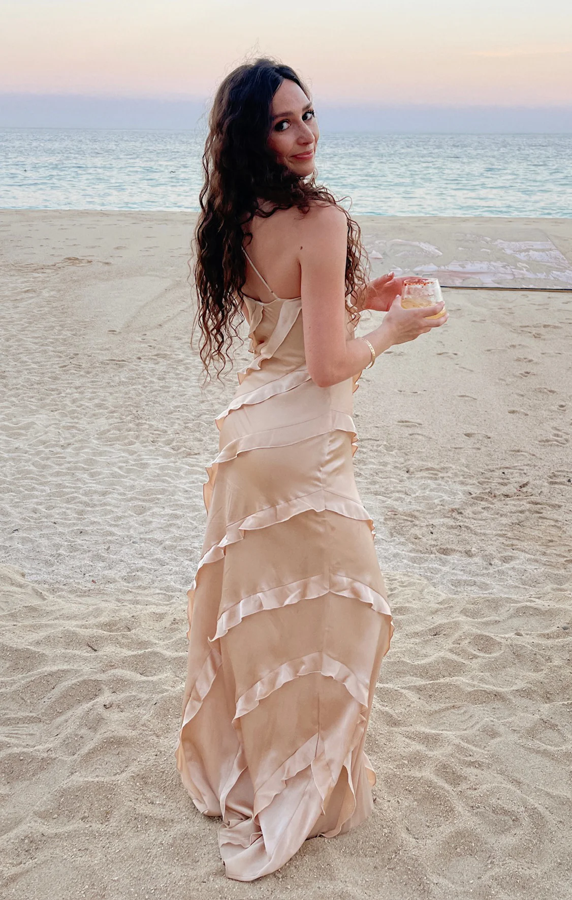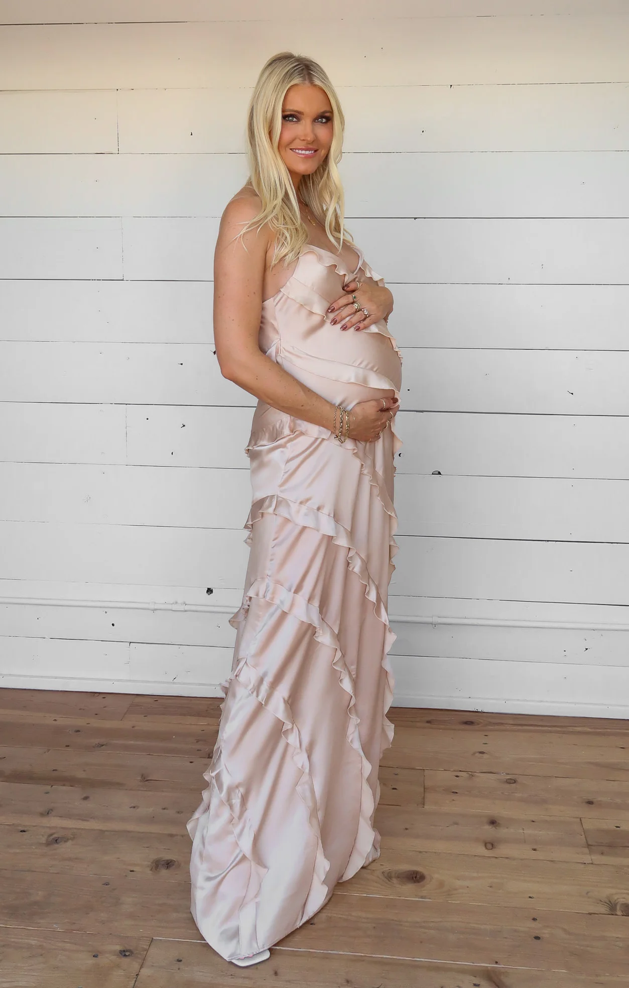 DetailA floor-length slip dress with a ruffle detailing that adds a touch of flirty fun. The design is suitable for formal occasions, whether as a bridesmaid, bride, or guest.