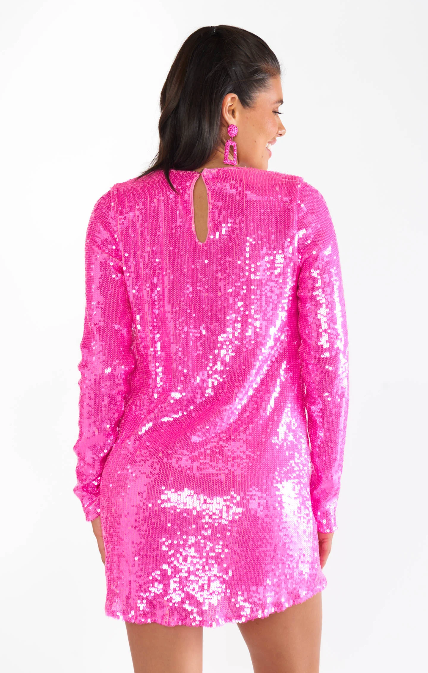A vibrant pink mini dress with long sleeves and sparkly sequins, perfect for a stylish and comfortable look.