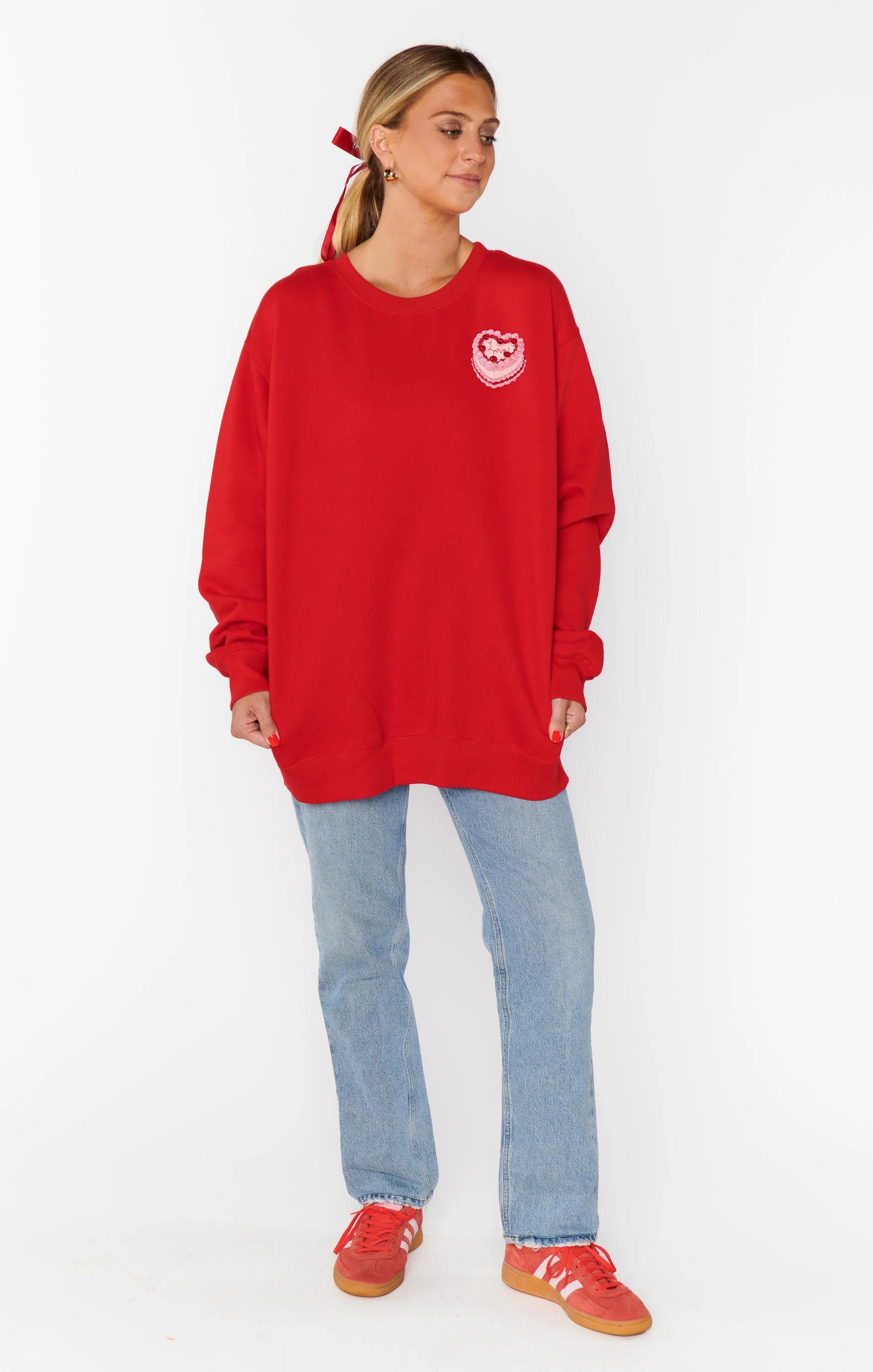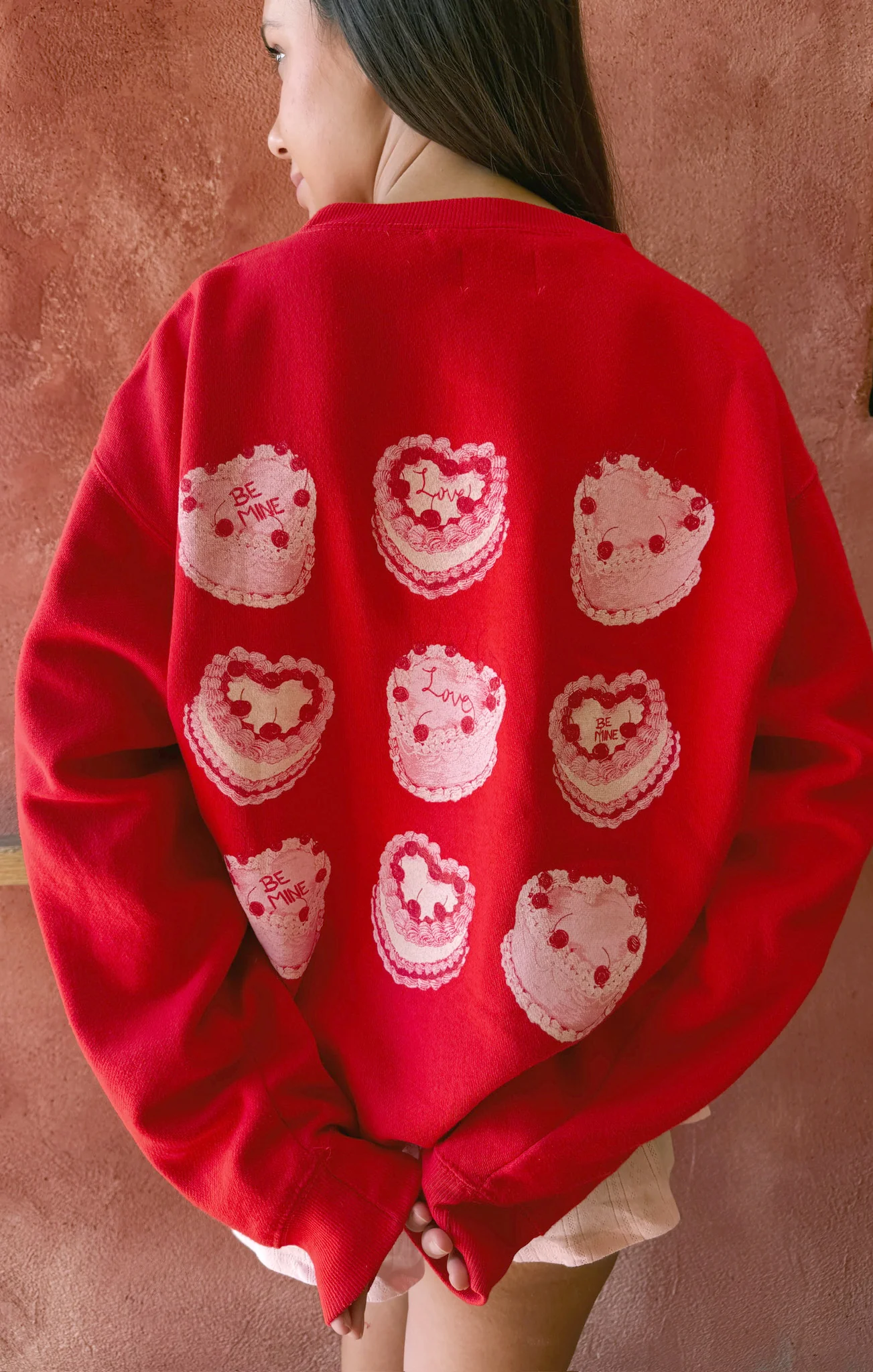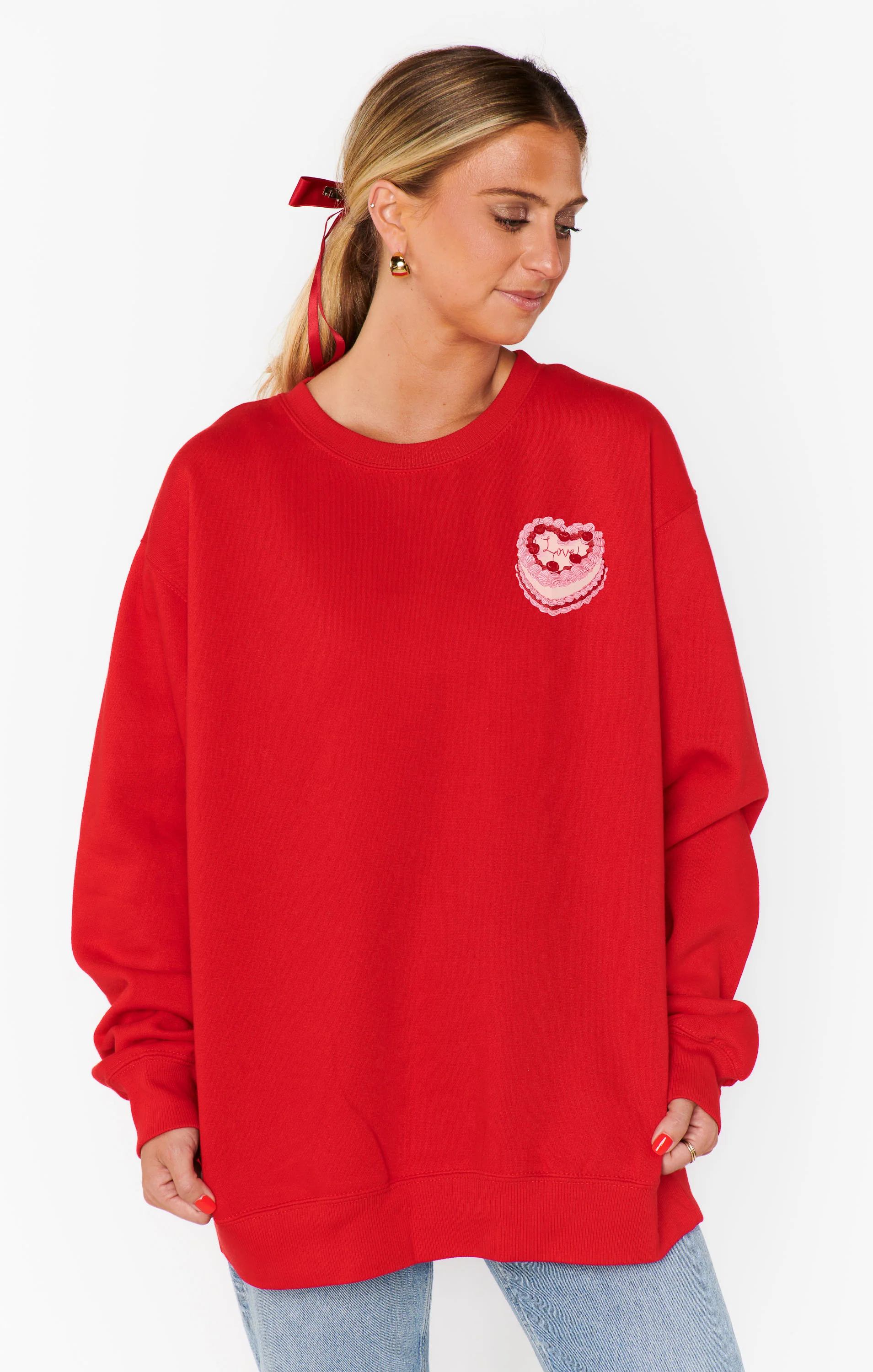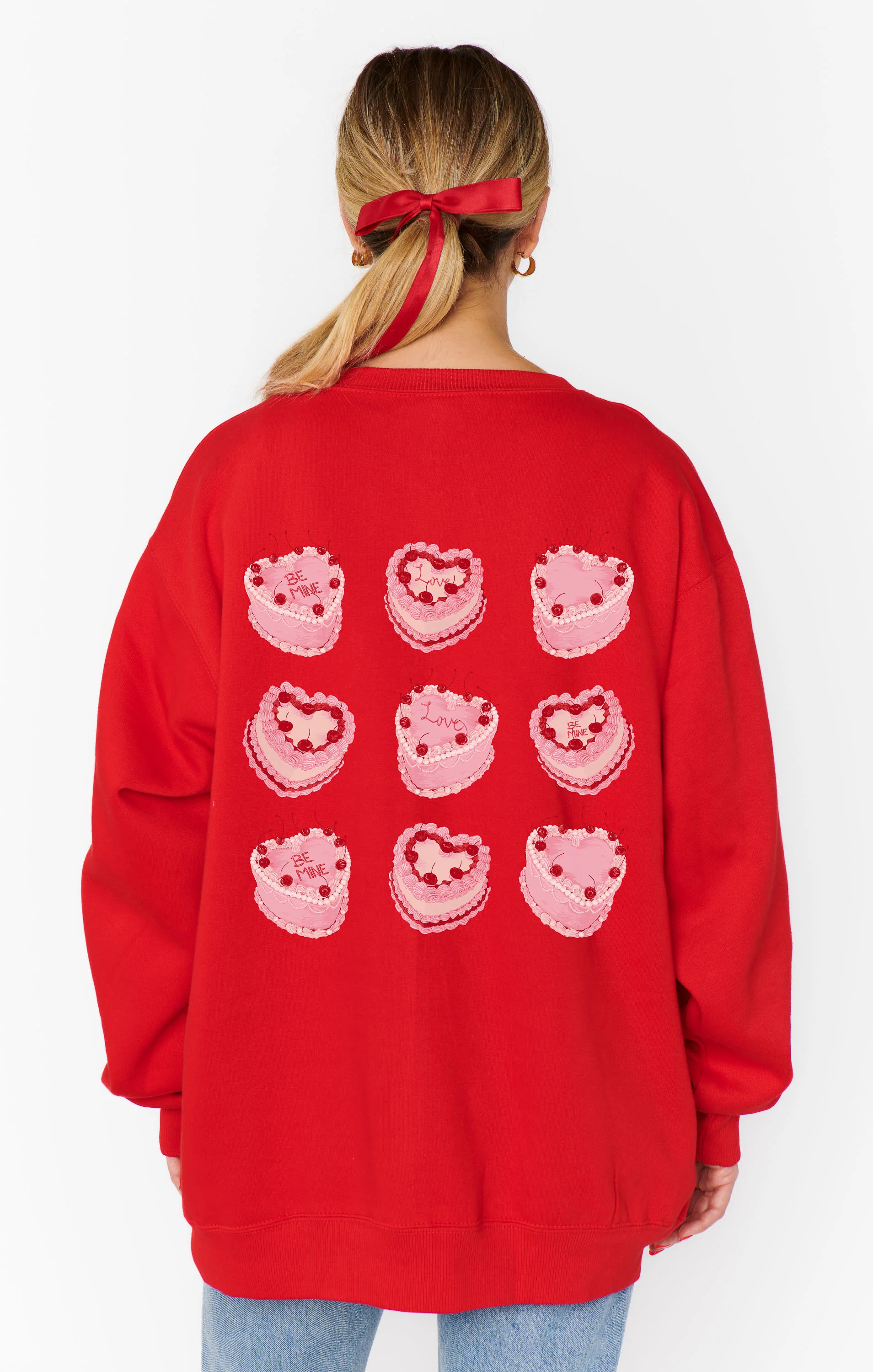 An oversized cake graphic sweatshirt in our classic crew neck cut. An easy throw on outfit for running errands with denim and chunky kicks.
