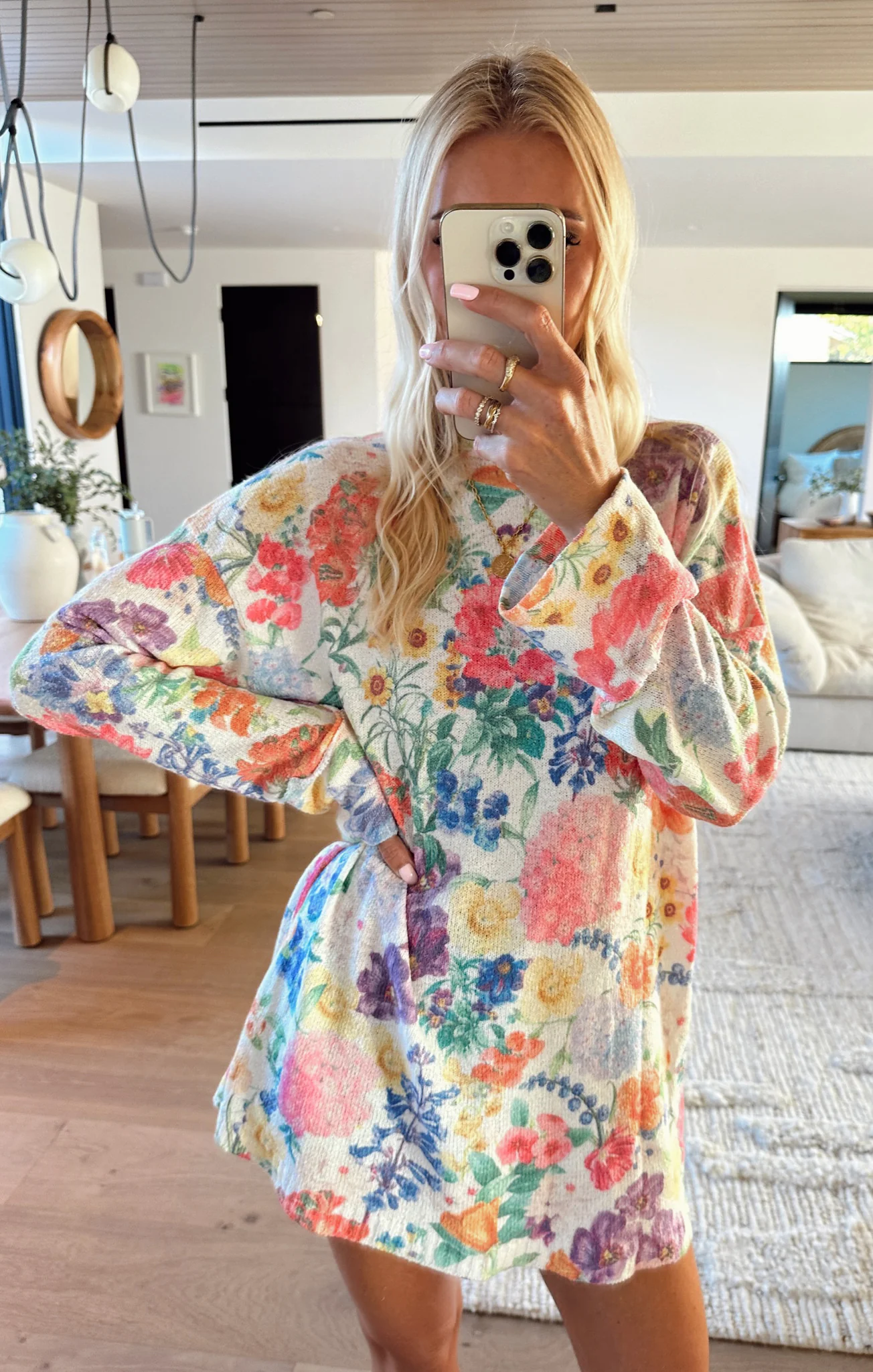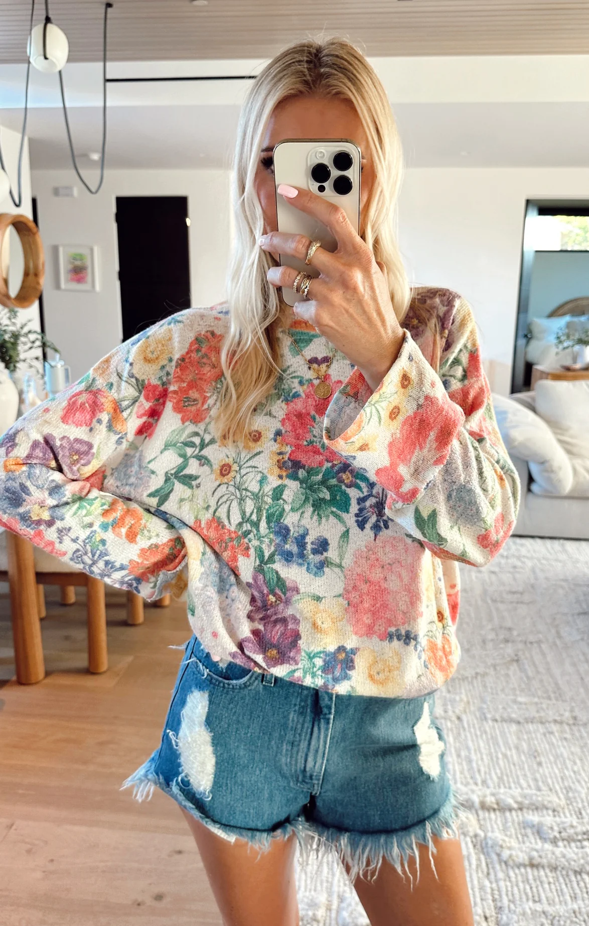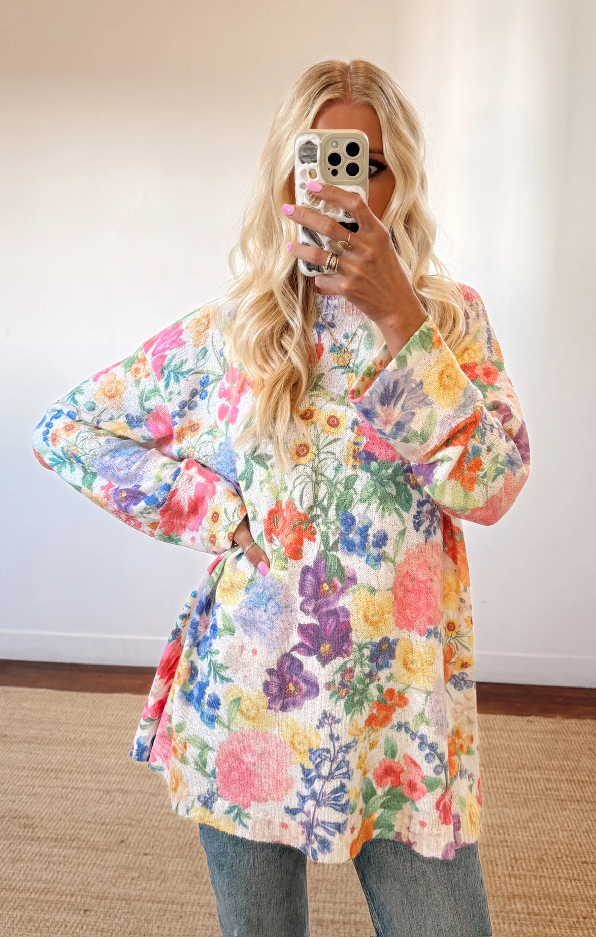 A soft floral tunic in ivory, perfect for spring. Available in a casual look with dark jeans and sneakers.