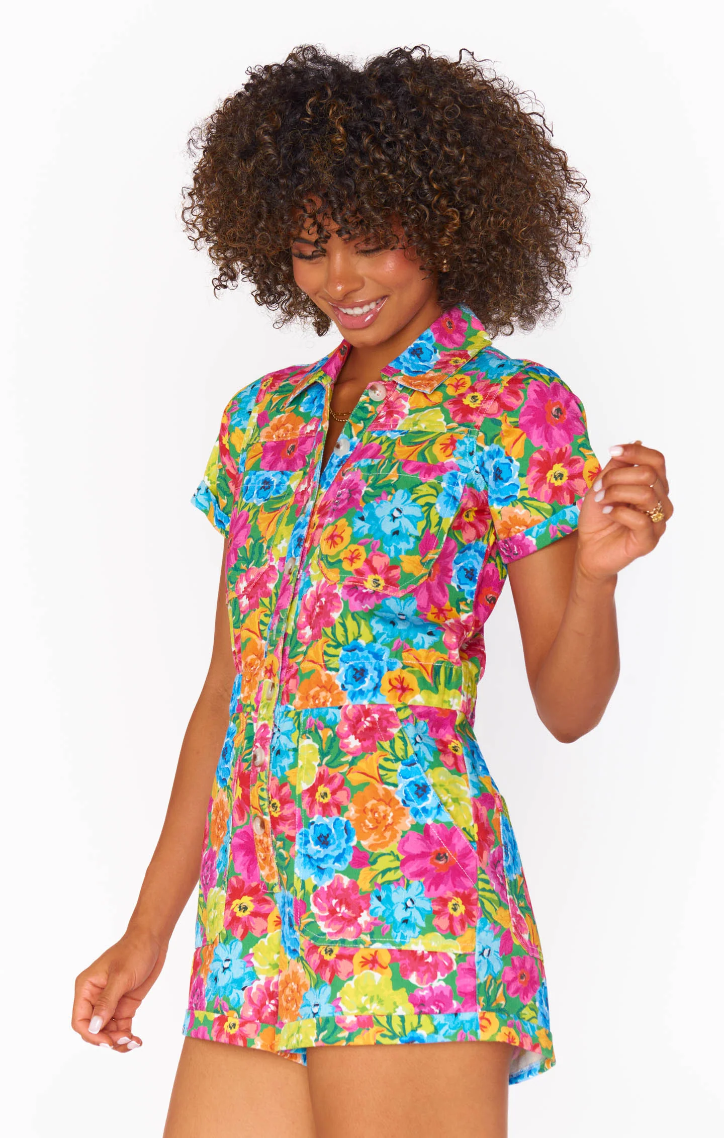 "name": "Cannon Romper ~ Bright Floral Soiree Denim